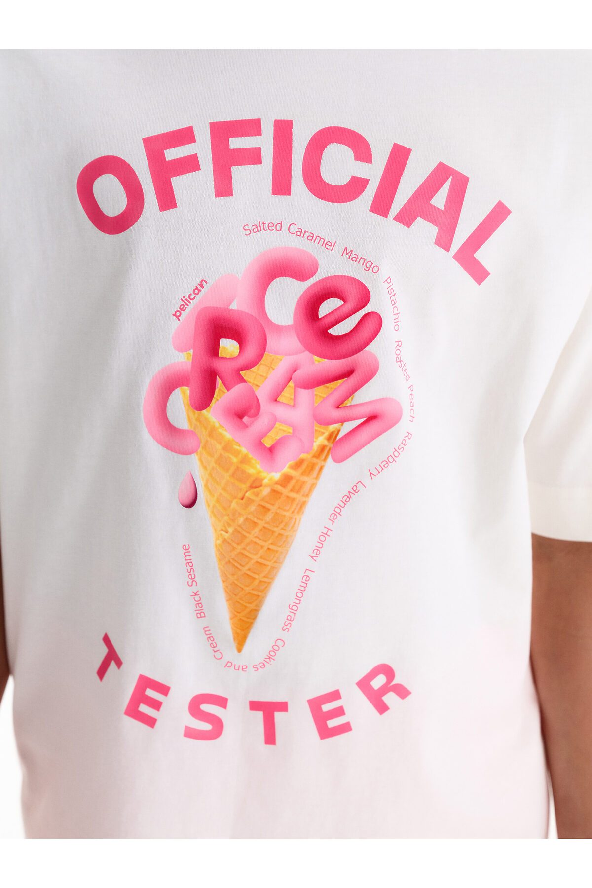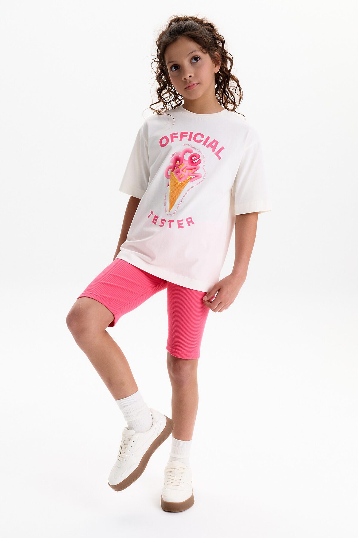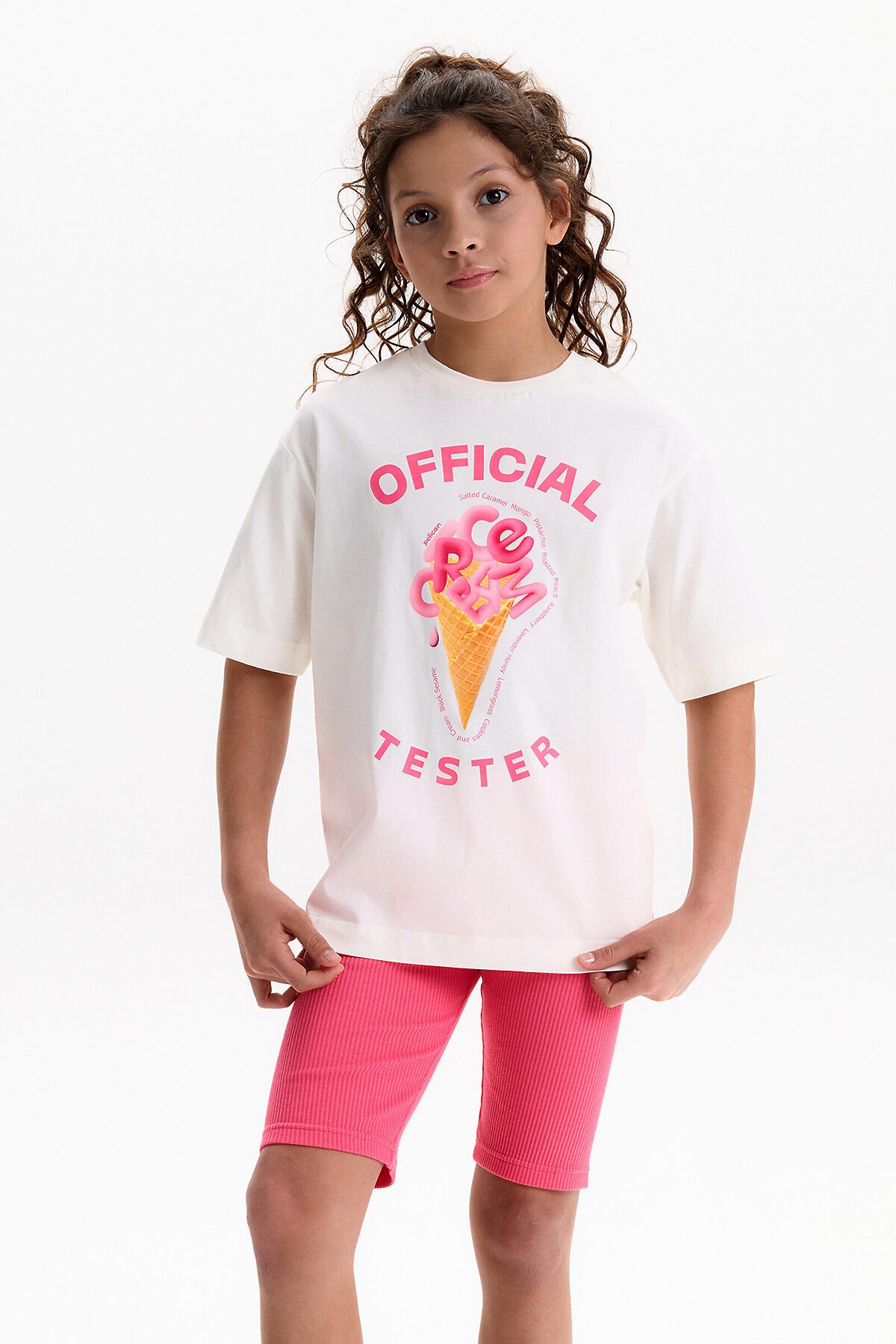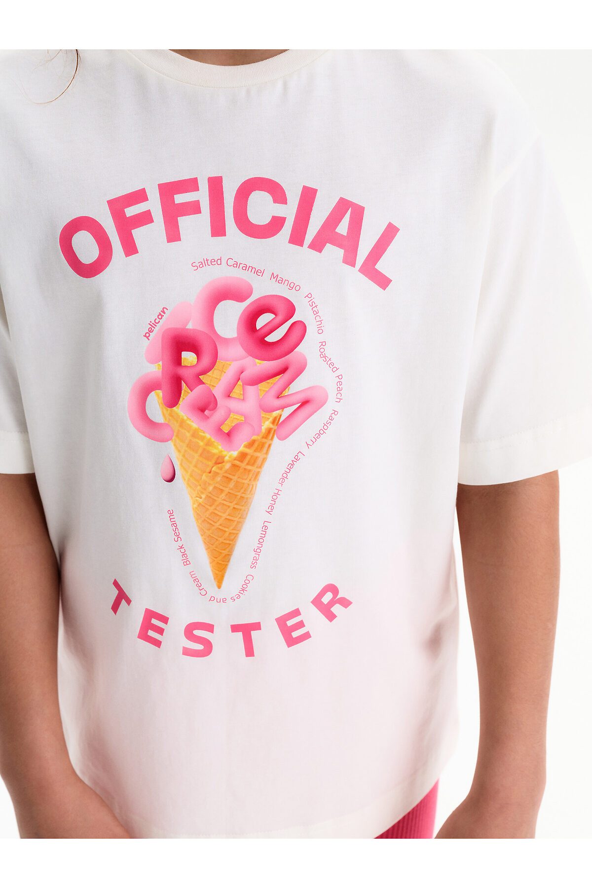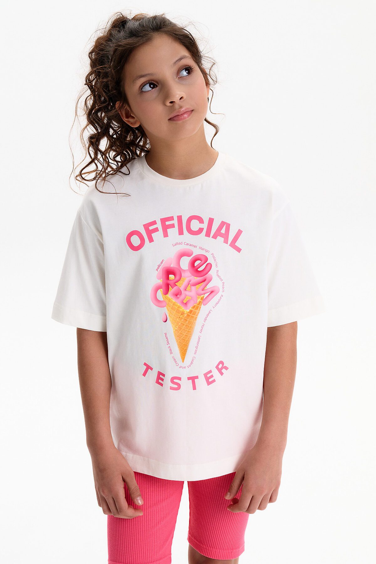 Футболка для девочки умеренного объема. Выполнена из 100% хлопка. Эластичная рибана на вырезе горловины гарантирует, что футболка будет легко надеваться и сниматься, не теряя при этом своей формы. Перевод: официальный тестировщик мороженого.