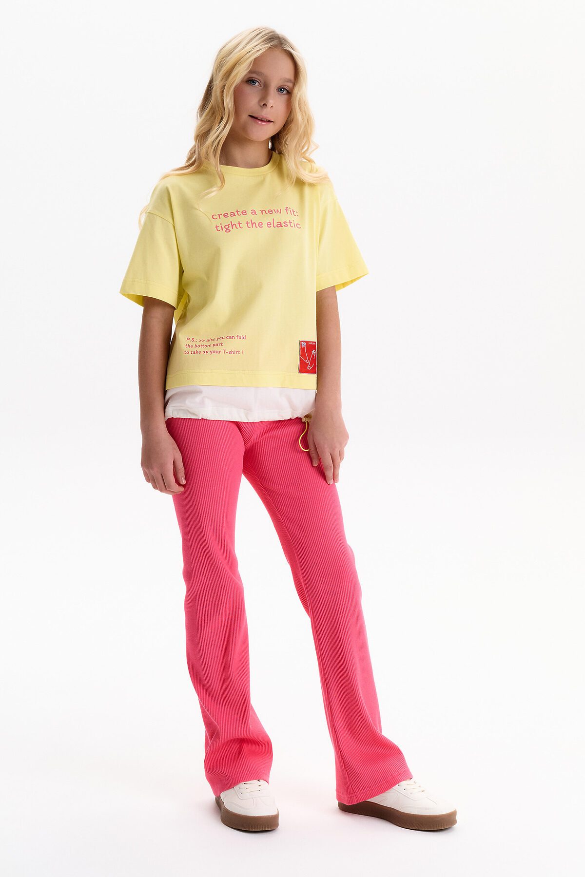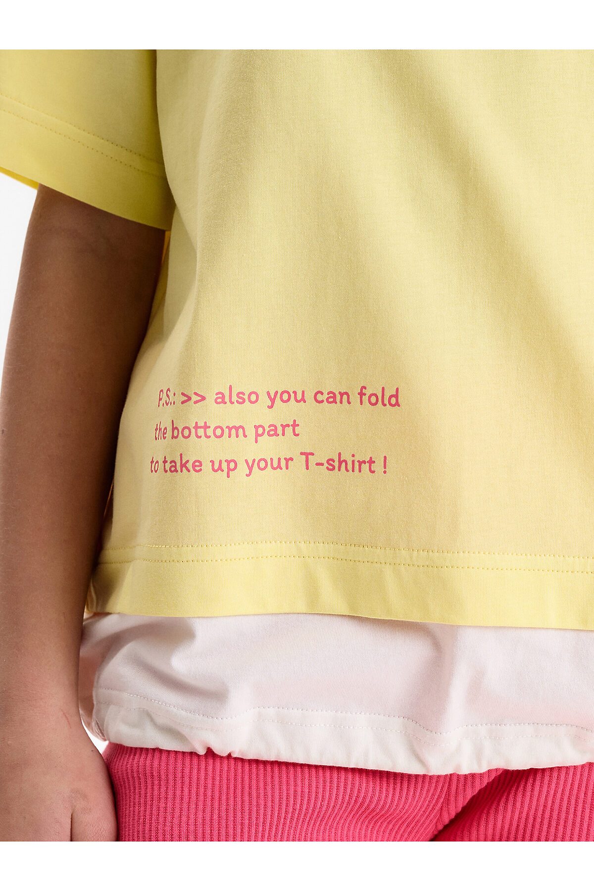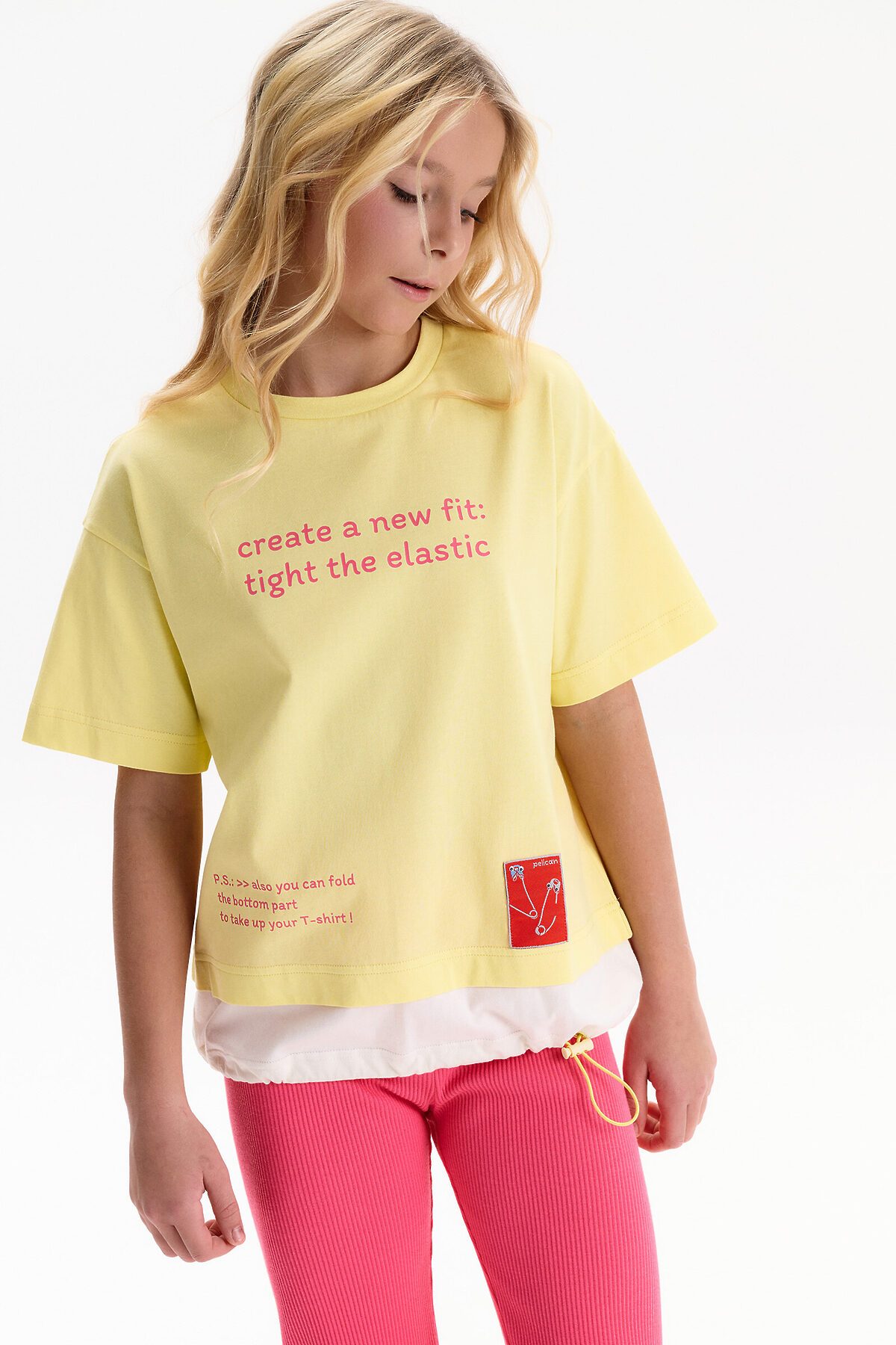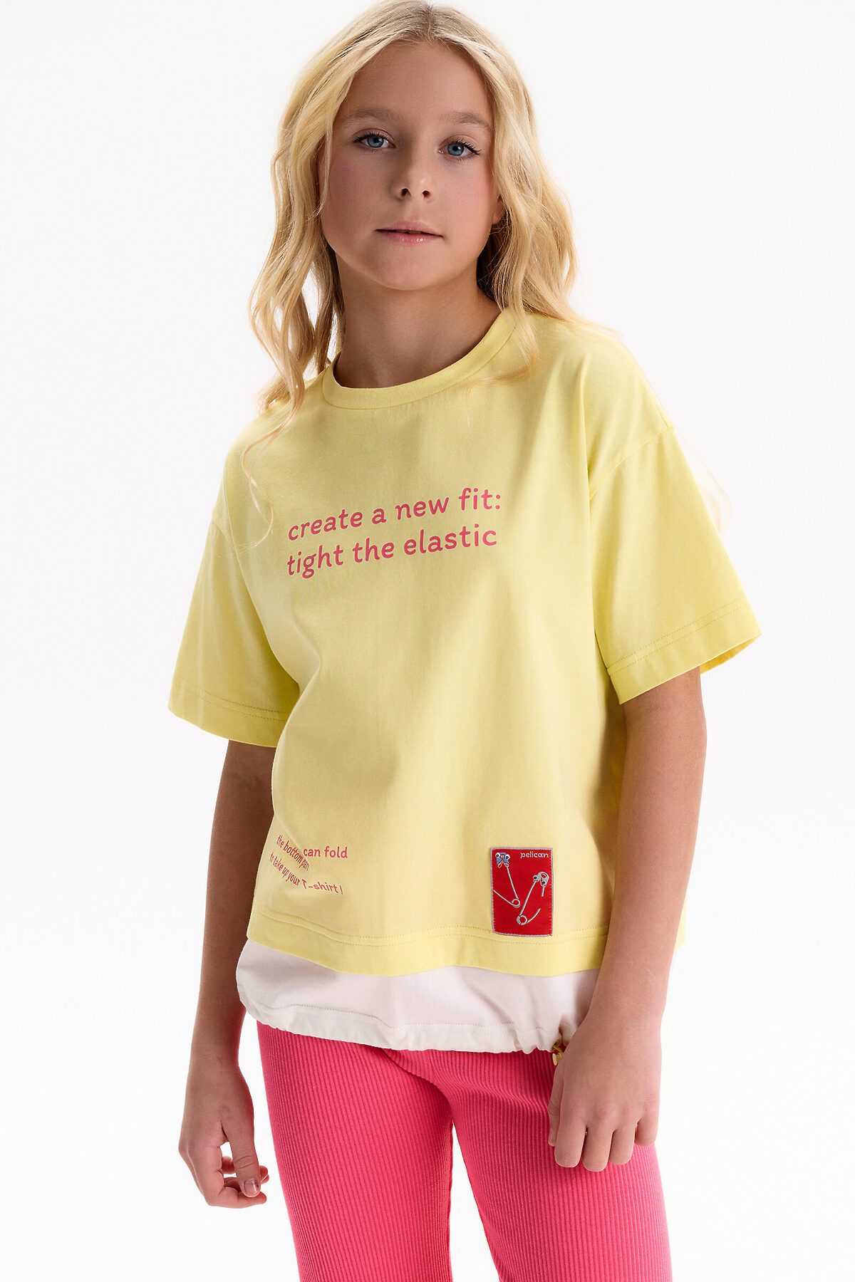 Футболка-трансформер для девочки oversize. Модель свободного кроя, средней длины. Выполнена из 100% хлопка. Плечо спущено, посадка комфортная. Эластичная рибана на вырезе горловины гарантирует, что футболка будет легко надеваться и сниматься, не теряя при этом своей формы. Главная особенность — низ-трансформер: конструкция создаёт эффект, будто поверх надета вторая футболка. Внутри по низу — утяжка со стоппером: при затяжке нижняя часть заправляется внутрь, и модель выглядит как укороченная однослойная футболка. Перевод: потяни и создай новый силуэт! Также ты можешь подогнуть низ чтобы укоротить топ!