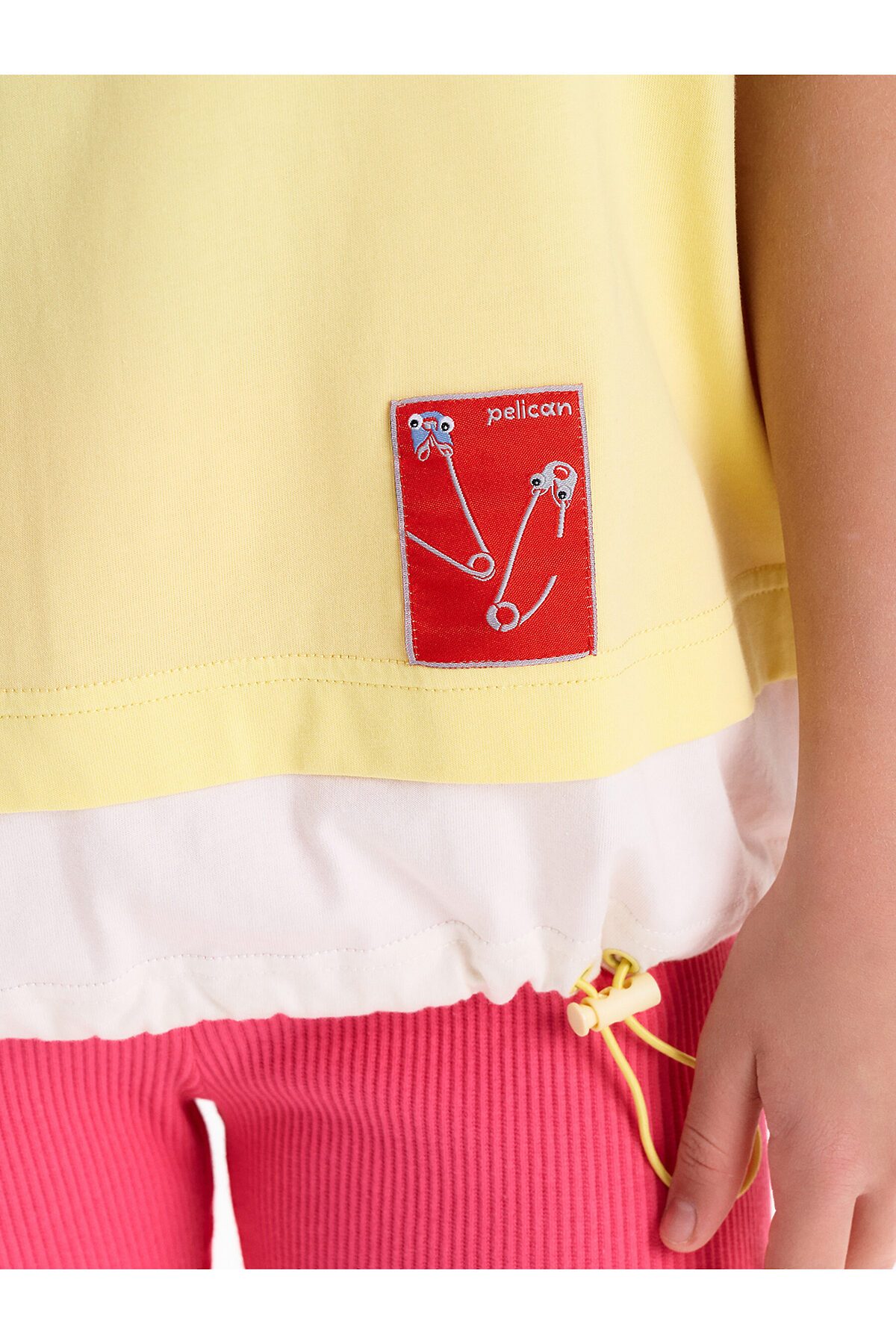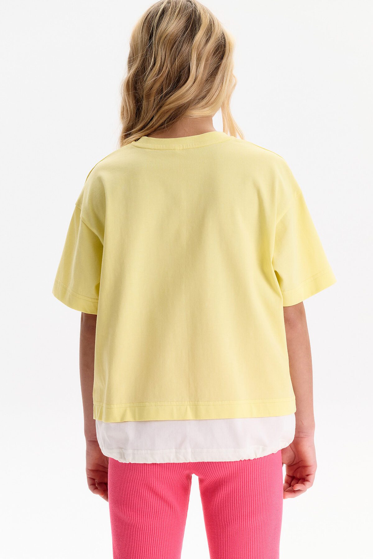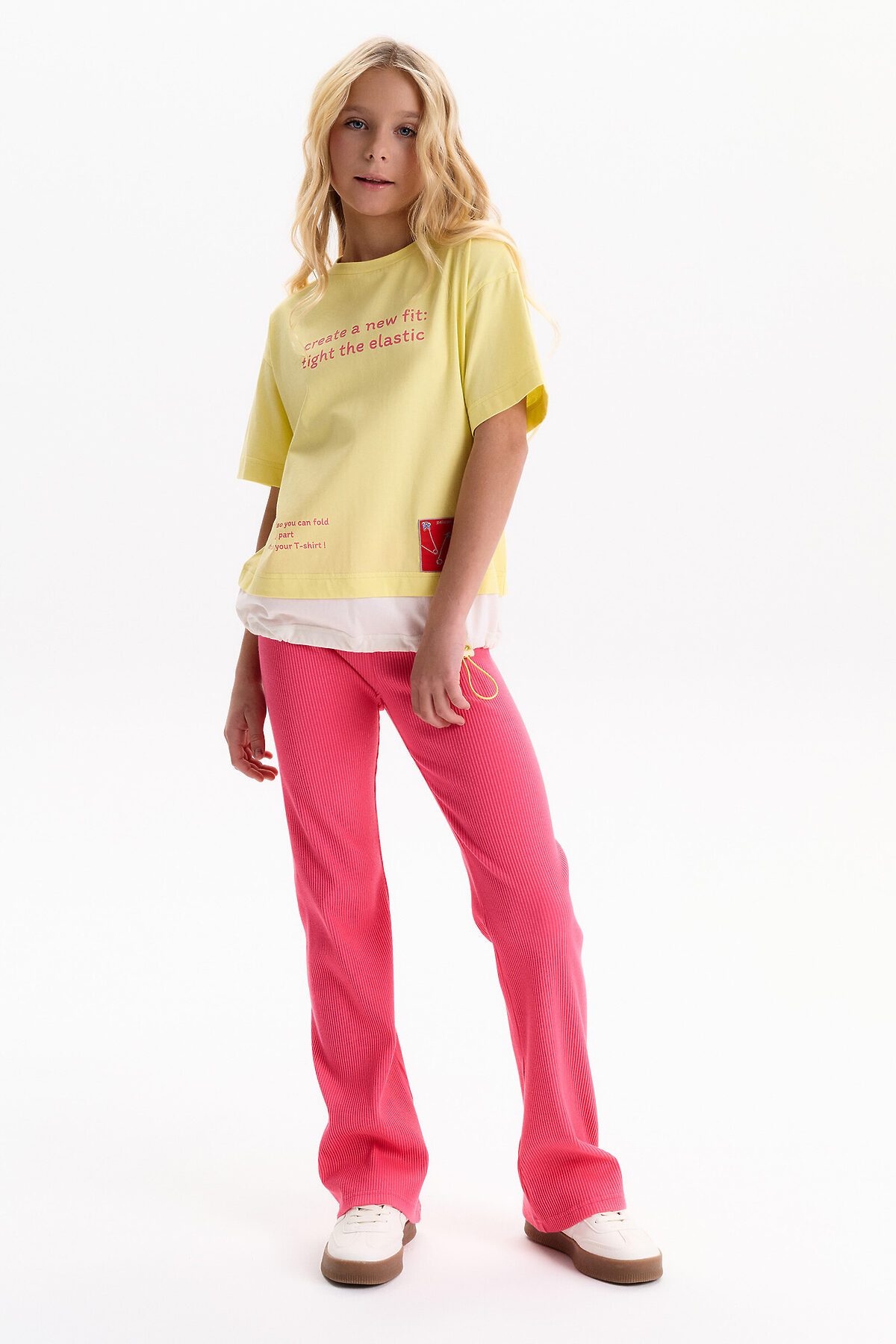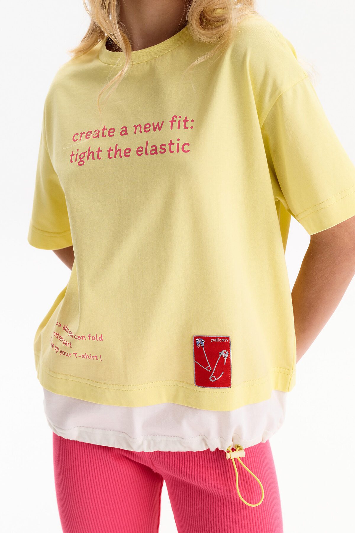 Футболка-трансформер для девочки oversize. Модель свободного кроя, средней длины. Выполнена из 100% хлопка. Плечо спущено, посадка комфортная. Эластичная рибана на вырезе горловины гарантирует, что футболка будет легко надеваться и сниматься, не теряя при этом своей формы. Главная особенность — низ-трансформер: конструкция создаёт эффект, будто поверх надета вторая футболка. Внутри по низу — утяжка со стоппером: при затяжке нижняя часть заправляется внутрь, и модель выглядит как укороченная однослойная футболка. Перевод: потяни и создай новый силуэт! Также ты можешь подогнуть низ чтобы укоротить топ!