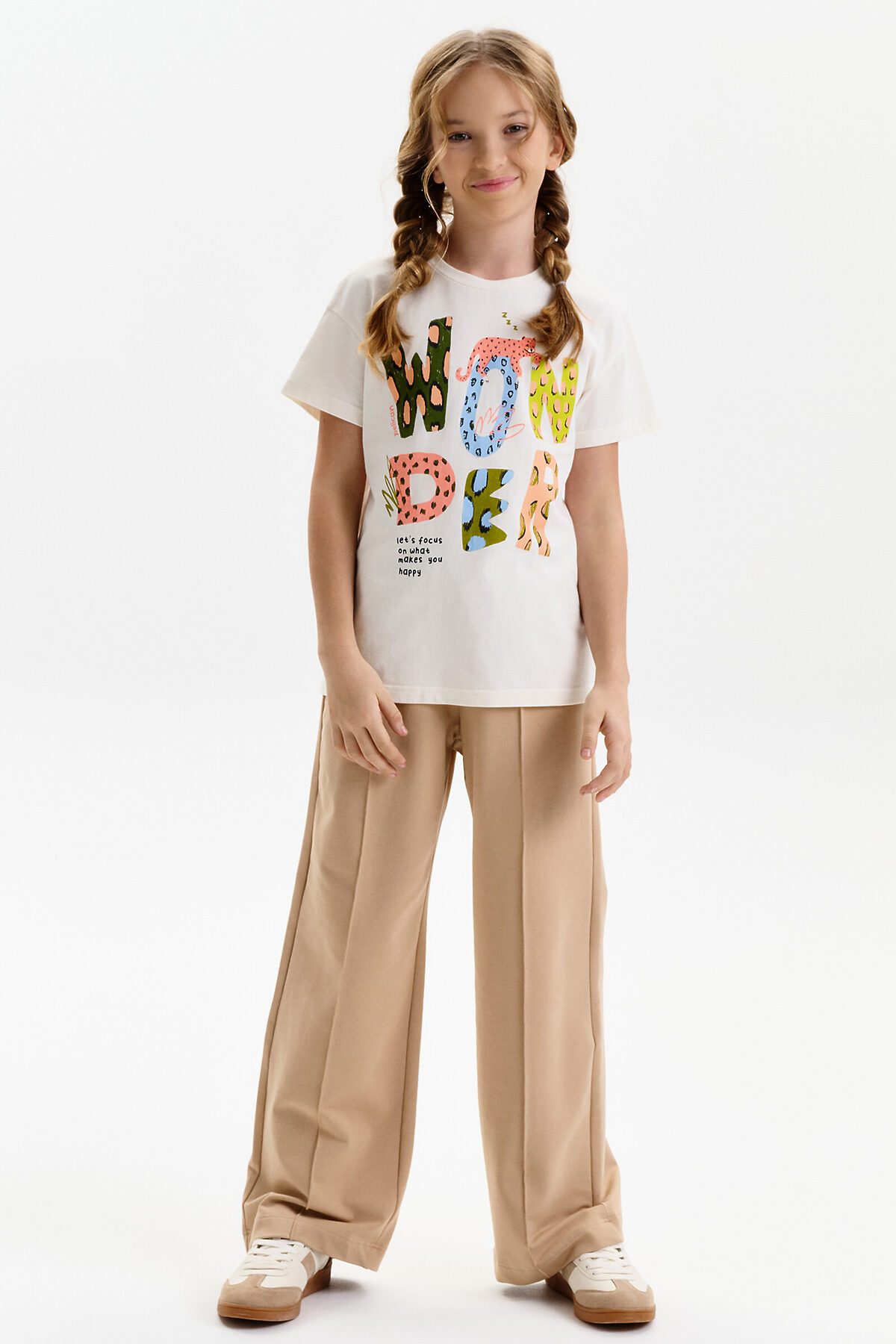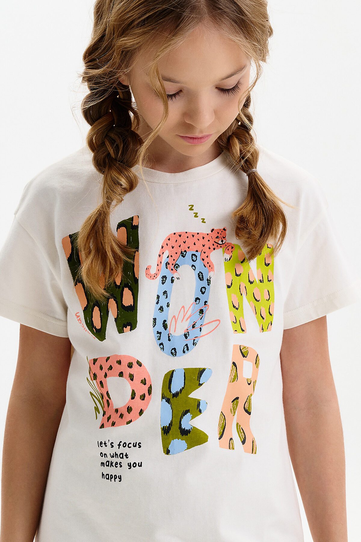 Футболка для девочки маленького объема. Выполнена из 100% хлопка. Эластичная рибана на вырезе горловины гарантирует, что футболка будет легко надеваться и сниматься, не теряя при этом своей формы. Перевод: ЧУДО: ДАВАЙ СОСРЕДОТОЧИМСЯ НА ТОМ ЧТО ДЕЛАЕТ ТЕБЯ СЧАСТЛИВЫМ.