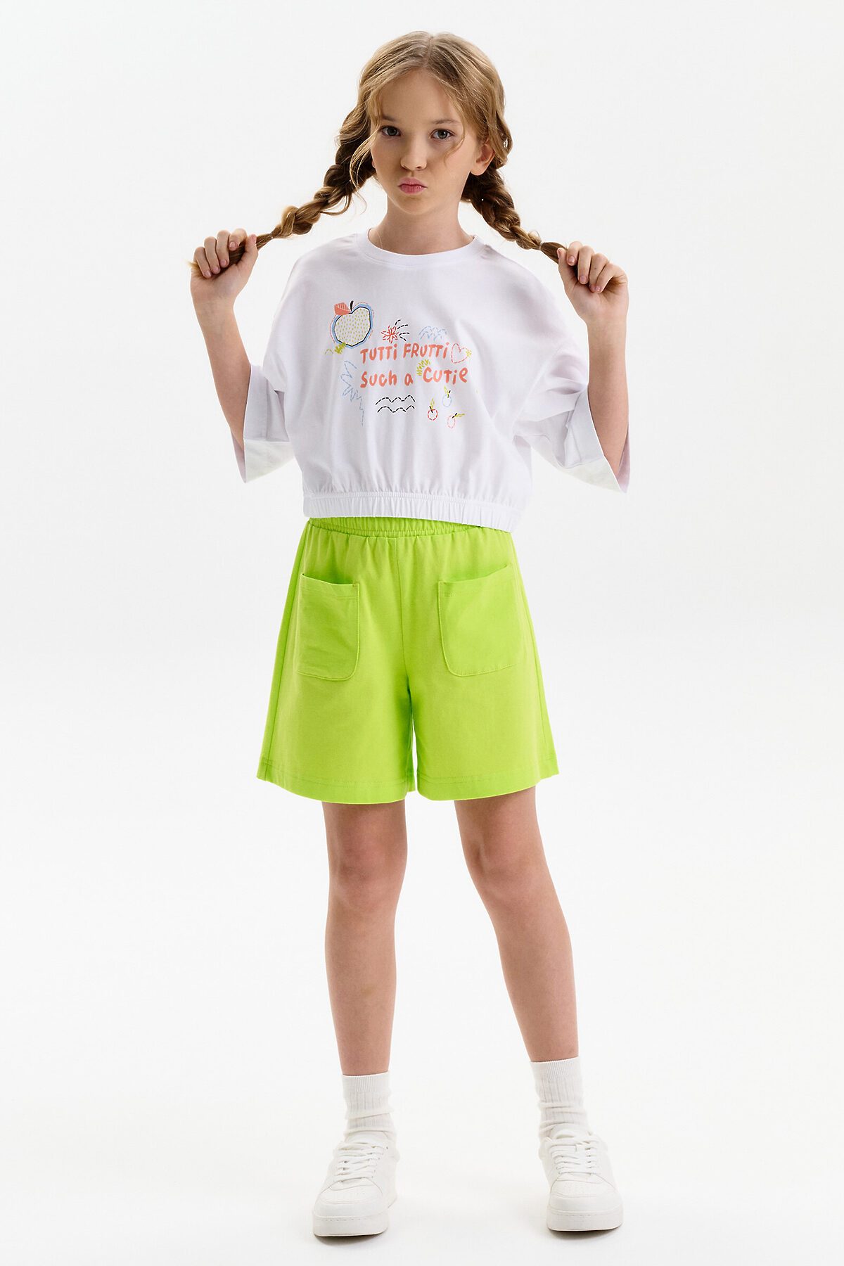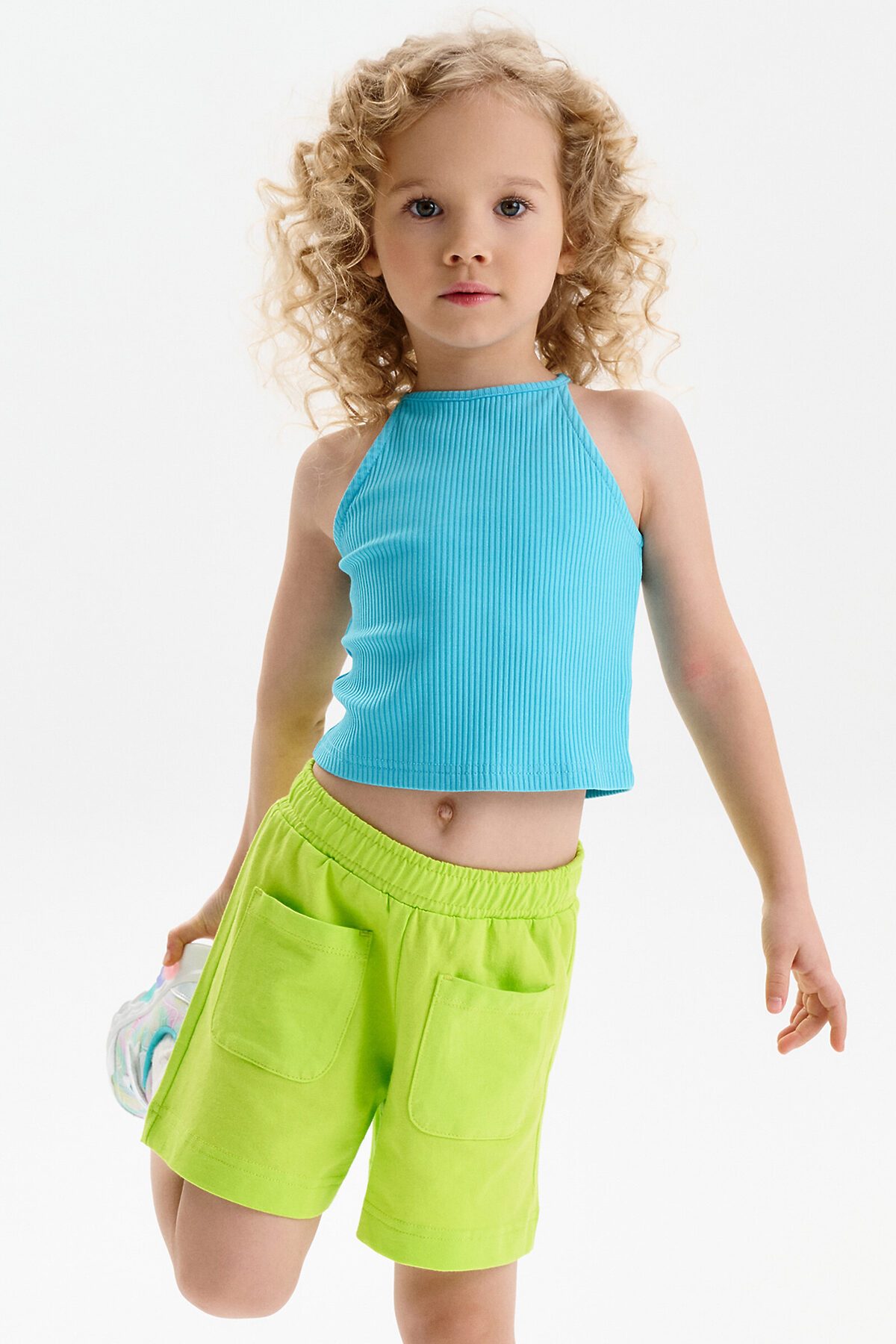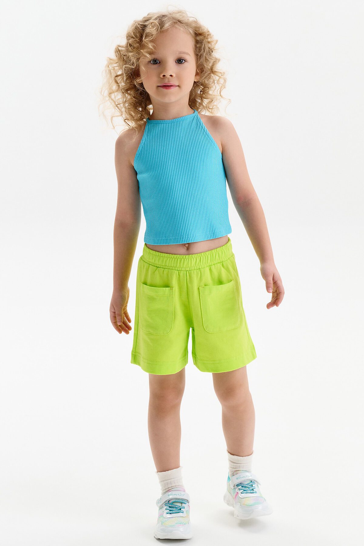Шорты трикотажные для девочек из 100% хлопка. Длина уменьшена до середины бедра по сравнению с коллекцией Лето 25. Шорты с поясом на широком простроченном эластике и дополнительной шнуровкой обеспечивают идеальную посадку и регулировку по размеру.По переду два накладных кармана.