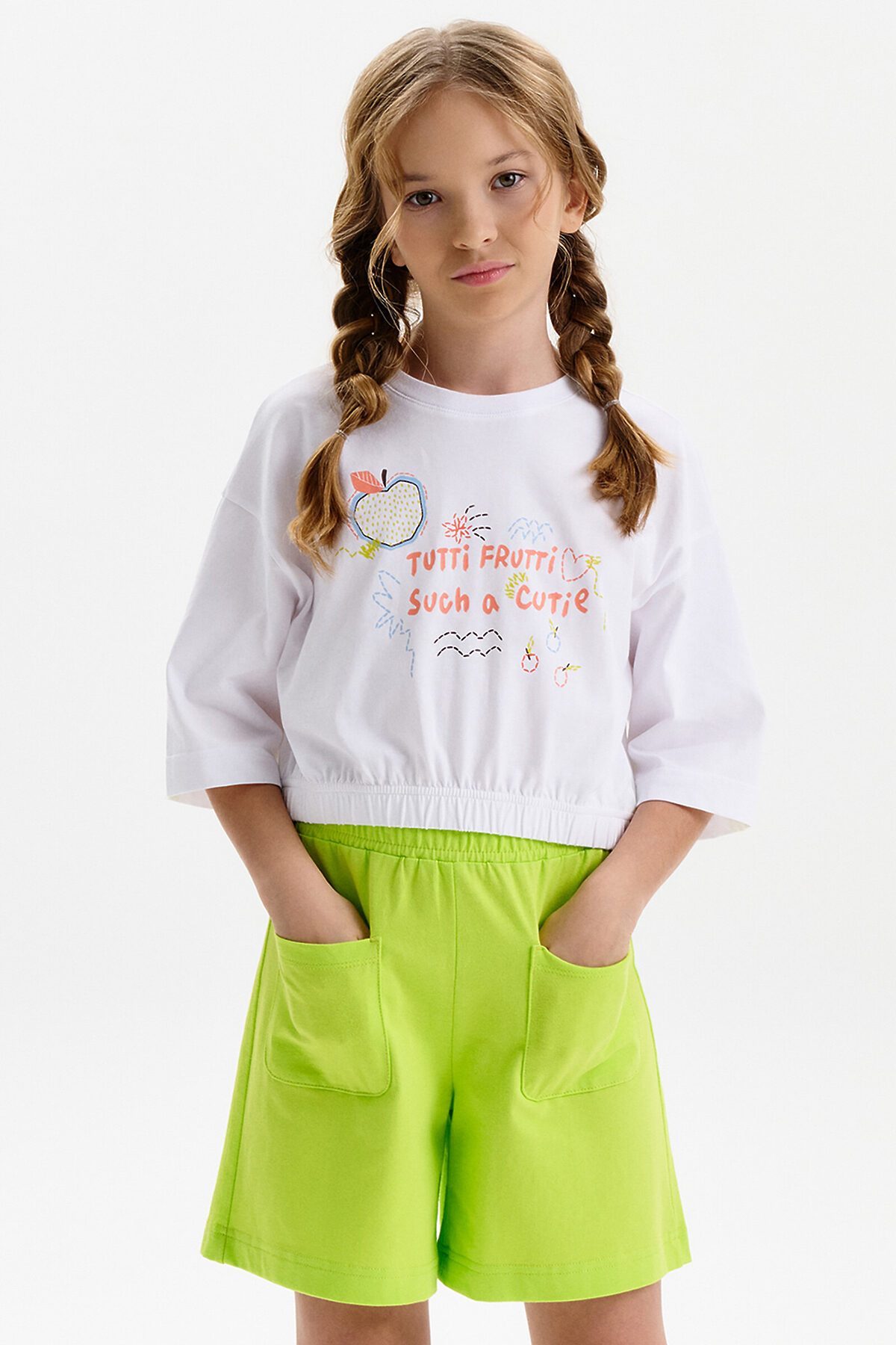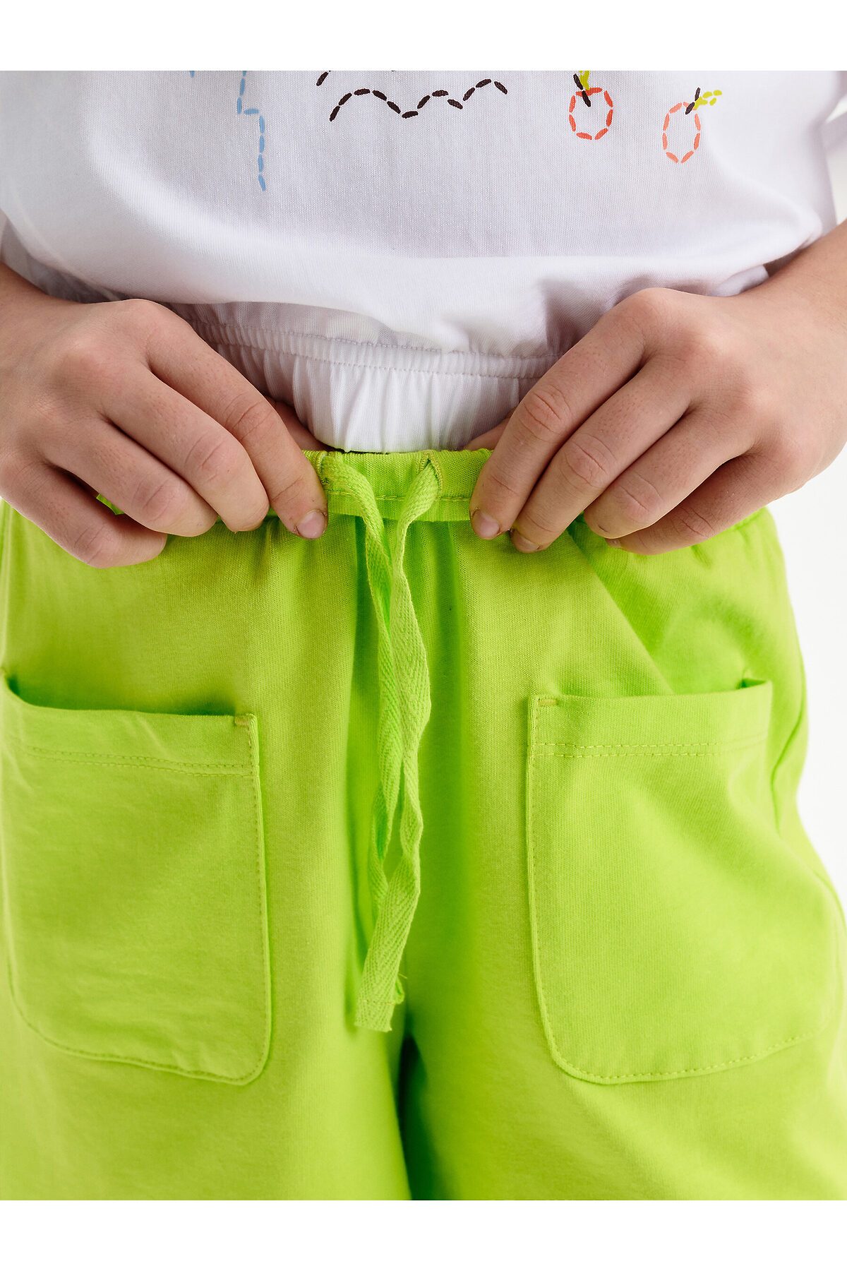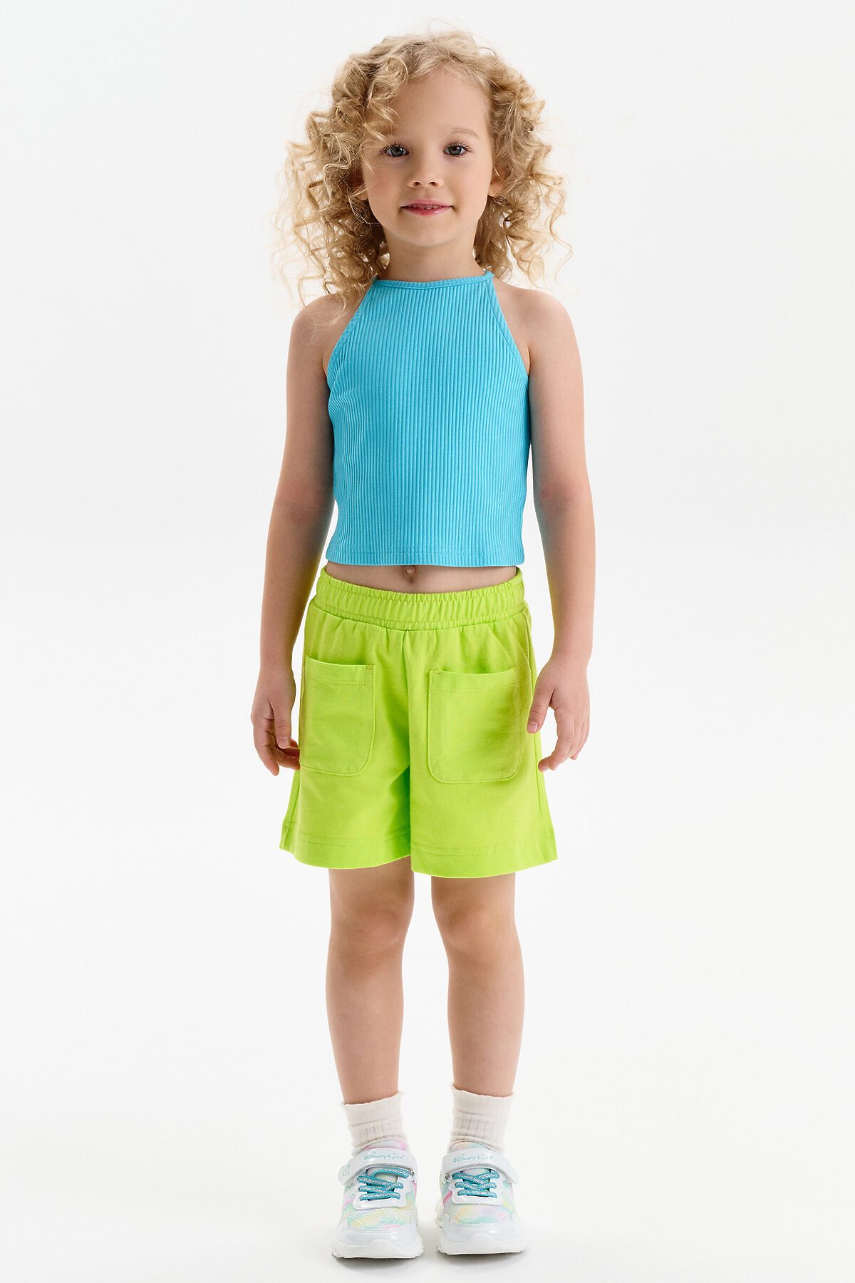 Шорты трикотажные для девочек из 100% хлопка. Длина уменьшена до середины бедра по сравнению с коллекцией Лето 25. Шорты с поясом на широком простроченном эластике и дополнительной шнуровкой обеспечивают идеальную посадку и регулировку по размеру.По переду два накладных кармана.