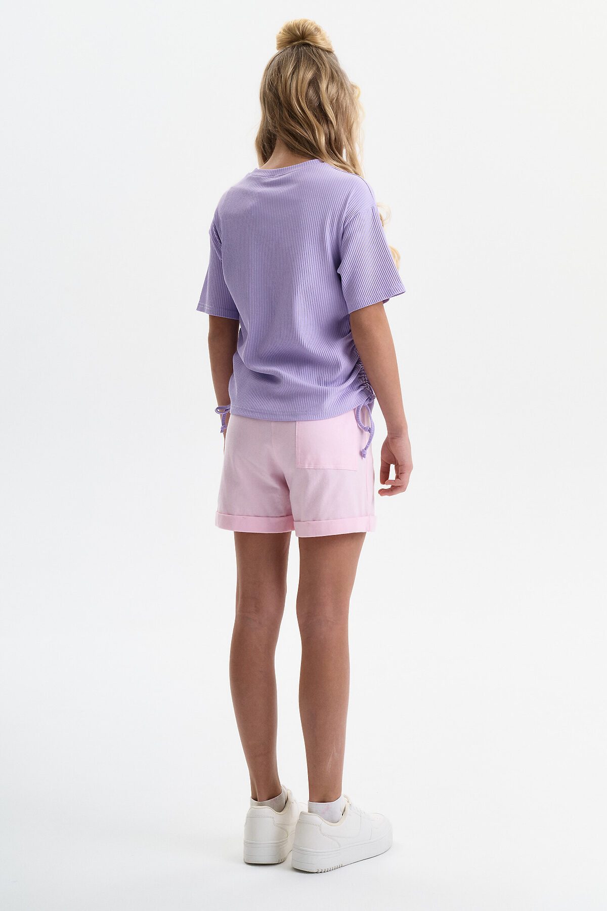 Шорты трикотажные для девочек из 100% хлопка. Длина уменьшена до середины бедра по сравнению с коллекцией Лето 25. Шорты с поясом на широком простроченном эластике и дополнительной шнуровкой обеспечивают идеальную посадку и регулировку по размеру.По переду два накладных кармана.