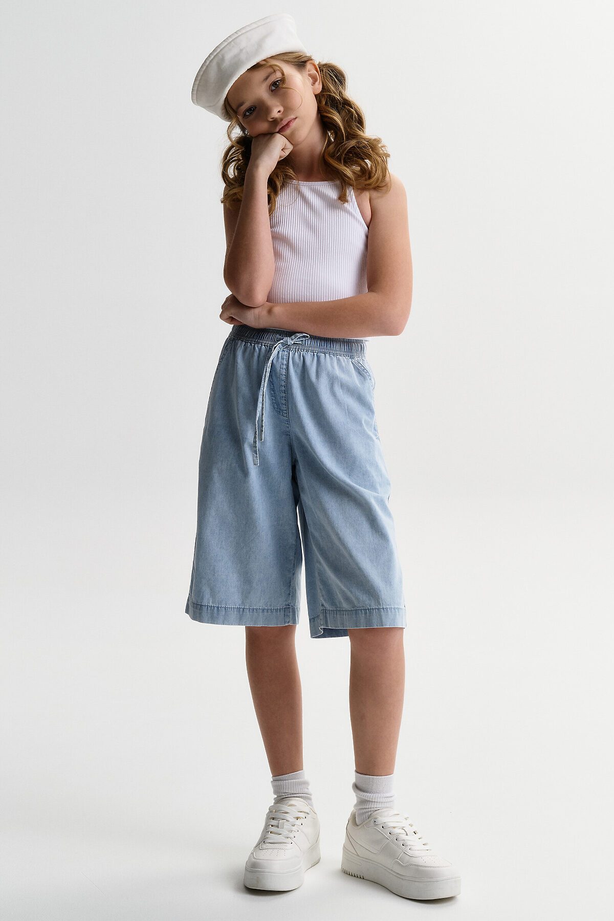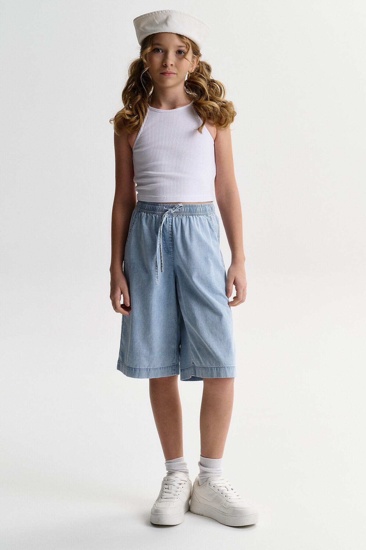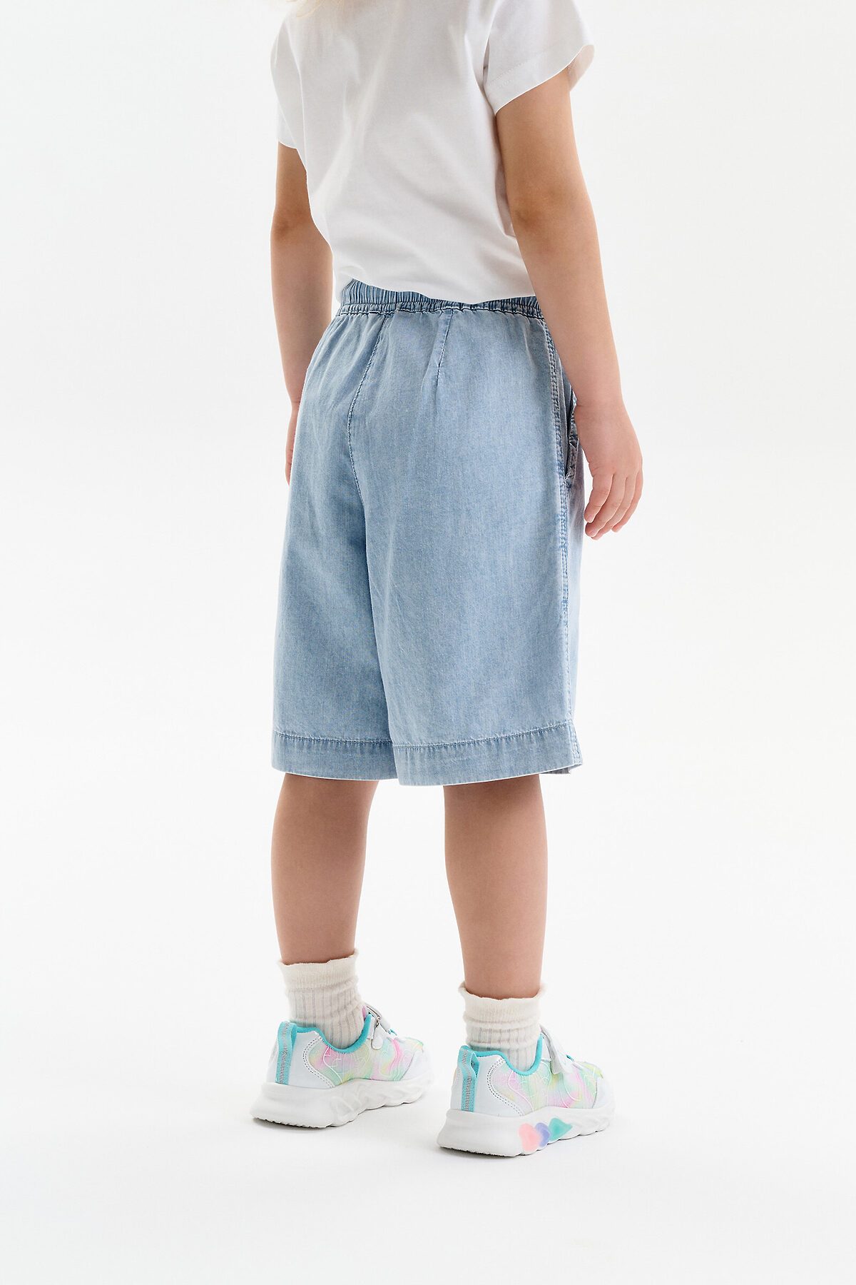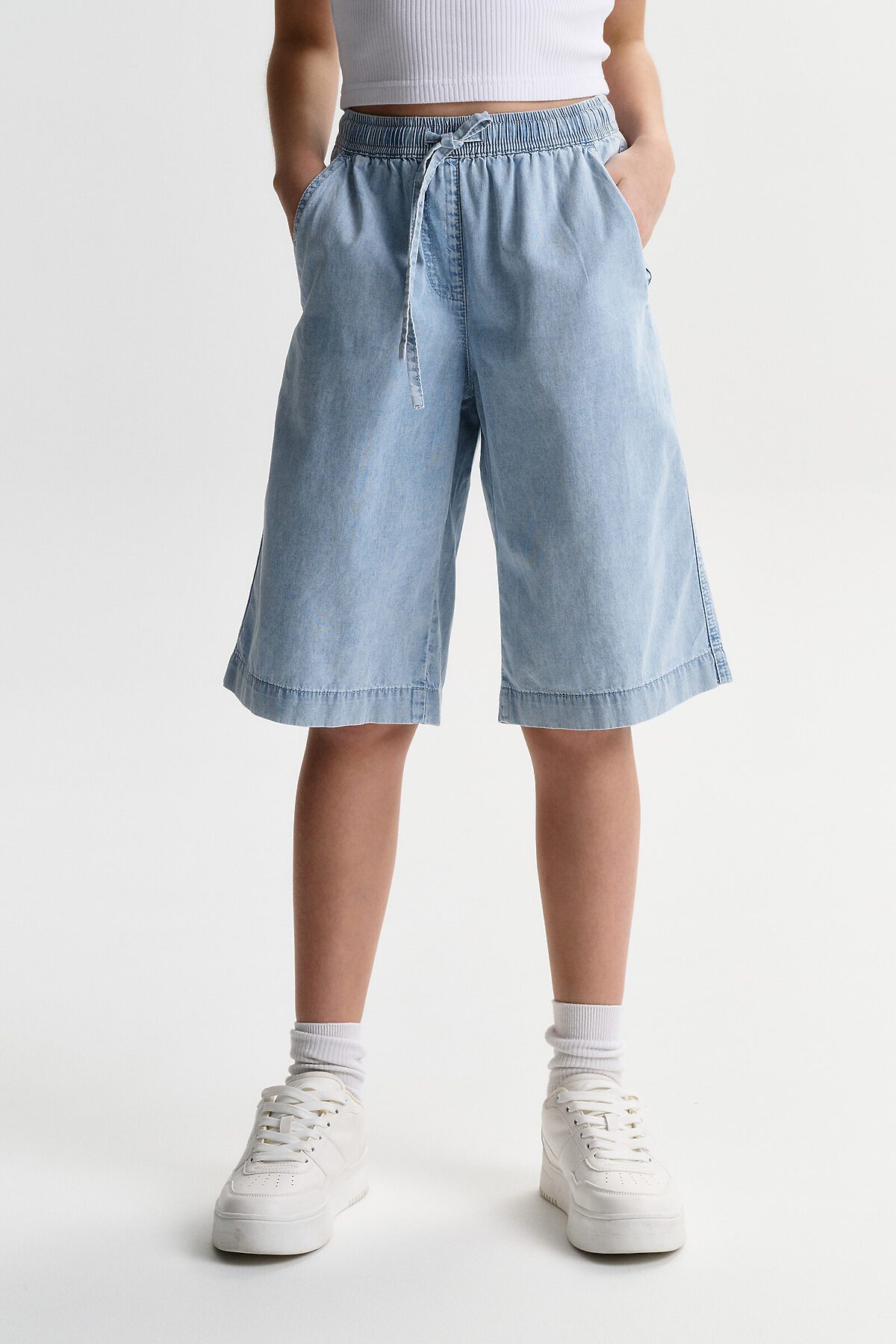 Шорты детские из тонкой джинсы для девочки. Широкие шорты длиной до колена подарят ребёнку комфорт и свободу движения. Модель без застёжки — быстро и удобно надевать и снимать. В поясе мягкая и широкая резинка — не давит и не перекручивается. Шнурок из основной ткани позволяет регулировать объём и посадку изделия. По центру переда имитация гульфика. По бокам удобные наклонные карманы. Шорты однотонные, без принта. За ними легко ухаживать. В составе ткани преобладает высококачественный хлопок — шорты мягкие и прекрасно пропускают воздух — кожа ребёнка дышит. Изделие выполнено в джинсовом синем цвете с актуальным эффектом мягкой варки garment wash. Подходят для девочек дошкольного и младшего школьного возраста, а также девочек-подростков. Шорты можно носить на прогулках и дома. Они прекрасно сочетаются с различным верхом. Выбирайте нужный размер по таблице размеров на фото. Цвет товара на экране вашего устройства может отличаться от цвета изделия вживую.