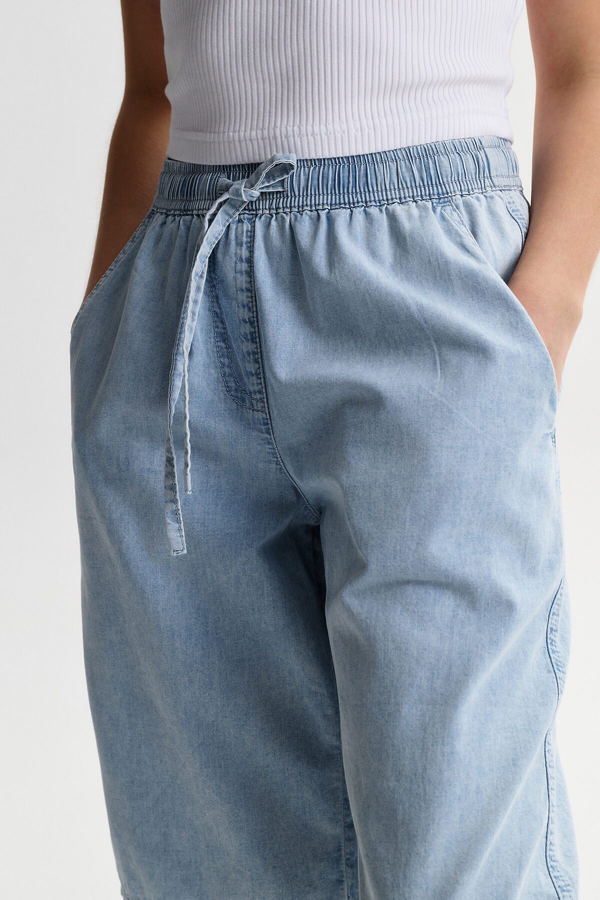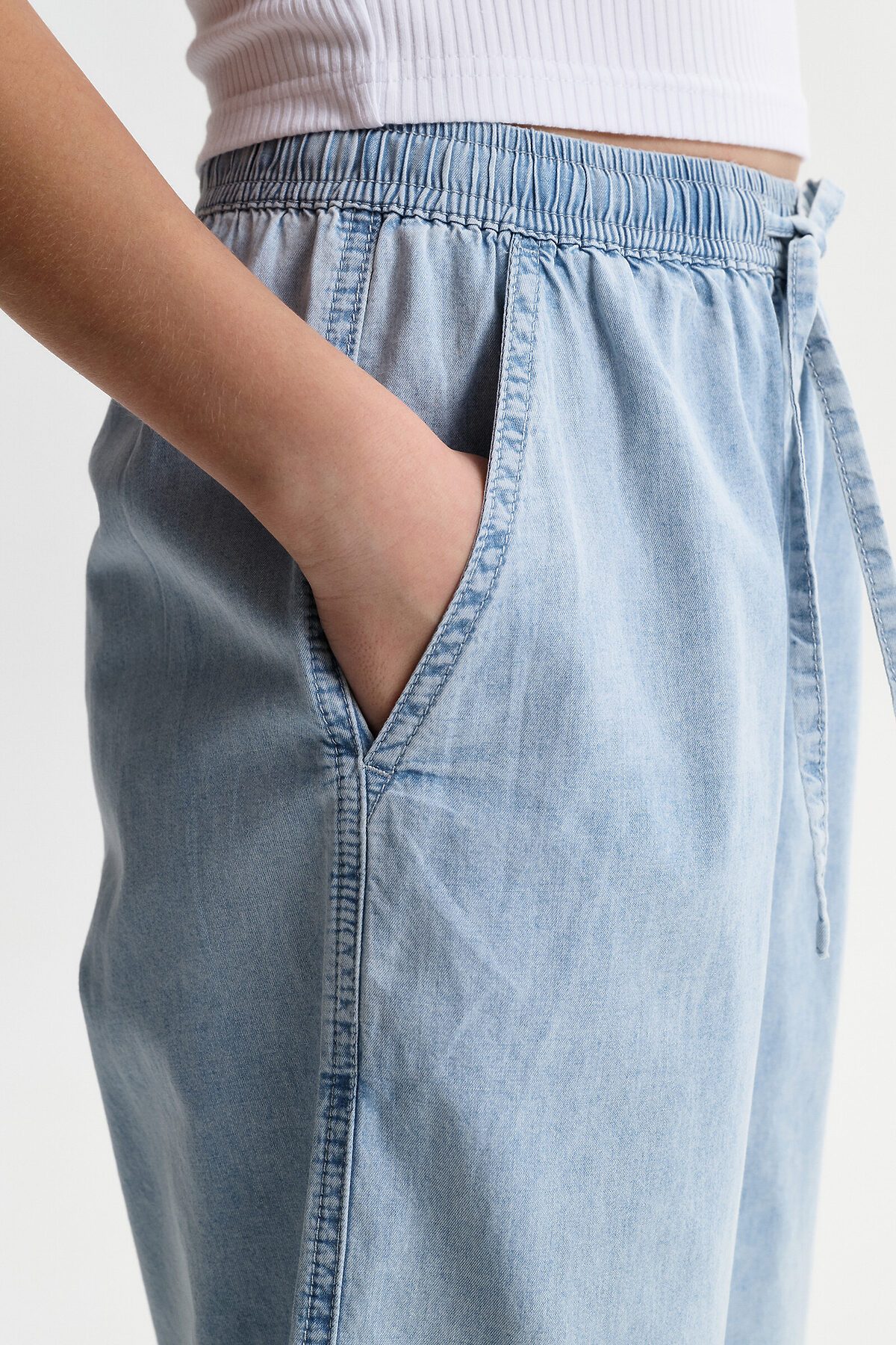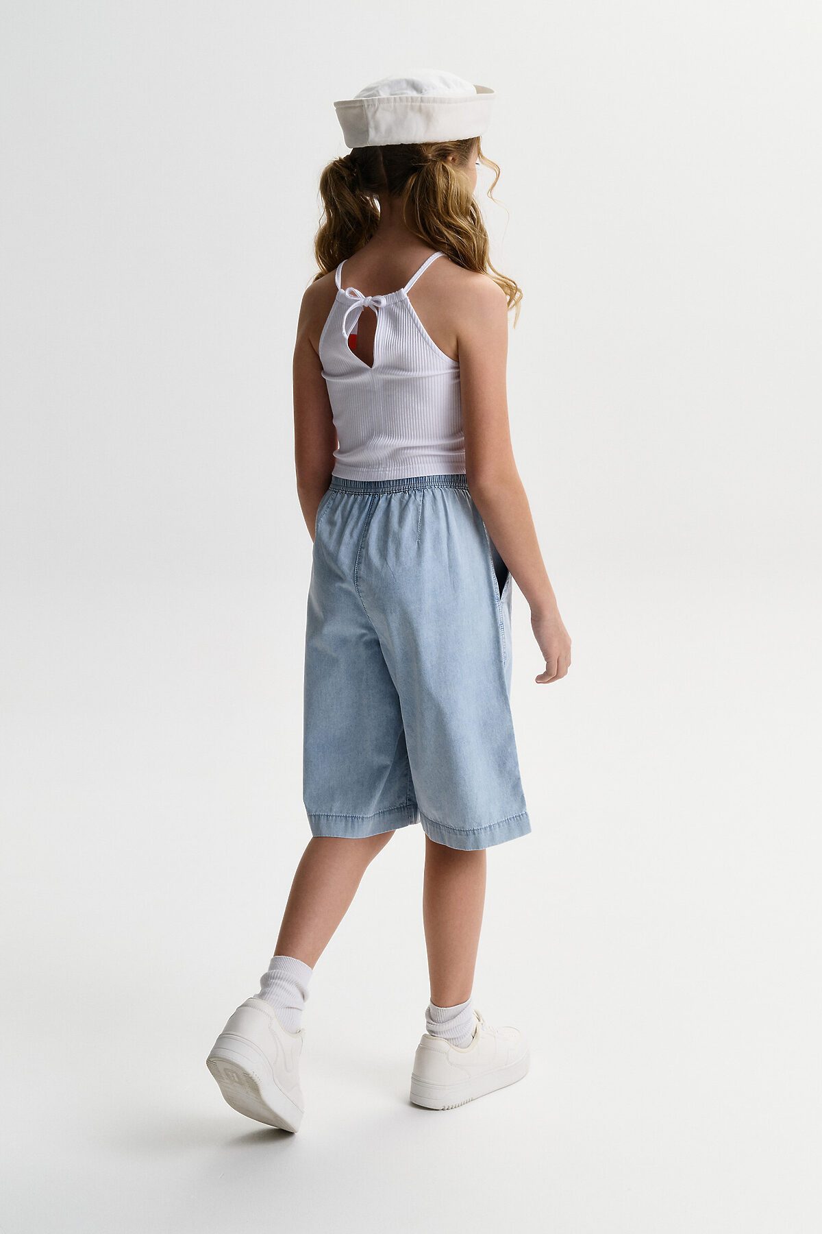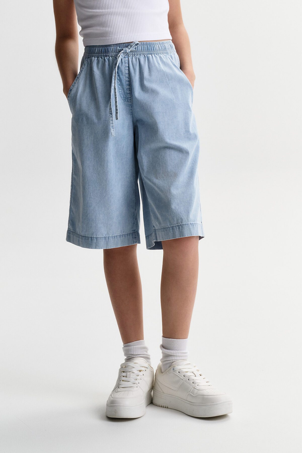 Шорты детские из тонкой джинсы для девочки. Широкие шорты длиной до колена подарят ребёнку комфорт и свободу движения. Модель без застёжки — быстро и удобно надевать и снимать. В поясе мягкая и широкая резинка — не давит и не перекручивается. Шнурок из основной ткани позволяет регулировать объём и посадку изделия. По центру переда имитация гульфика. По бокам удобные наклонные карманы. Шорты однотонные, без принта. За ними легко ухаживать. В составе ткани преобладает высококачественный хлопок — шорты мягкие и прекрасно пропускают воздух — кожа ребёнка дышит. Изделие выполнено в джинсовом синем цвете с актуальным эффектом мягкой варки garment wash. Подходят для девочек дошкольного и младшего школьного возраста, а также девочек-подростков. Шорты можно носить на прогулках и дома. Они прекрасно сочетаются с различным верхом. Выбирайте нужный размер по таблице размеров на фото. Цвет товара на экране вашего устройства может отличаться от цвета изделия вживую.