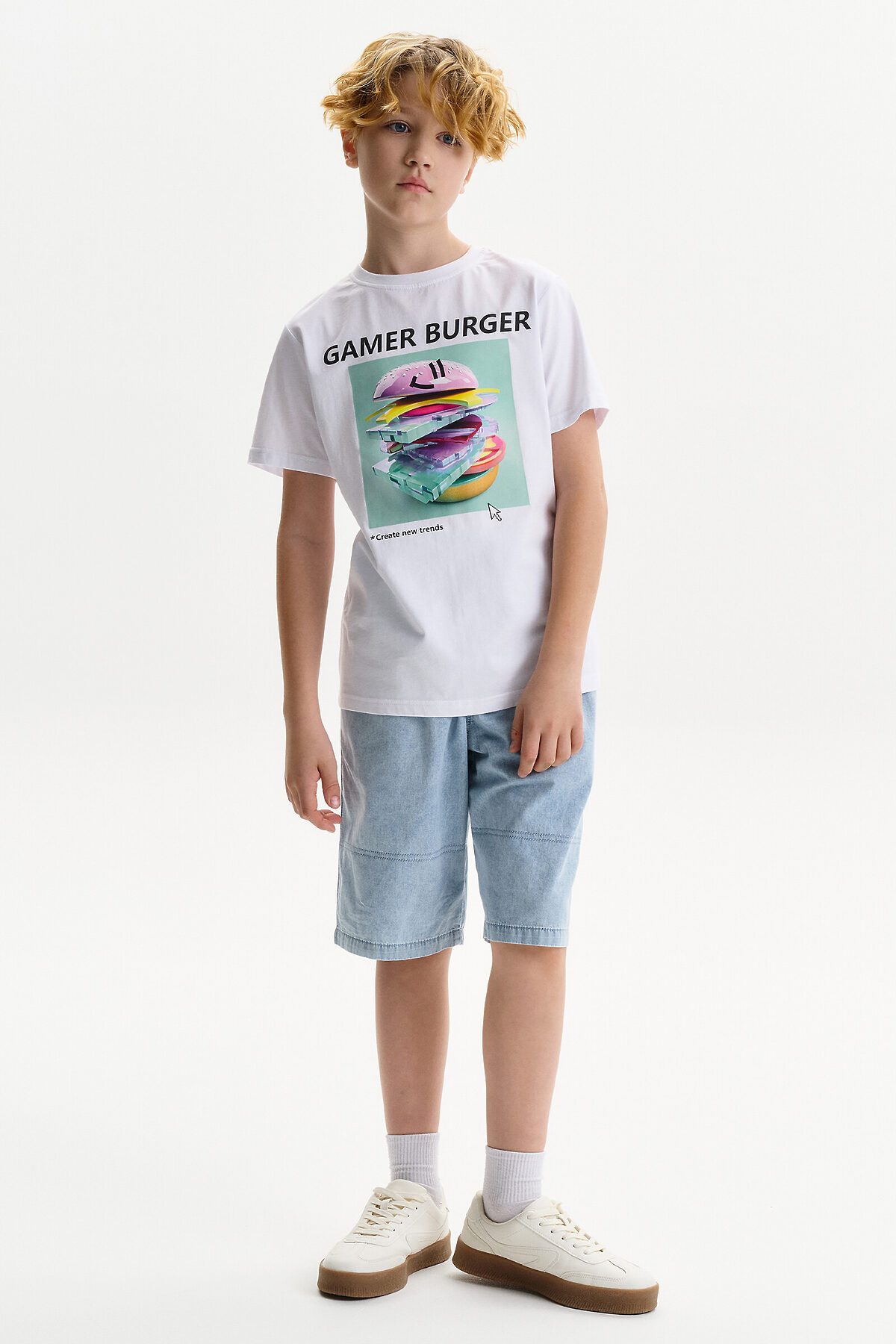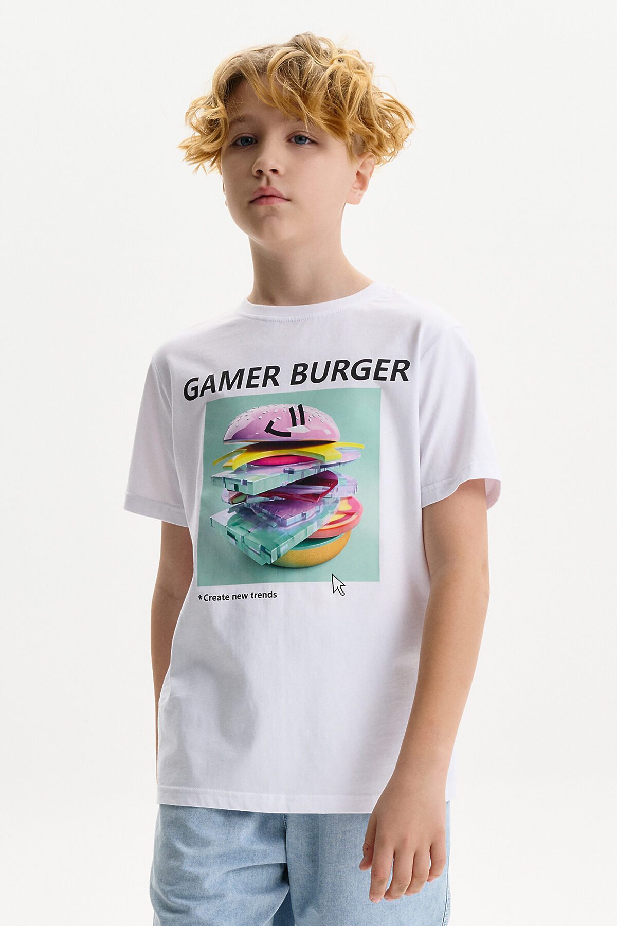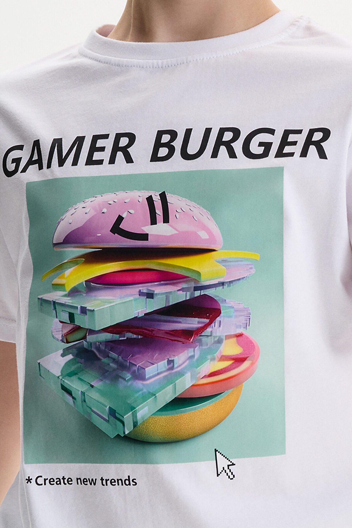 Представляем вашему вниманию футболку с цифровым бургером для детей и подростков! Это не просто бургер — это Геймер Бургер, главный герой виртуальной кухни, где вместо обычных ингредиентов собираются настоящие суперсилы! Когда-то давно обычный бургер случайно попал в игровой мир. Там его подсветили неоновые лампы, прокачали уровни, добавили цифровые слои — и каждый ингредиент стал особенным: - неоновая булочка — даёт +100 к настроению - пиксельный сыр — добавляет ловкость пальцев - голографический бекон — усиливает скорость реакции - кристальный салат — заряжает энергией на весь день - геймерский соус — улучшает меткость в играх и в жизни Теперь Геймер Бургер путешествует между мирами и появляется только у тех, кто любит креатив, технологии и весёлые приключения. Он напоминает детям: «Создавай свои тренды, играй по своим правилам — и всё получится!» Футболка с Геймер Бургером — это символ фантазии, драйва и цифрового стиля.