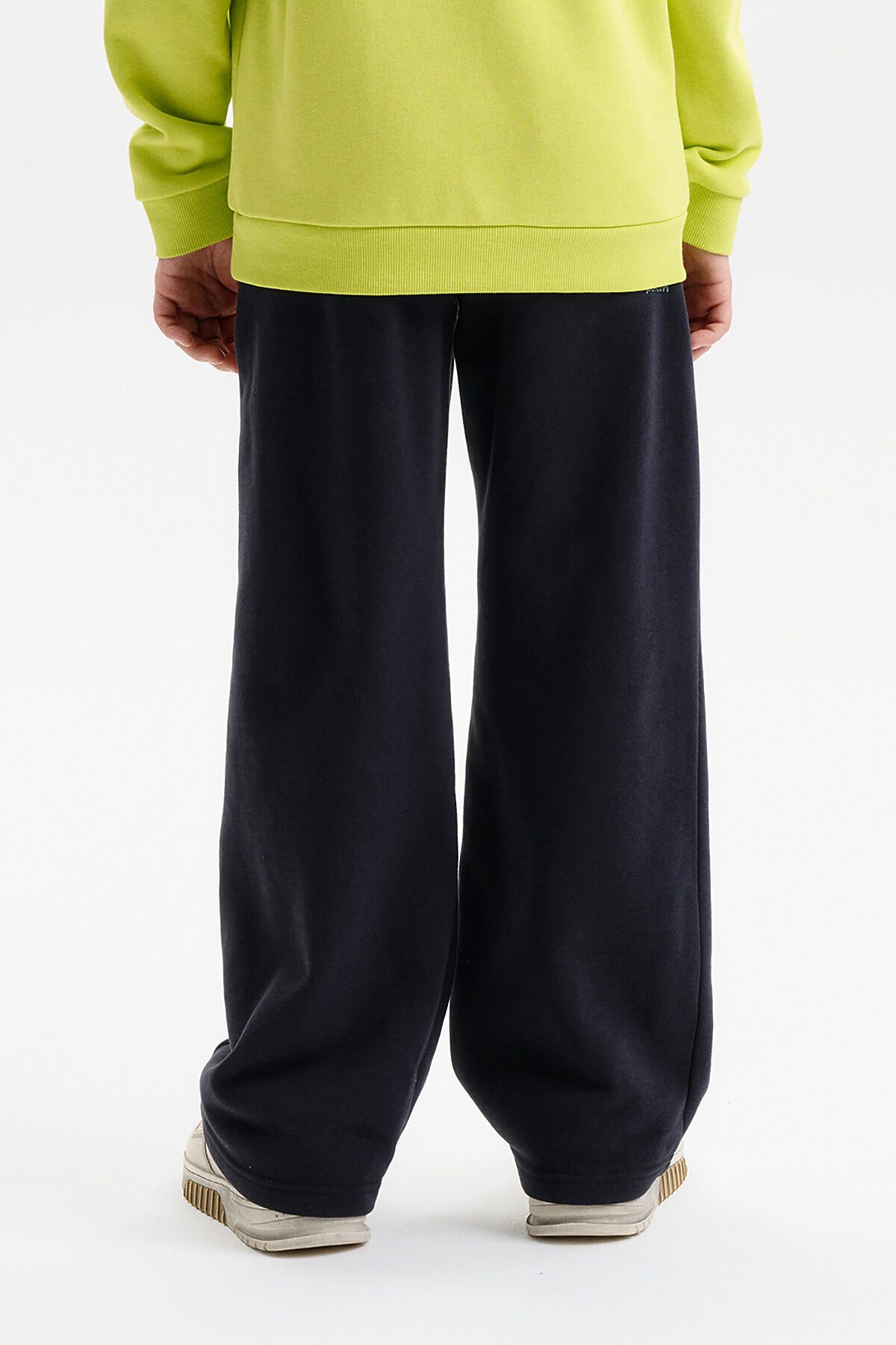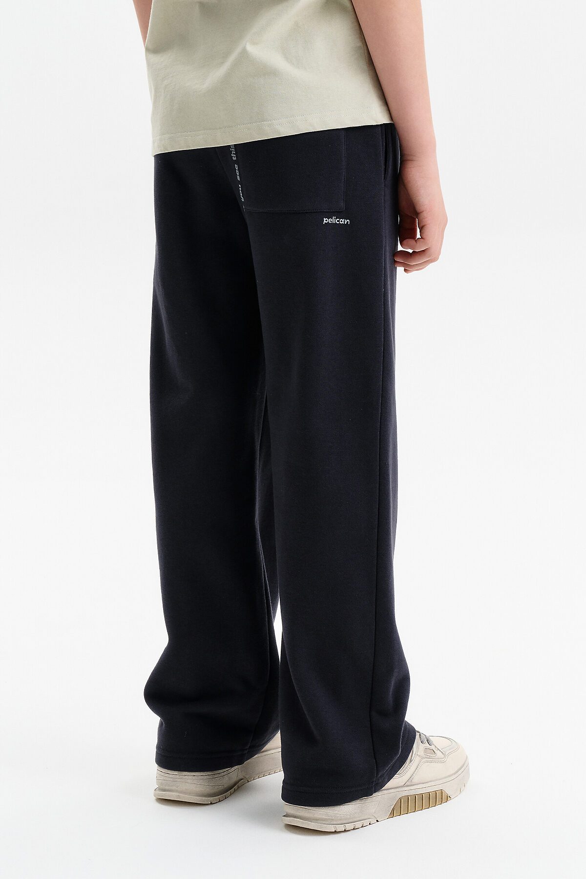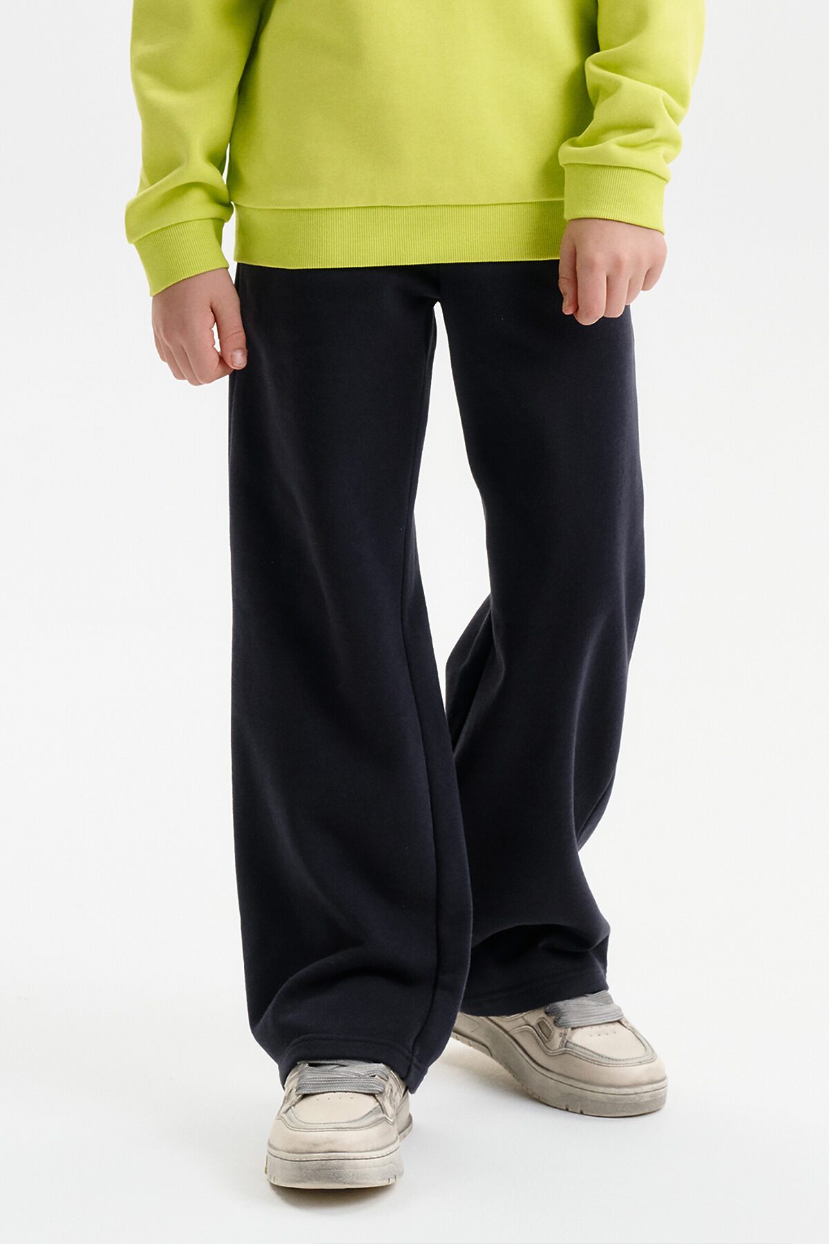 Широкие прямые брюки для мальчика из футера плотностью 310 гр/кв.м. Карманы в боковых швах. На задней половинке брюк справа накладной карман. Пояс из основной ткани, внутри широкий эластик, прострочен двумя строчками. В поясе внутренняя утяжка на шнурок.