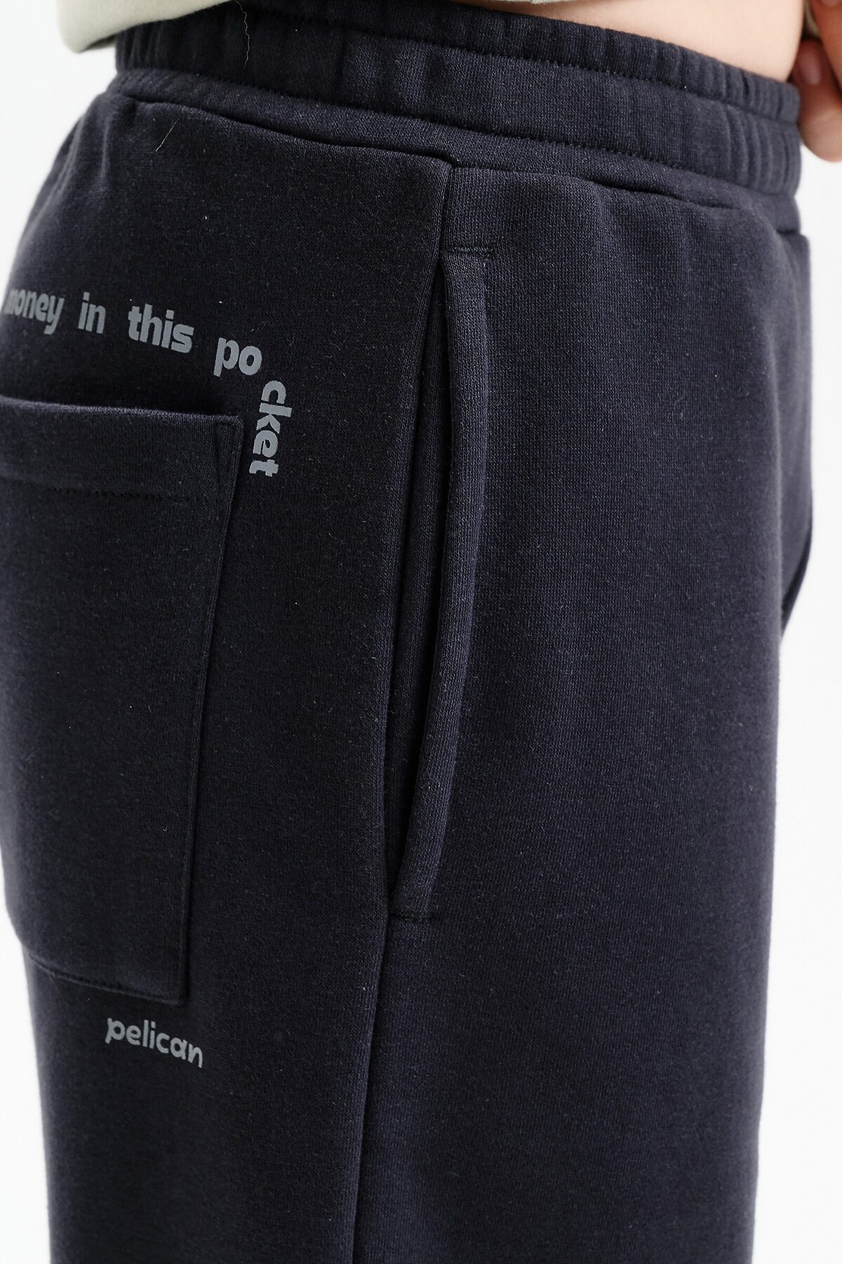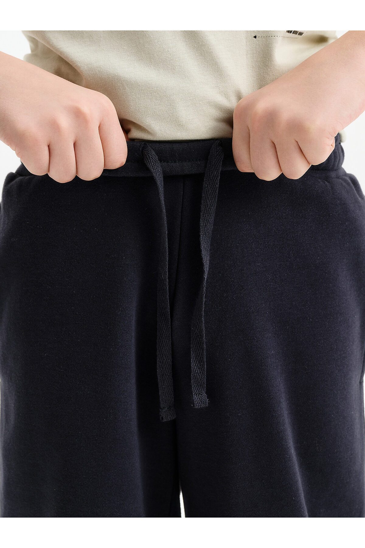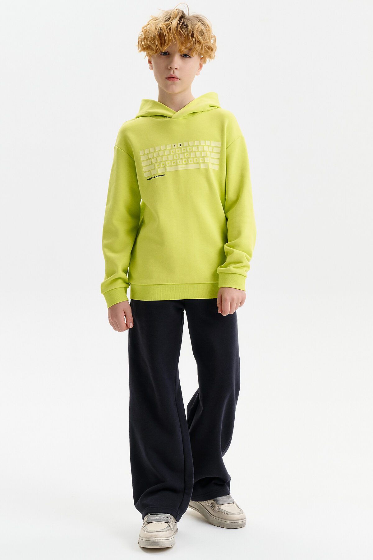 Широкие прямые брюки для мальчика из футера плотностью 310 гр/кв.м. Карманы в боковых швах. На задней половинке брюк справа накладной карман. Пояс из основной ткани, внутри широкий эластик, прострочен двумя строчками. В поясе внутренняя утяжка на шнурок.