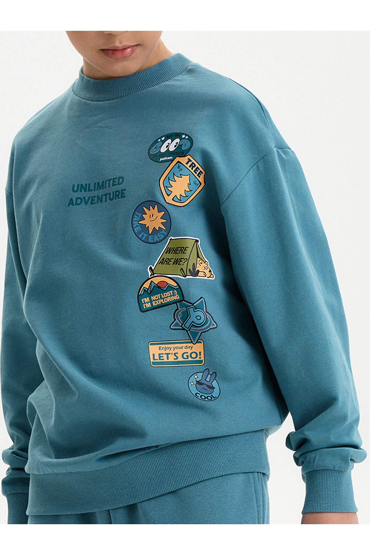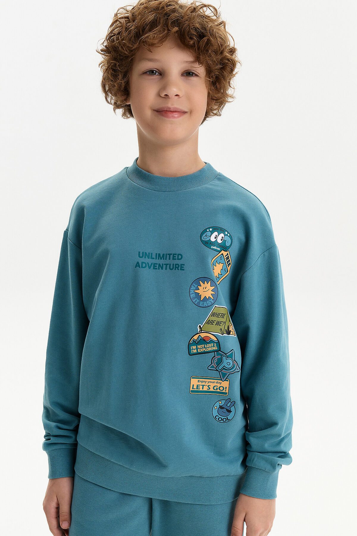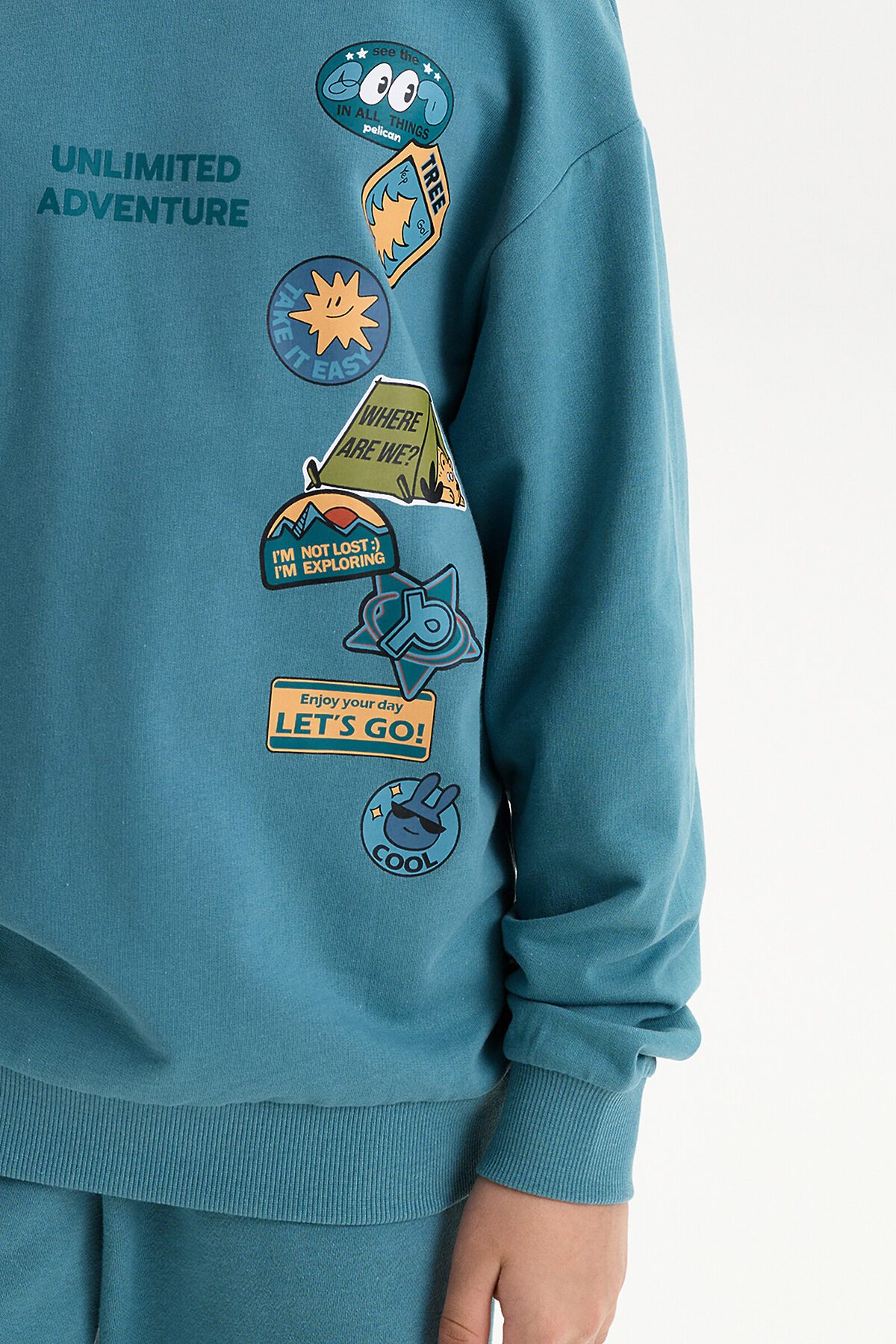 Свитшот из материала футер-петля. Манжеты и низ изделия из рибаны. Перевод текста: Безграничные приключения: Видеть во всём хорошее: Не напрягаться: Где мы?: Я не потерялся, я исследую: Наслаждайтесь своим днём: Вперёд!