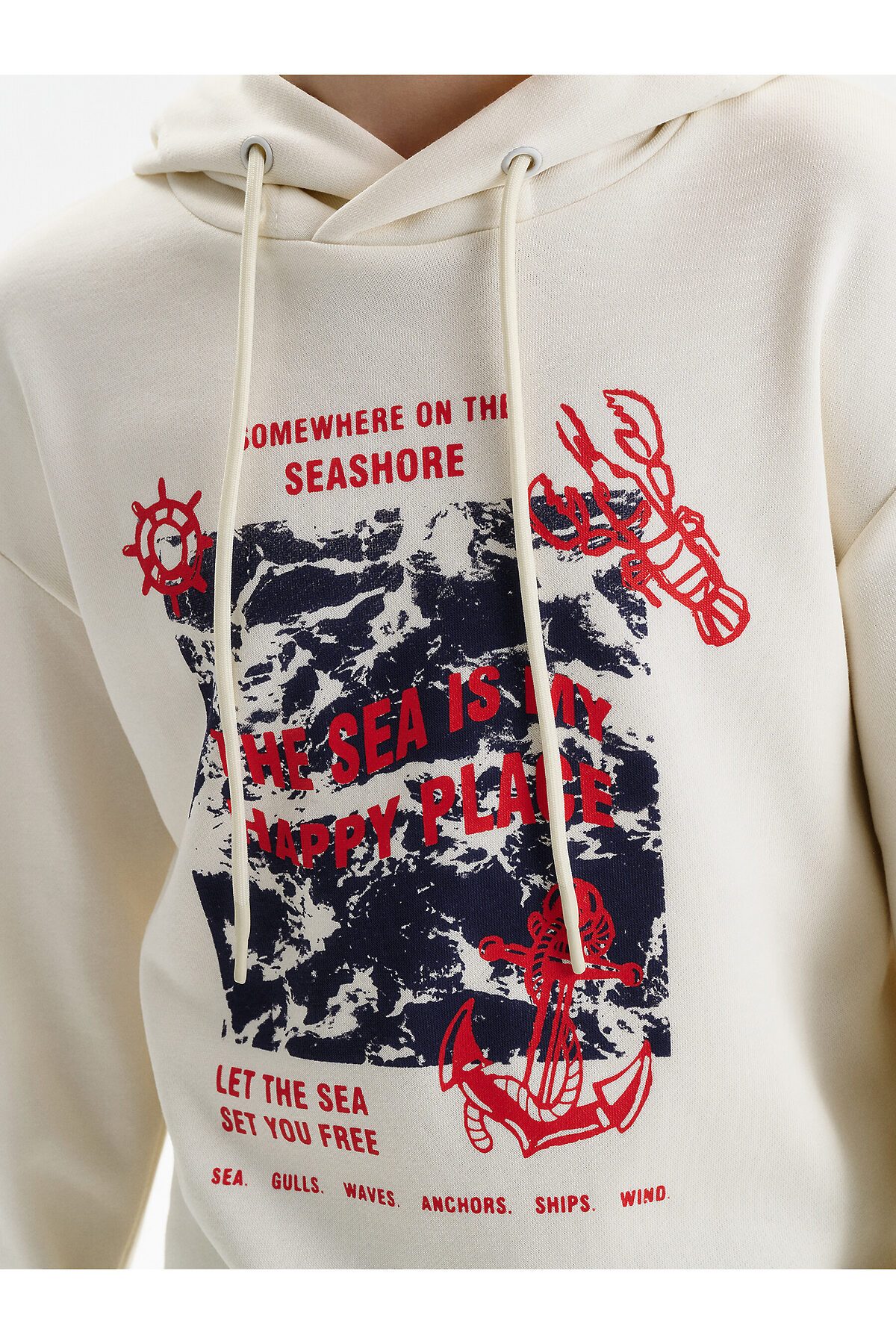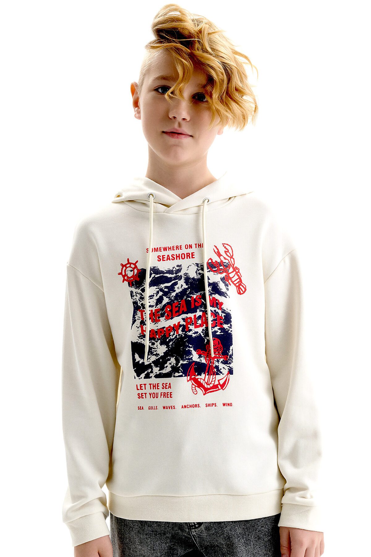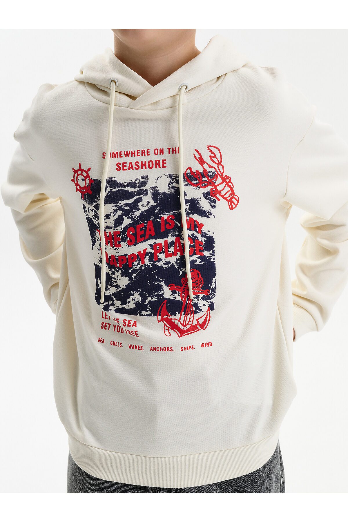 Худи для мальчика без начеса – актуальная вещь в любом сезоне, будь то весна, лето или осень. Кофта спортивная для мальчика выполнена из плотного футера-петля, который отлично согревает в прохладную погоду и при этом хорошо пропускает воздух – ребенок активно двигается, играет, не потеет. Толстовка свободного покроя оверсайз со спущенным плечом, углубленной проймой. Рукава а также низ изделия на манжете из рибаны. Кофта без карманов. Капюшон с регулировкой объема. По переду изделие украшено принтом с надписью. Перевод надписей "somewhere on the seashore" - где-то на побережье, "the sea is my happy place" - море-мое счастливое место, "let the sea set you free" - позвольте морю освободить вас, "sea.gulls.waves.anchors.ships.wind" - море.чайки.волны.якоря.корабли.ветер. Размерный ряд подходит как для малышей так и для подростков.