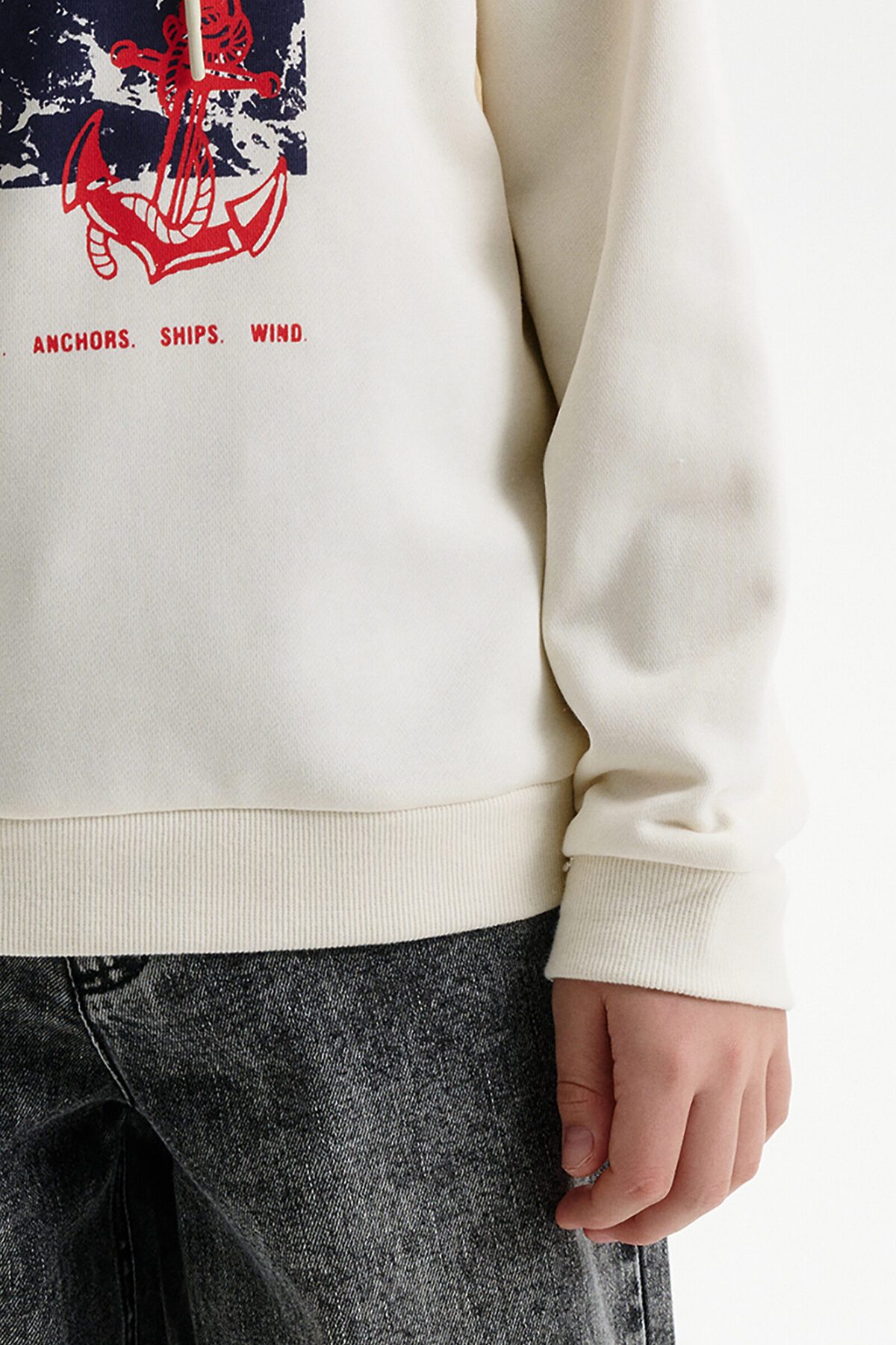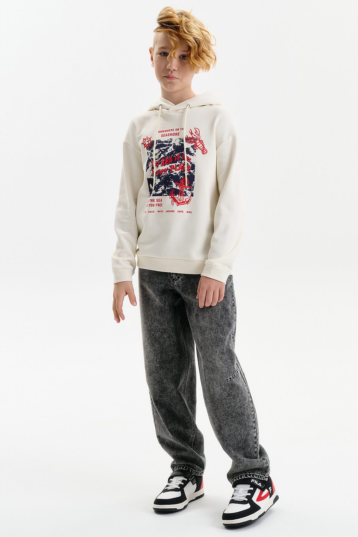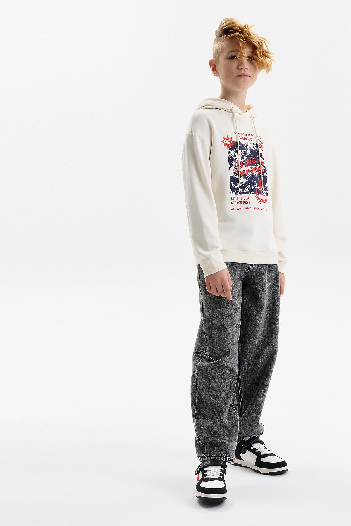Худи для мальчика без начеса – актуальная вещь в любом сезоне, будь то весна, лето или осень. Кофта спортивная для мальчика выполнена из плотного футера-петля, который отлично согревает в прохладную погоду и при этом хорошо пропускает воздух – ребенок активно двигается, играет, не потеет. Толстовка свободного покроя оверсайз со спущенным плечом, углубленной проймой. Рукава а также низ изделия на манжете из рибаны. Кофта без карманов. Капюшон с регулировкой объема. По переду изделие украшено принтом с надписью. Перевод надписей "somewhere on the seashore" - где-то на побережье, "the sea is my happy place" - море-мое счастливое место, "let the sea set you free" - позвольте морю освободить вас, "sea.gulls.waves.anchors.ships.wind" - море.чайки.волны.якоря.корабли.ветер. Размерный ряд подходит как для малышей так и для подростков.