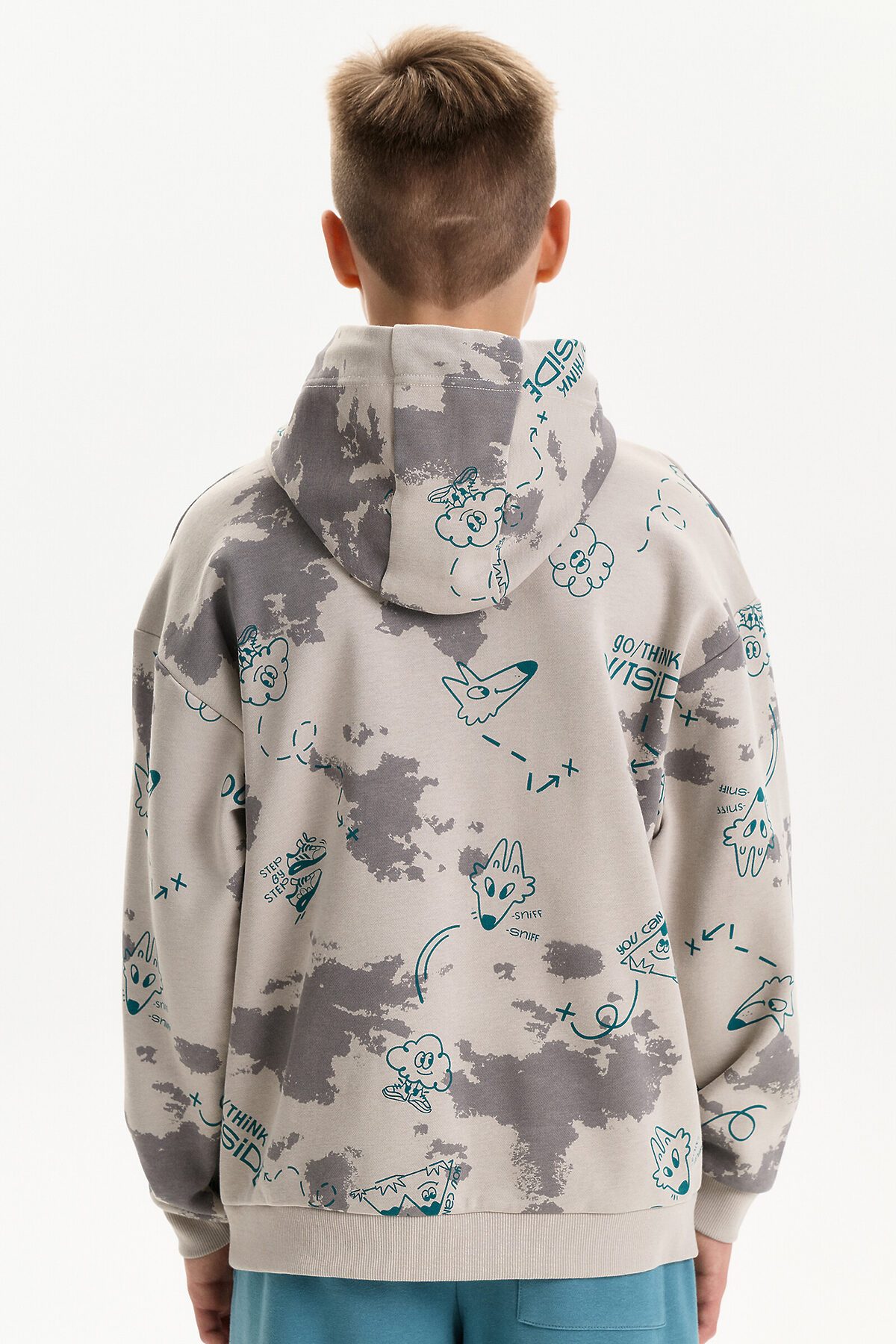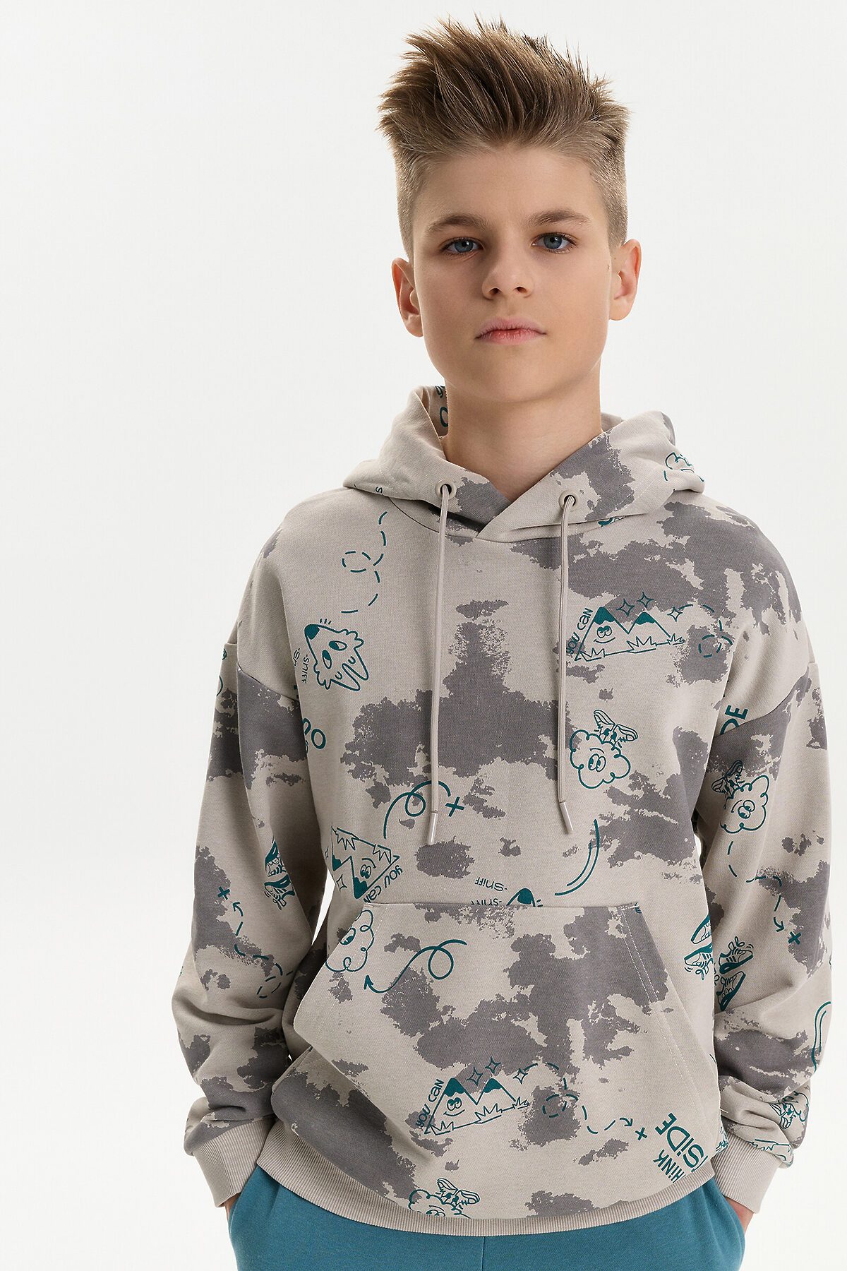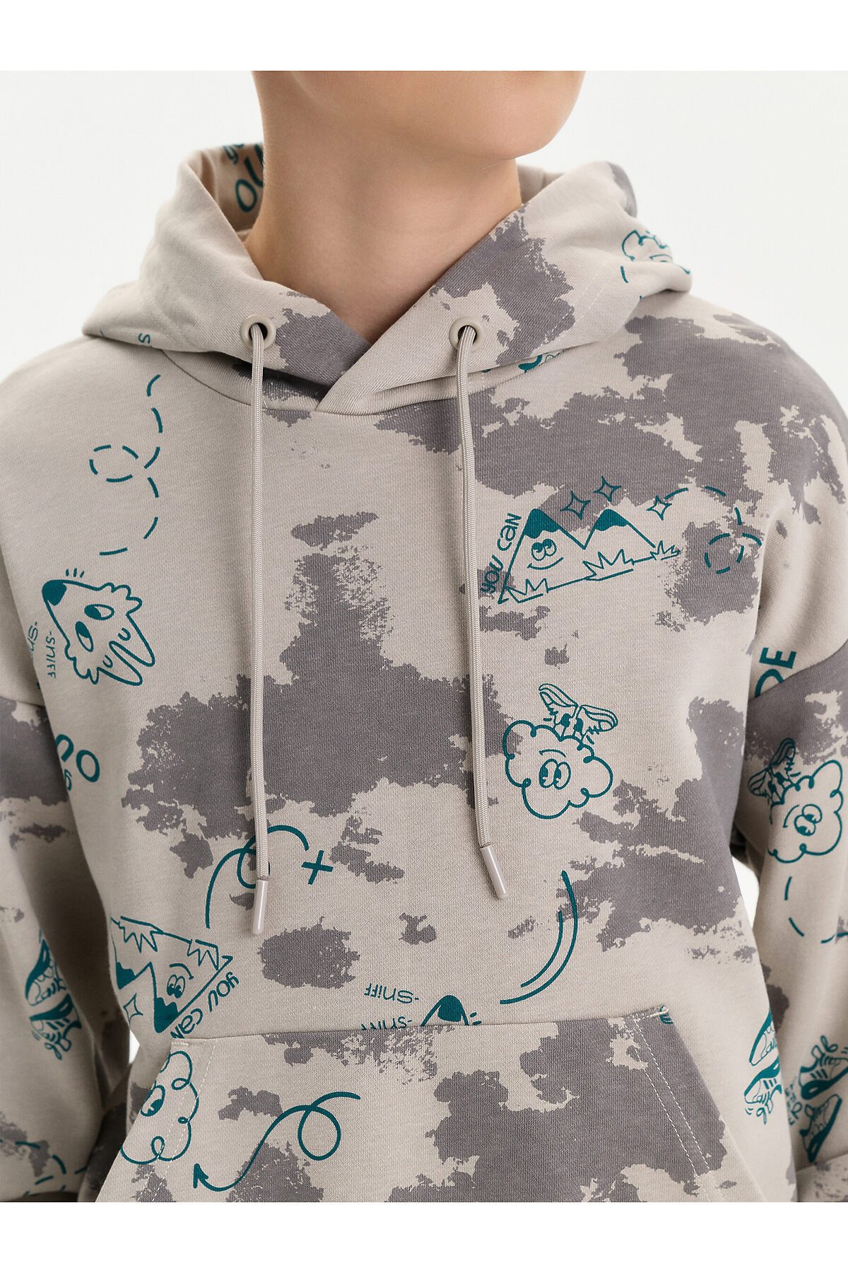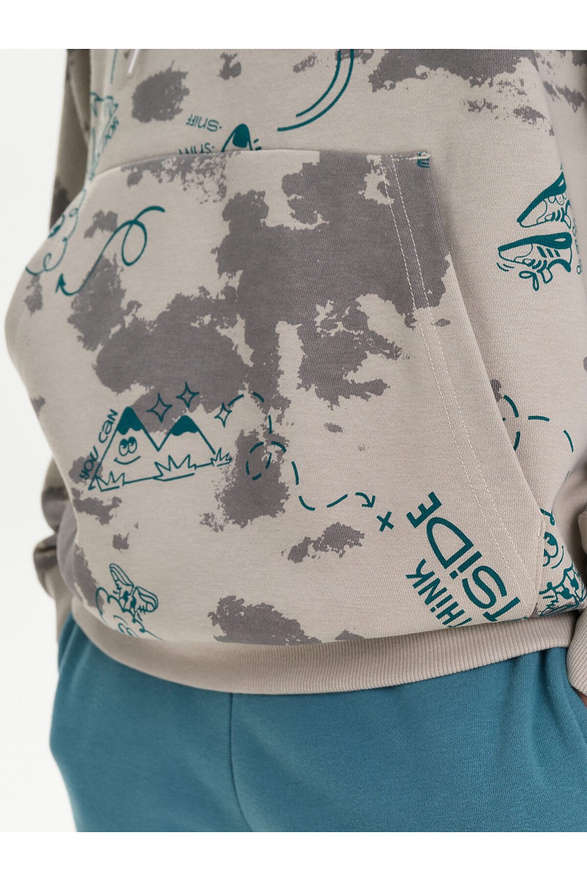 Худи из терри свободного покроя "оверсайз" со спущенным плечом, углубленной проймой. Низ рукава и низ изделия на манжете из рибаны. Капюшон двухшовный с запахом и люверсами, высота капюшона регулируется с помощью шнурка. По переду карман-кенгуру. Перевод текста: Step by step - шаг за шагом: you can - ты можешь: go/think outside - выйти на улицу/мыслить нестандартно.
