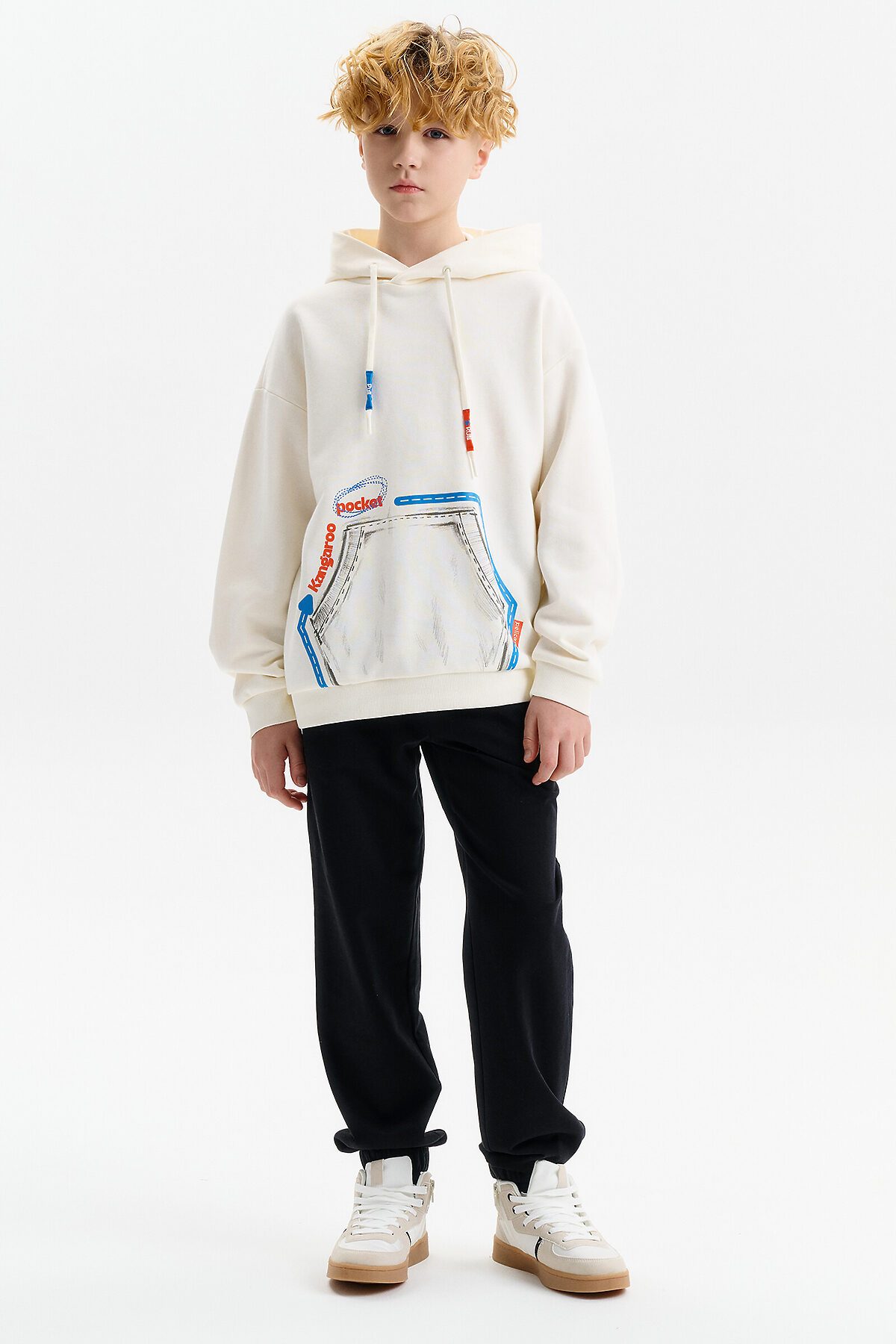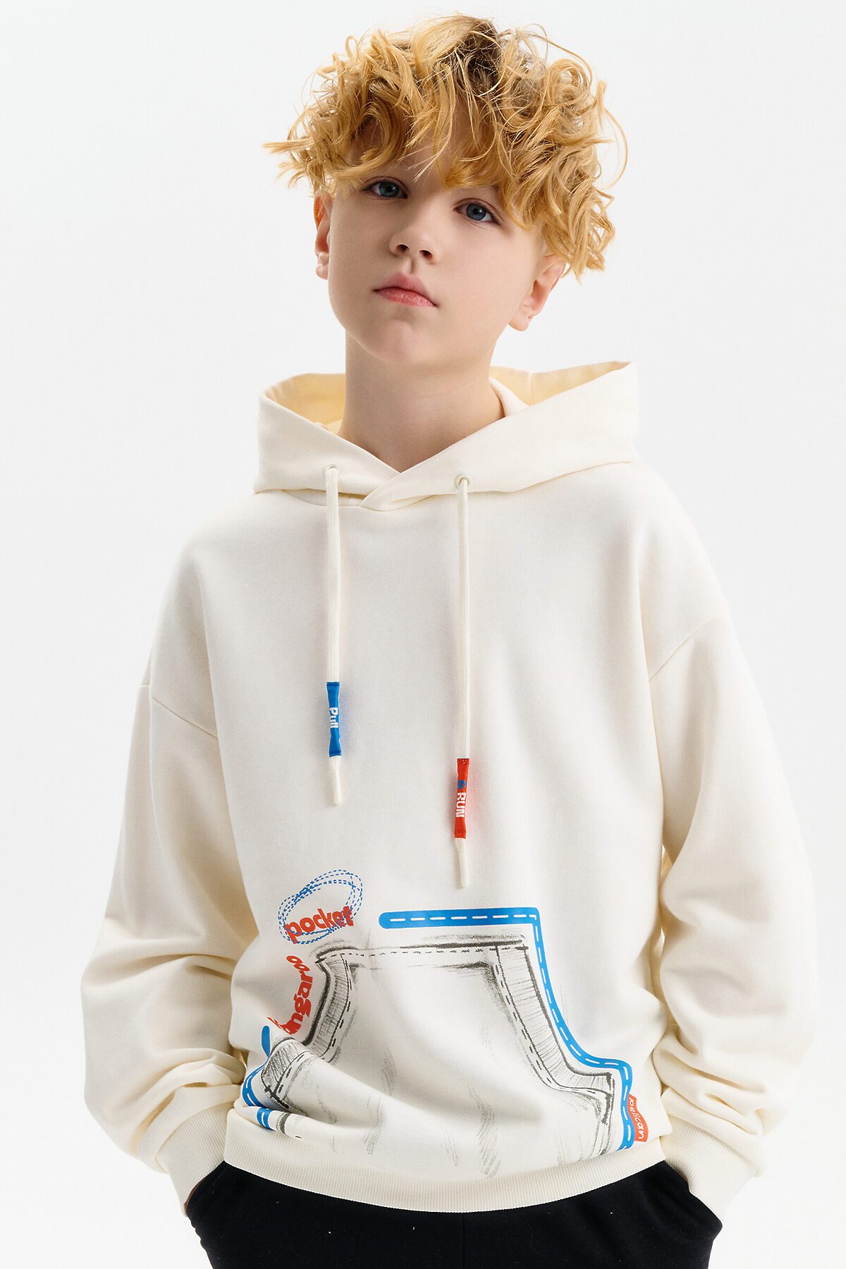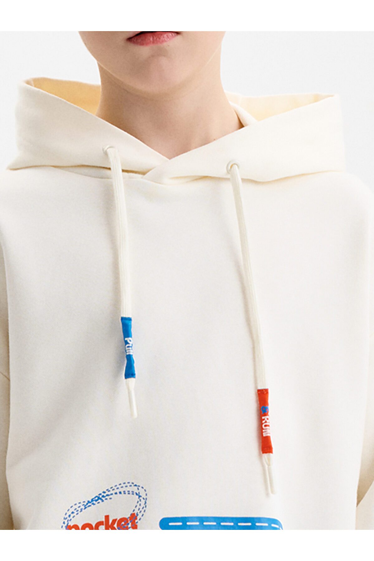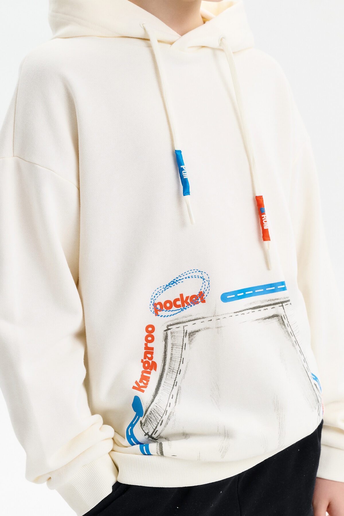 Худи из терри свободного покроя "оверсайз" со спущенным плечом, углубленной проймой. Низ рукава и низ изделия на манжете из рибаны. Капюшон двухшовный с запахом и люверсами, высота капюшона регулируется с помощью шнурка. Принт на шнурках капюшона: затяни и беги! Перевод спереди: карман--кенгуру.