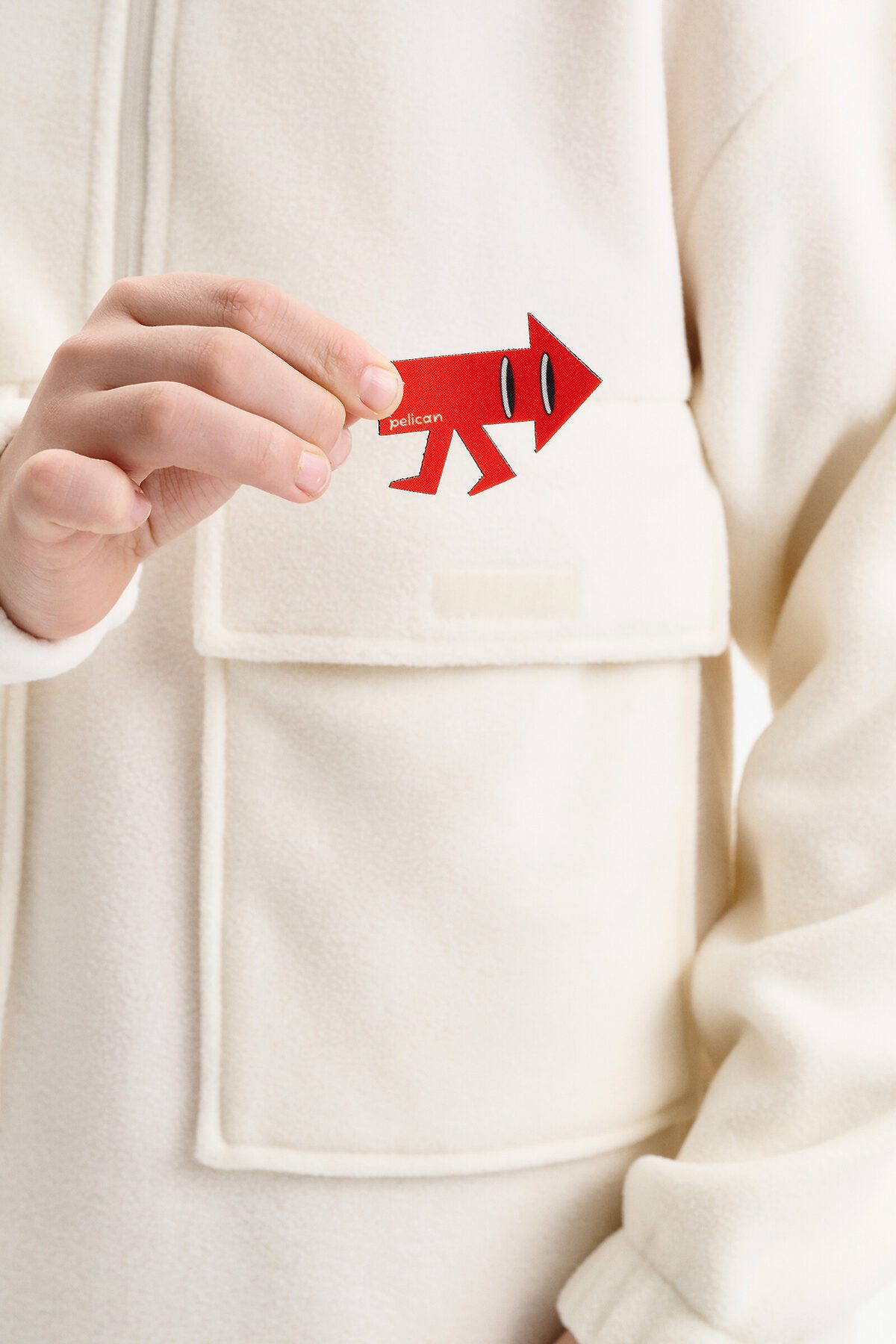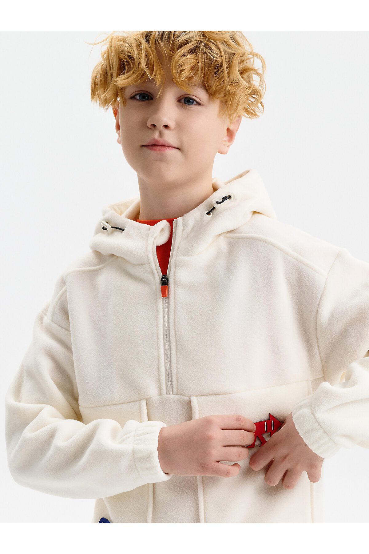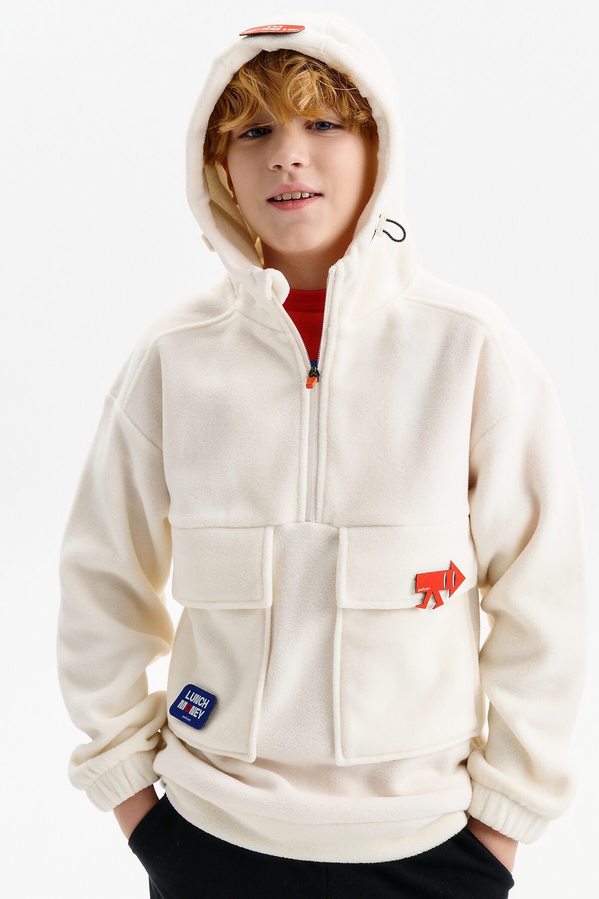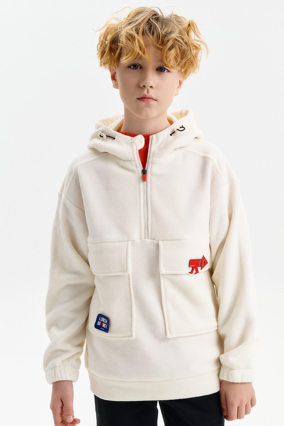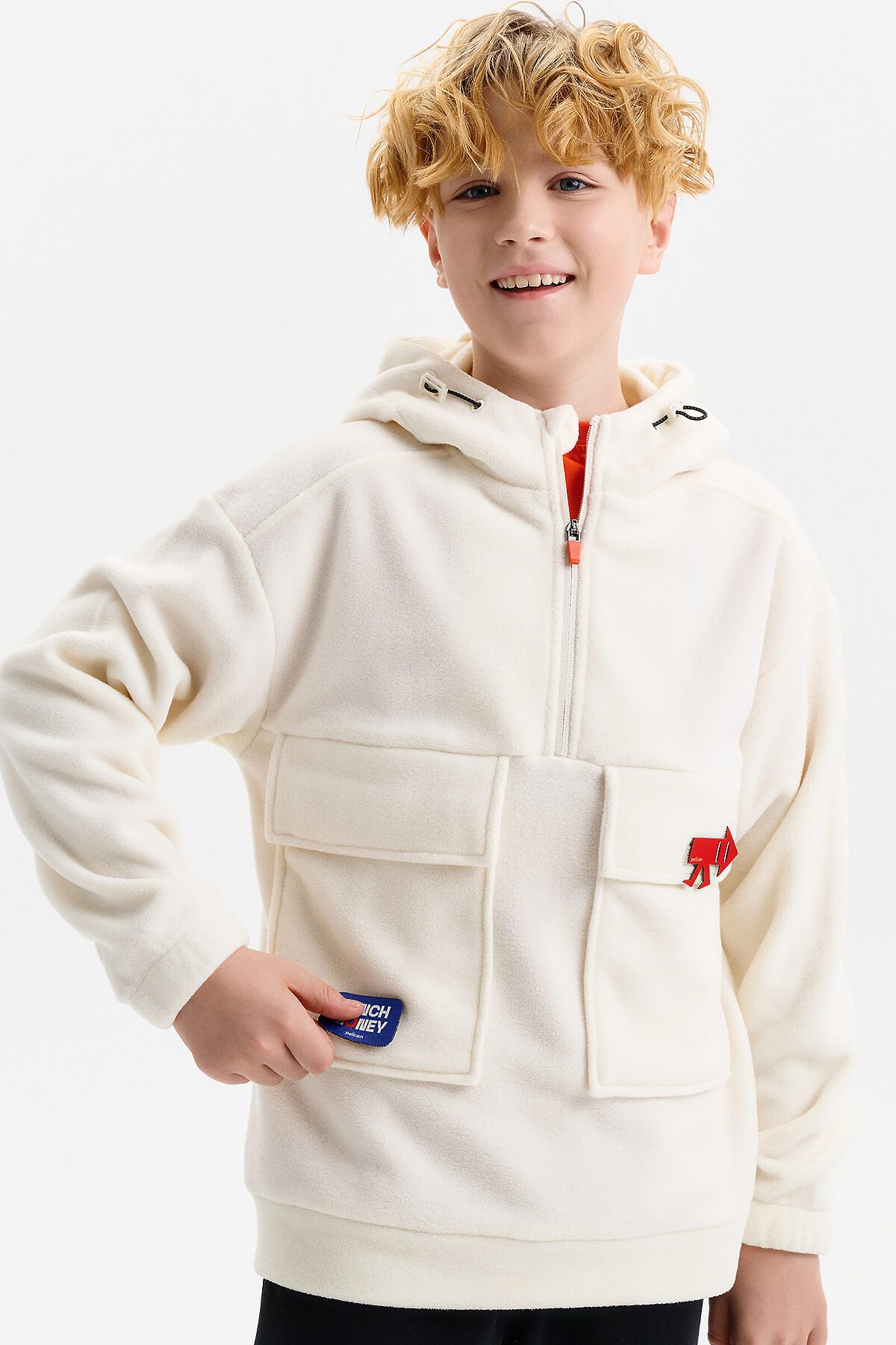 Толстовка флисовая для мальчика со спущенным плеччом из 100% полиэстера. Для удобства надевания в верхней части переда застежка на молнию. По переду большие накладные карманы с клапанами. На спинке кокетка из флиса, переходящая на перед. Низ рукава присборен на внутренний эластик. По низу изделия притачной пояс. Капюшон двухшовный со стойкой по переду и люверсами, высота капюшона регулируется с помощью эластик -корд. Внутренняя обтачка капюшона выполнена из флиса. Перевод текста на капюшоне: чтобы согреться. Перевод текста на кармане: деньги на обед.