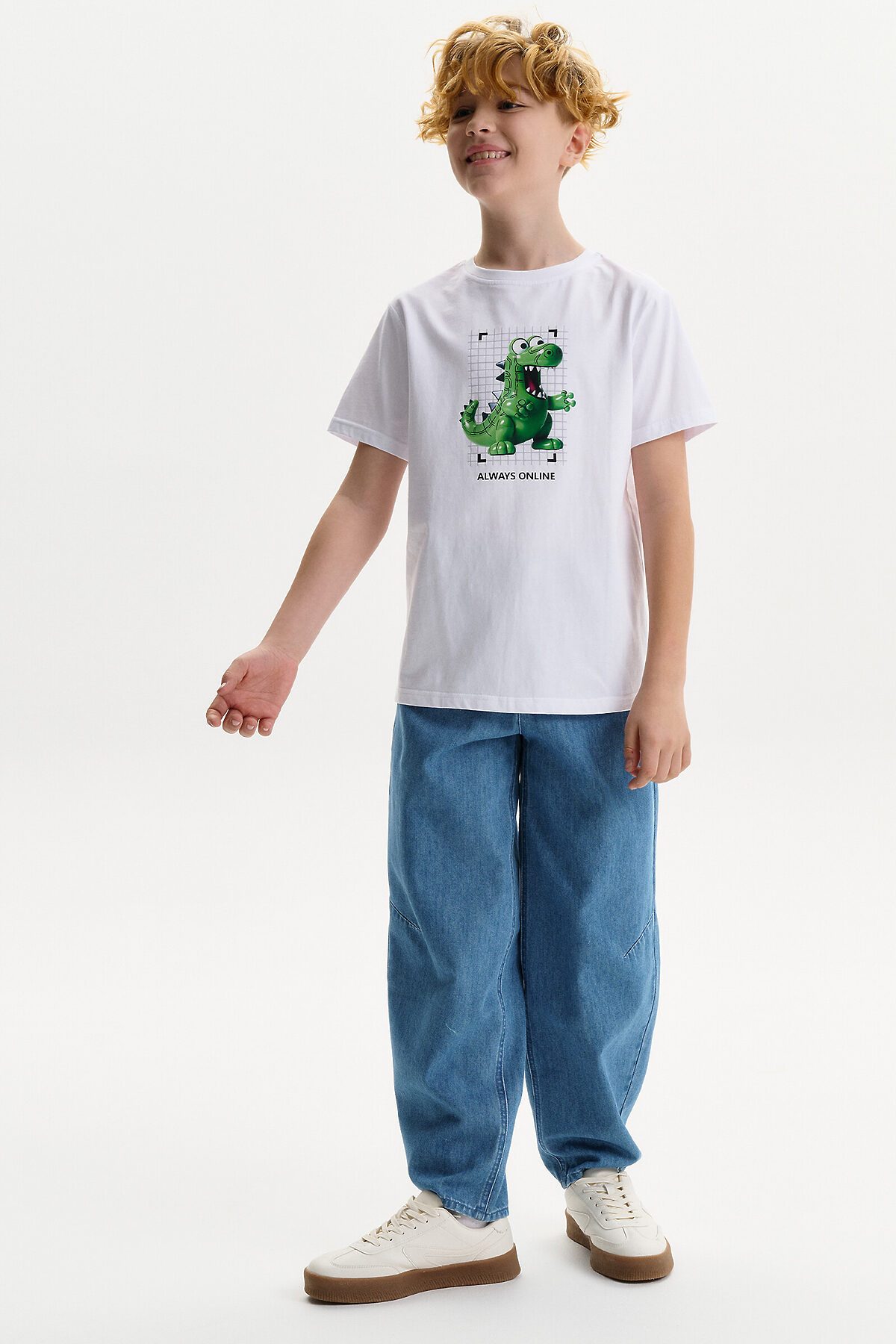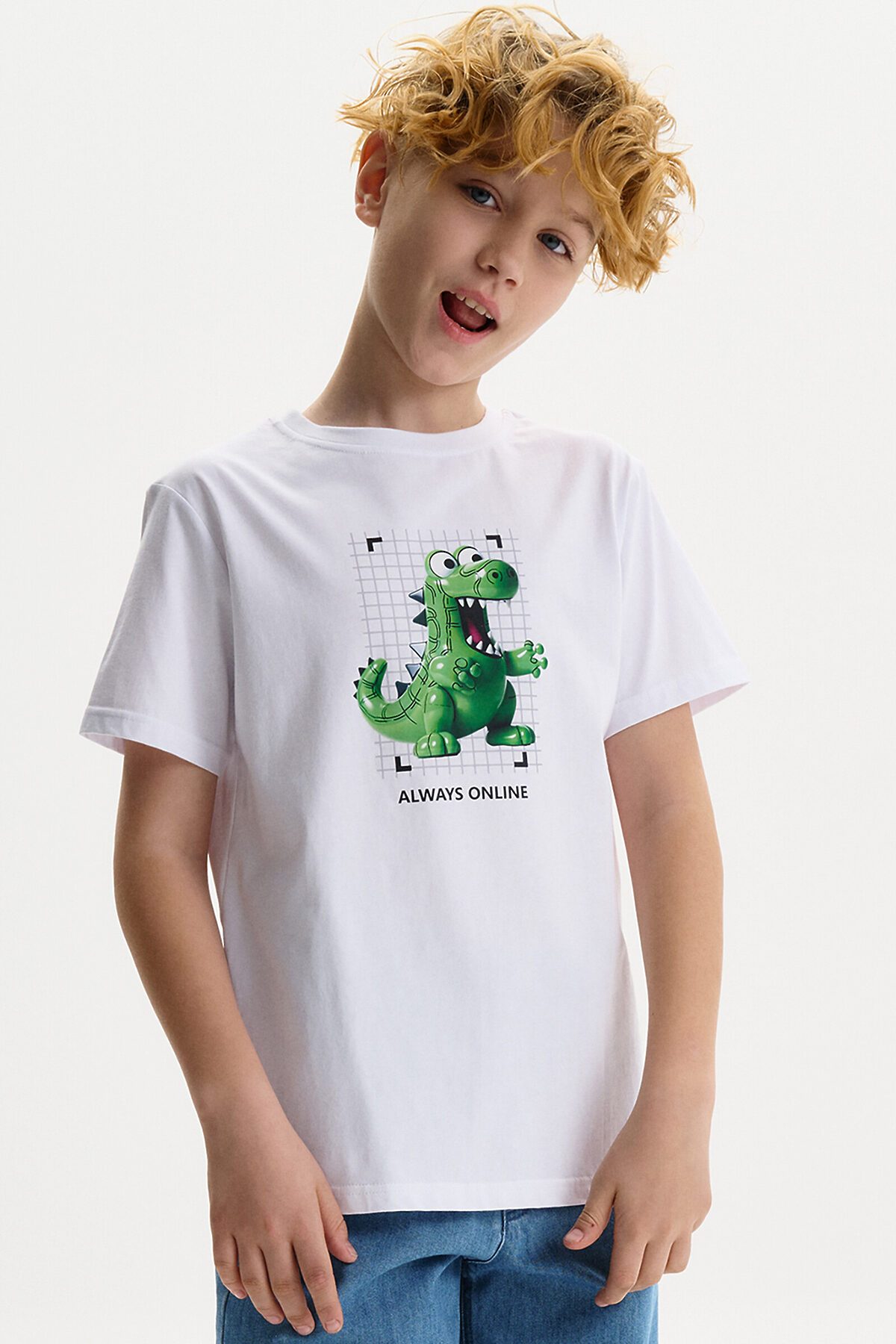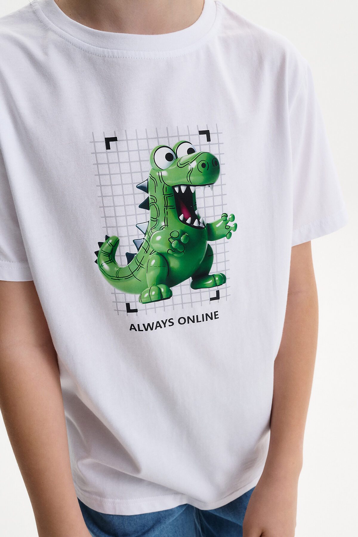 Футболка для мальчика - это идеальный выбор для активного ребенка. Вырез горловины обработан эластичной тканью — она прекрасно держит форму, не растягивается, при этом ребёнку удобно надевать и снимать футболку. Изделие неприхотливо в уходе. Футболка летняя с принтом по переду в виде диноавра (дракона) и надписями в стиле Digital. Перевод надписей: "always online" - всегда онлайн. На спине - текстовый принт, перевод текста: "energy, supercharge, power-ups, coolest 100%" - энергия, заряд, сила, крутость. Яркая спортивная футболка подходит как для подростков так и для малышей в детский сад. Выполненная из 100% хлопка, футболка подойдет для летних и весенних дней, а также это прекрасный вариант для малышей, которые ходят в детский сад.