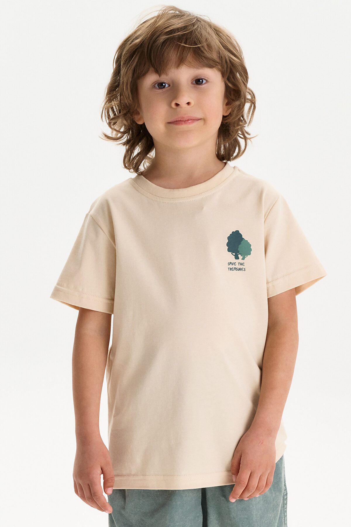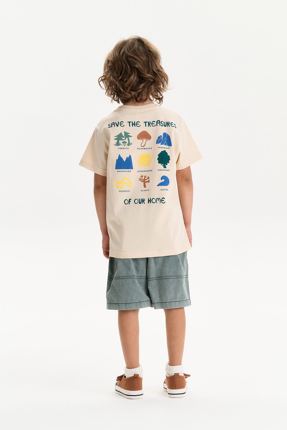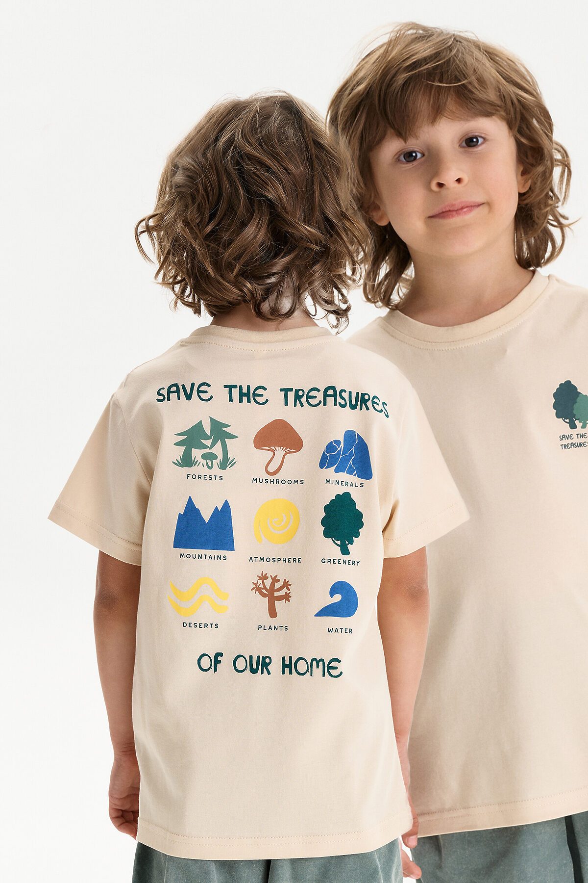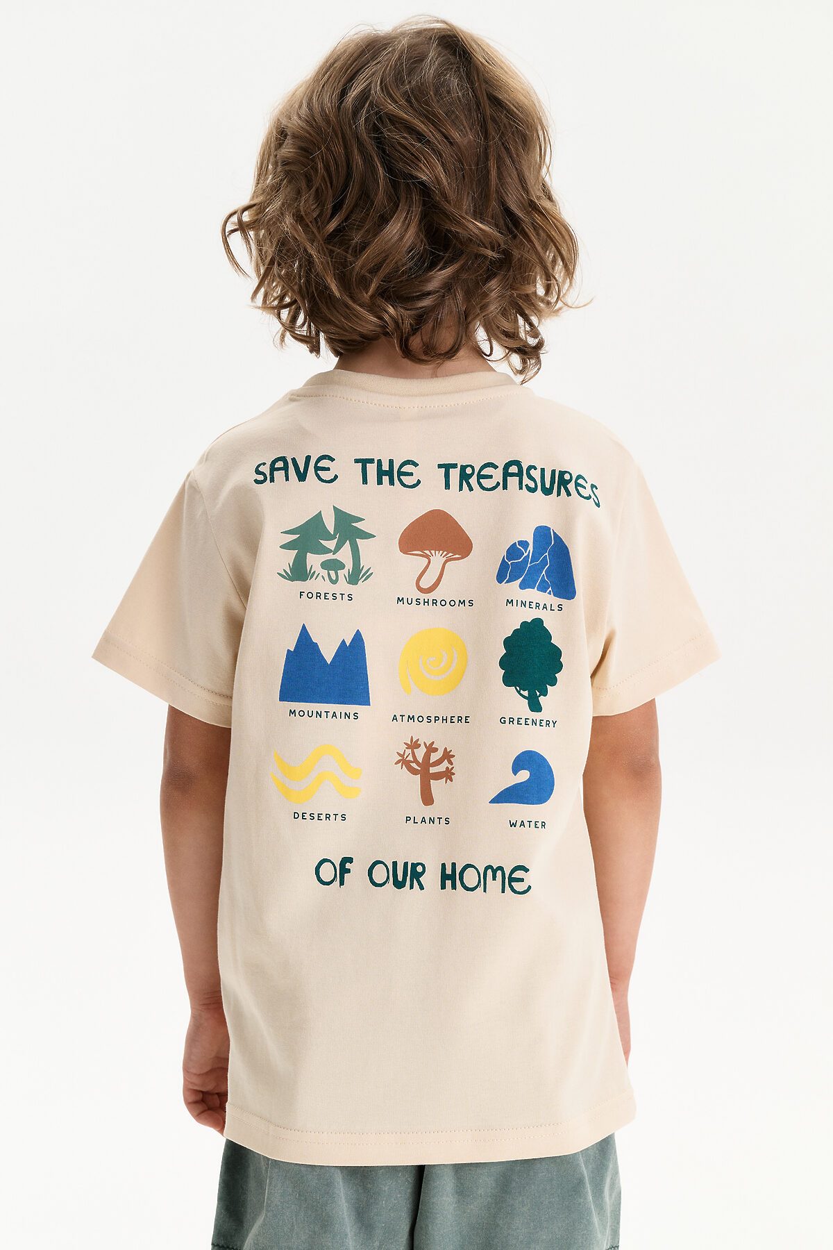 Футболка для мальчика свободного кроя - это идеальный выбор для активного ребенка. Вырез горловины обработан эластичной тканью — она прекрасно держит форму, не растягивается, при этом ребёнку удобно надевать и снимать футболку. Футболка летняя с принтом на спине и надписями. Выполнена из 100% высококачественного хлопка. Перевод надписей "save the treasures of our home" - сохрани сокровища нашего дома, "forests, mushrooms, minerals, mountains, atmoshpere, greenery, deserts, plants, water" - леса, грибы, минералы, атмосфера, зелень, пустыни, растения, воду. Спортивная футболка подходит как для подростков так и для малышей в детский сад. Подходит для любого времени года.