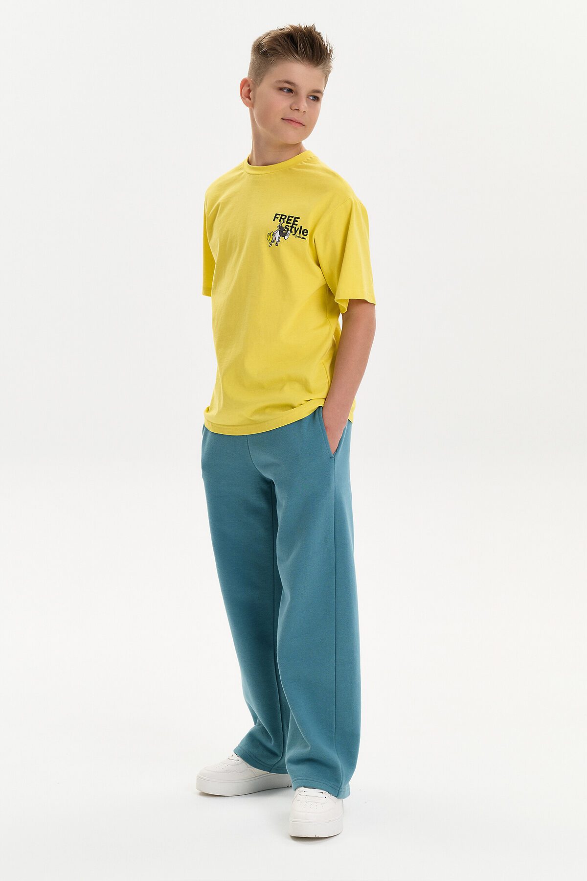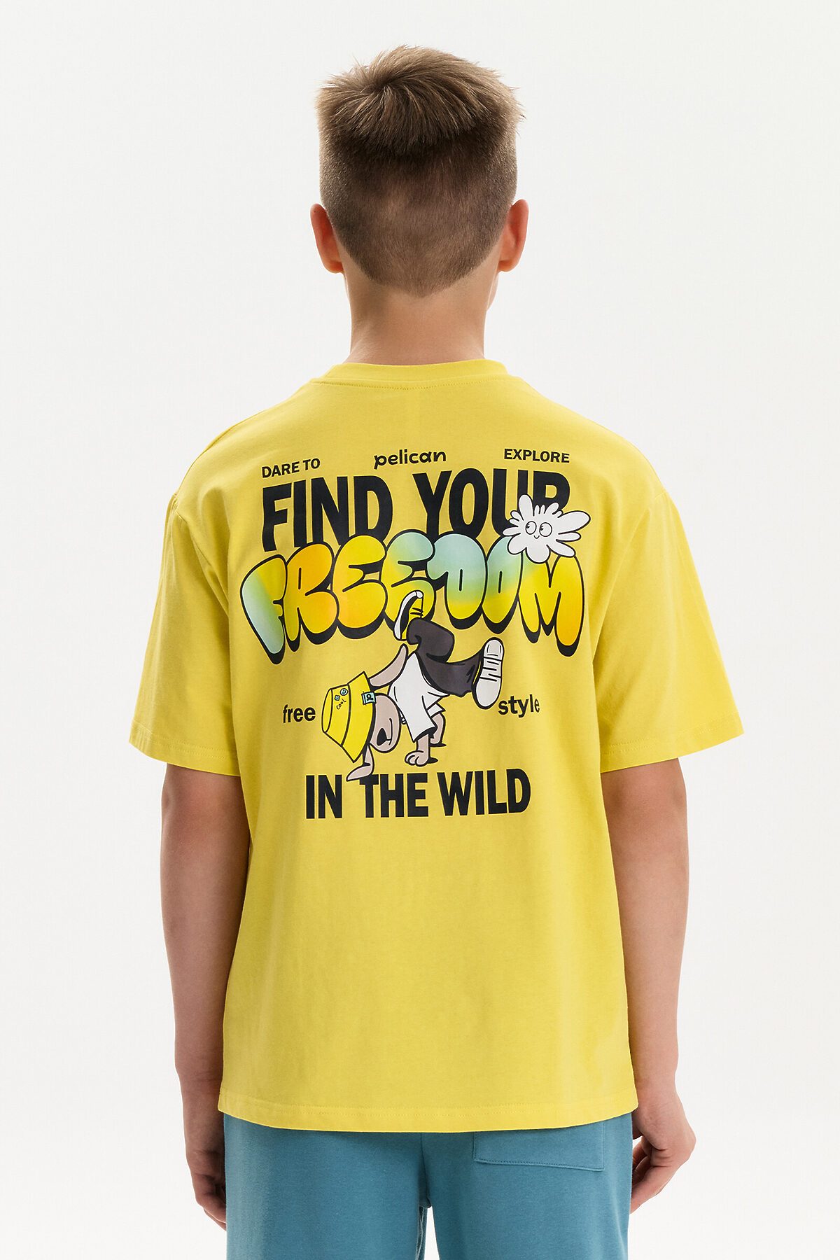 Футболка для мальчика. Комфортная, умеренного оверсайз-объёма со спущенным плечом. Вырез горловины обработан эластичной рибаной (ткань в рубчик) — она отлично держит форму, не растягивается, при этом ребёнку удобно надевать и снимать футболку. Перевод спереди: свободный стиль, перевод на спике: осмельтесь исследовать: Найди свою свободу: Свободный стиль: В дикой природе.