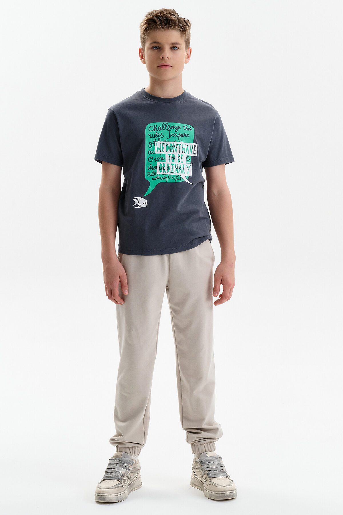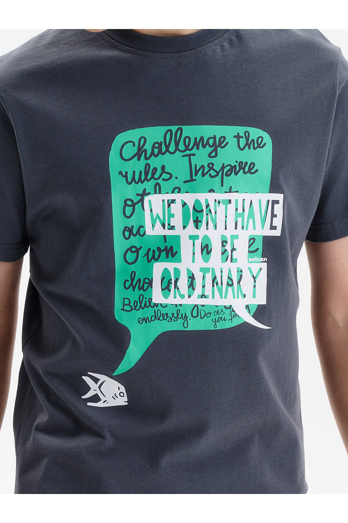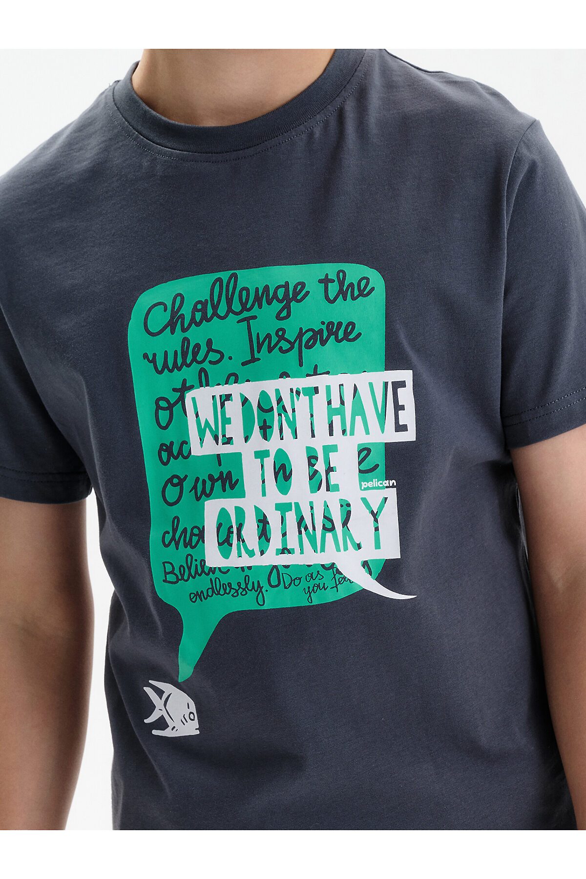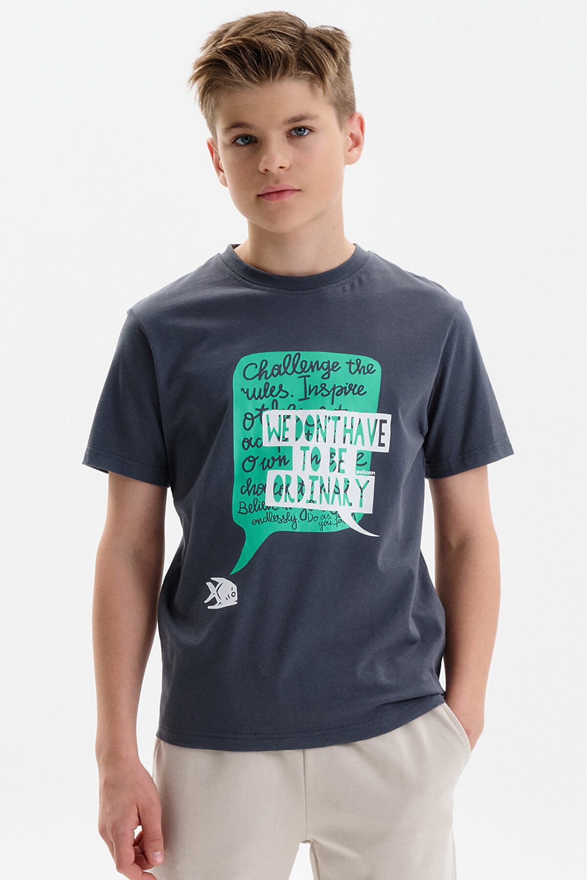 Футболка для мальчика маленького объема. Вырез горловины обработан эластичной рибаной — она прекрасно держит форму, не растягивается, при этом ребёнку удобно надевать и снимать футболку. Футболка с принтом и надписями. Перевод: бросай вызов правилам: Вдохновляй других: принимать собственные уникальные особенности: бесконечно верь в себя: Делай как чувствуешь: Нам не обязательно быть обычными.
