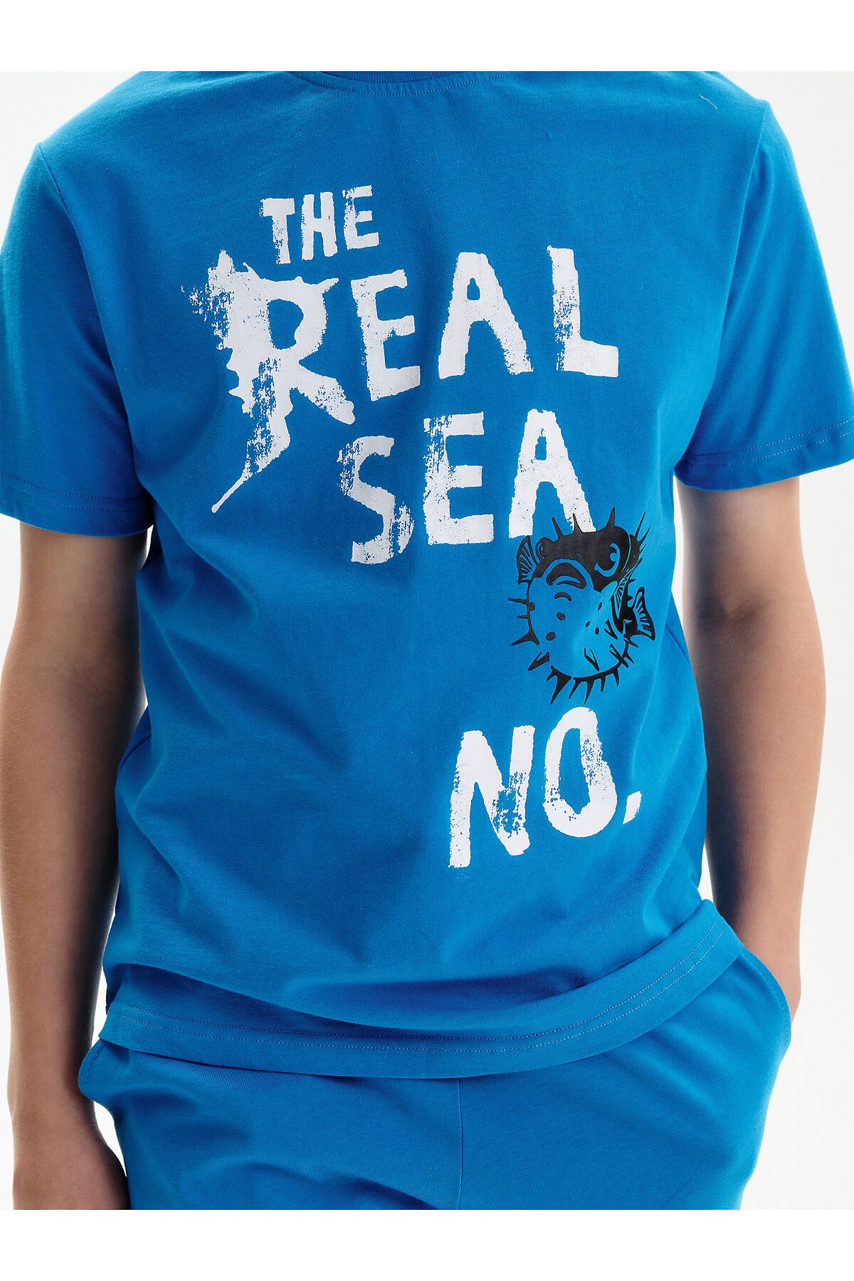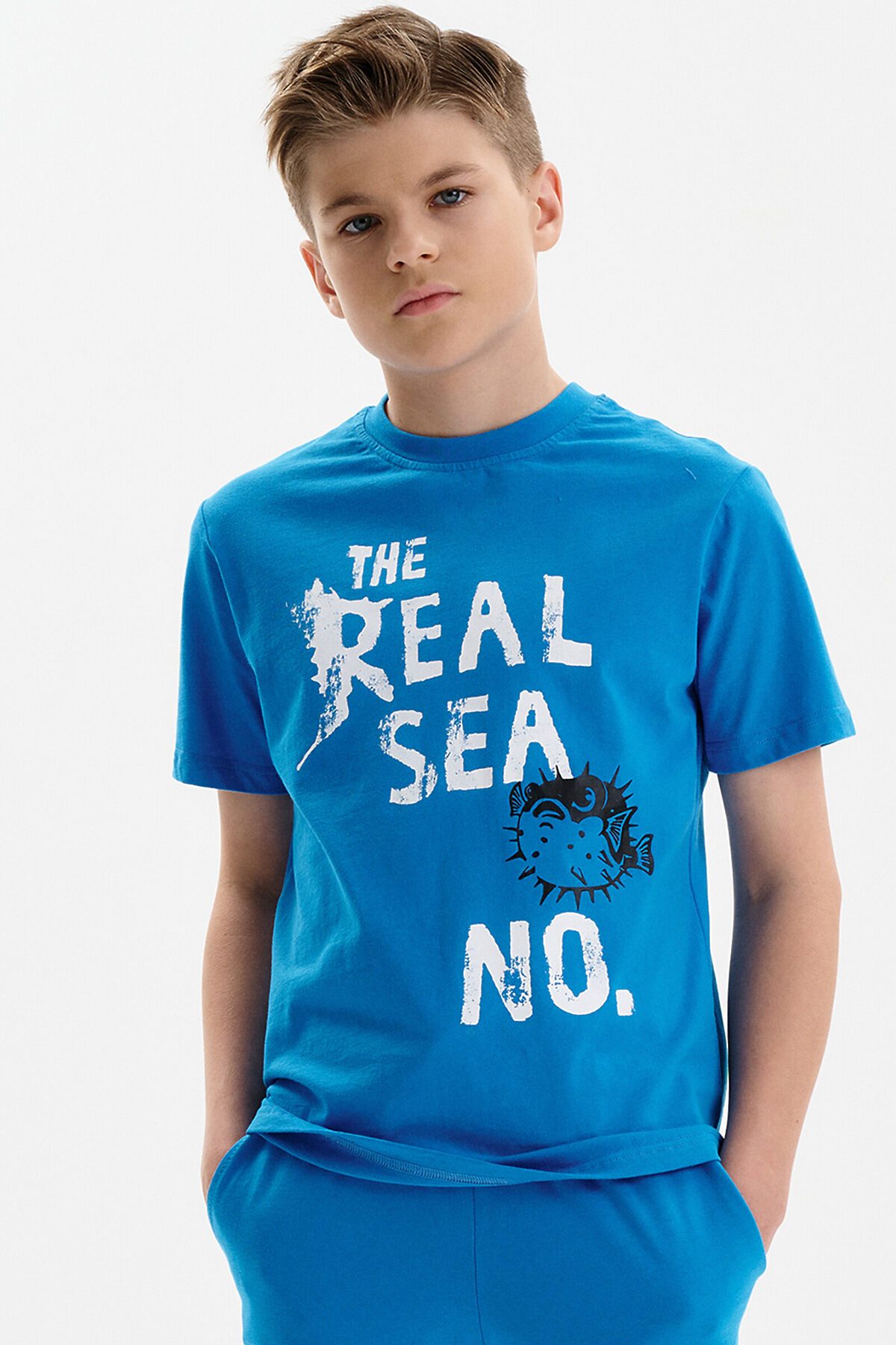 Футболка для мальчика маленького объема. Вырез горловины обработан эластичной рибаной — она прекрасно держит форму, не растягивается, при этом ребёнку удобно надевать и снимать футболку. Футболка с принтом и надписями. Перевод: настоящее море: нет: да.