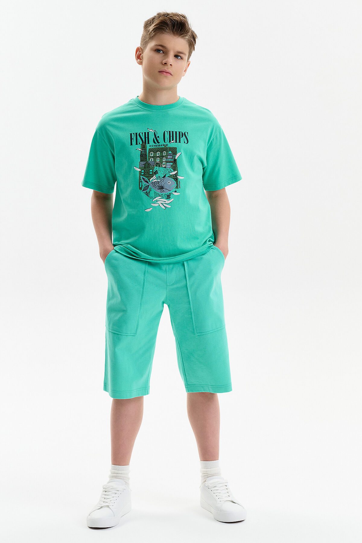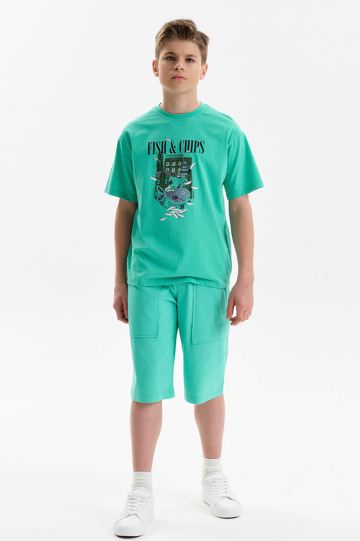 Футболка для мальчика прямого кроя умеренного объема. Вырез горловины обработан эластичной рибаной — она прекрасно держит форму, не растягивается, при этом ребёнку удобно надевать и снимать футболку. Футболка с принтом и надписями. Перевод текста: Рыба с картофелем фри: Попробуйте с рыбой дня: Морская соль: Сообщество: Жизнь прекрасна: Увидимся позже.