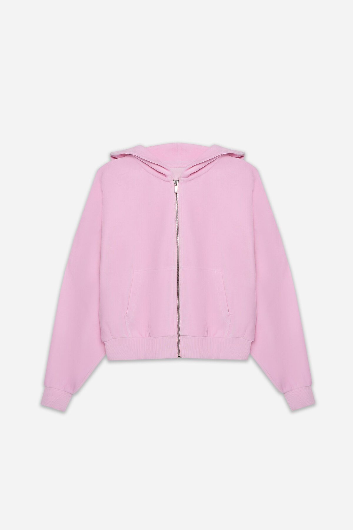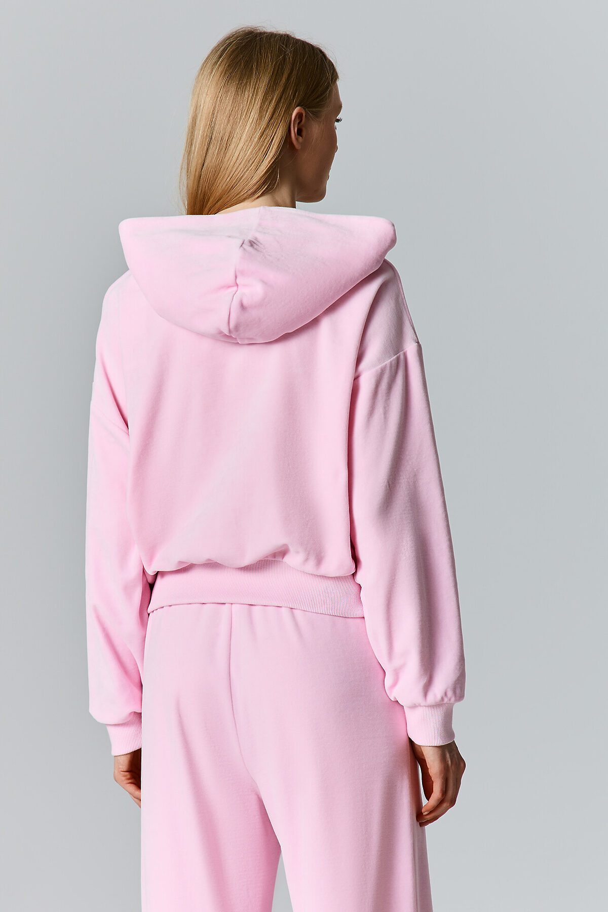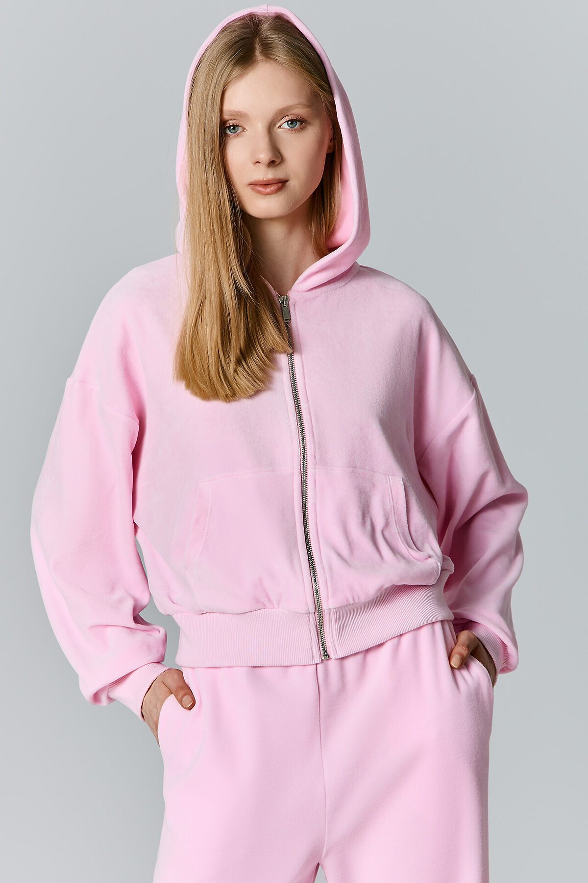 Толстовка женская свободного силуэта. Перед и спинка цельнокроеные. Рукава длинные, втачные. По переду центральная застежка на металлическую молнию и накладные карманы. Горловина обработана капюшоном. По низу рукавов манжеты, пояс и манжеты из рибаны.