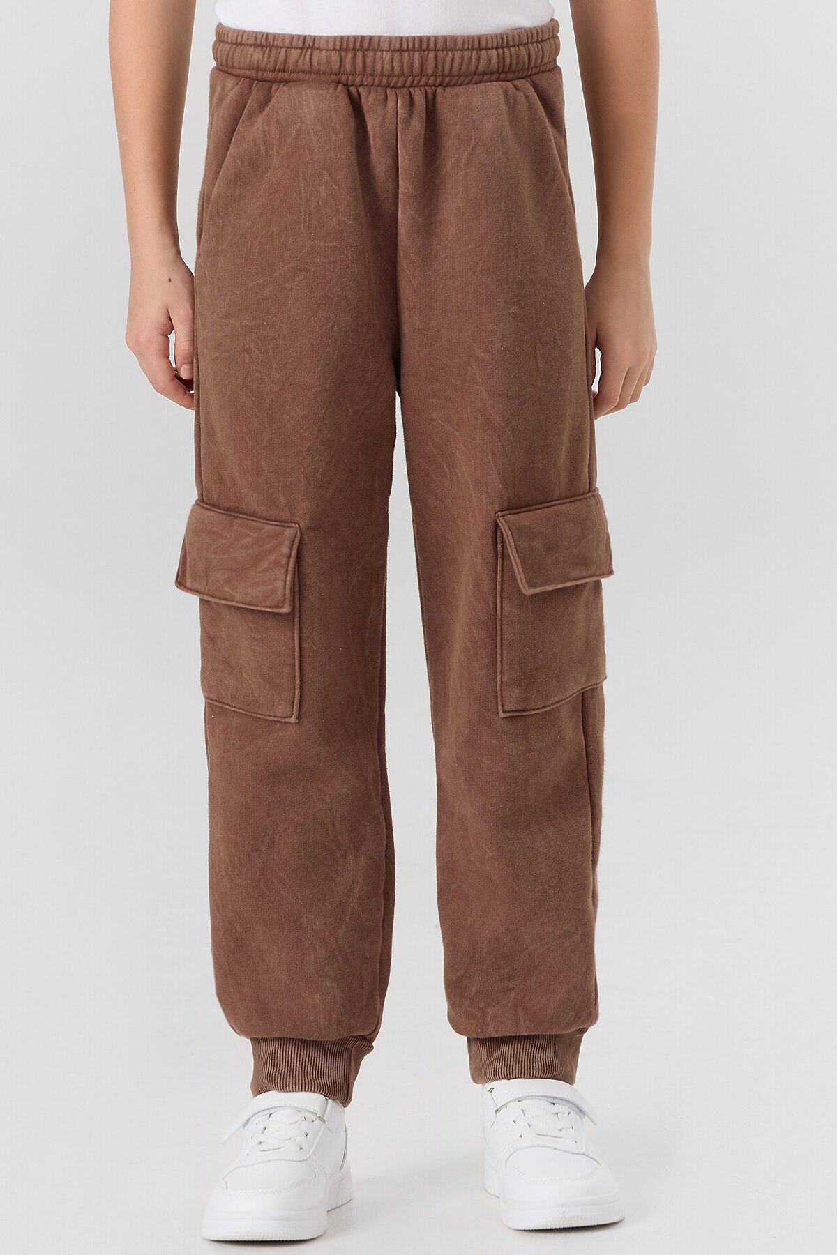 Брюки джогеры. Посадка средняя. На передних деталях карманы "хулиганы". Подкладка карманов из основного полотна. Пояс отрезной с эластичной тесьмой 40RV, отстрочен. Внутри в поясе пробиты петли и протянут шнур 10-PXC2. На боковых деталях накладные карманы с клапанами. Низ брюк обработан рибаной.