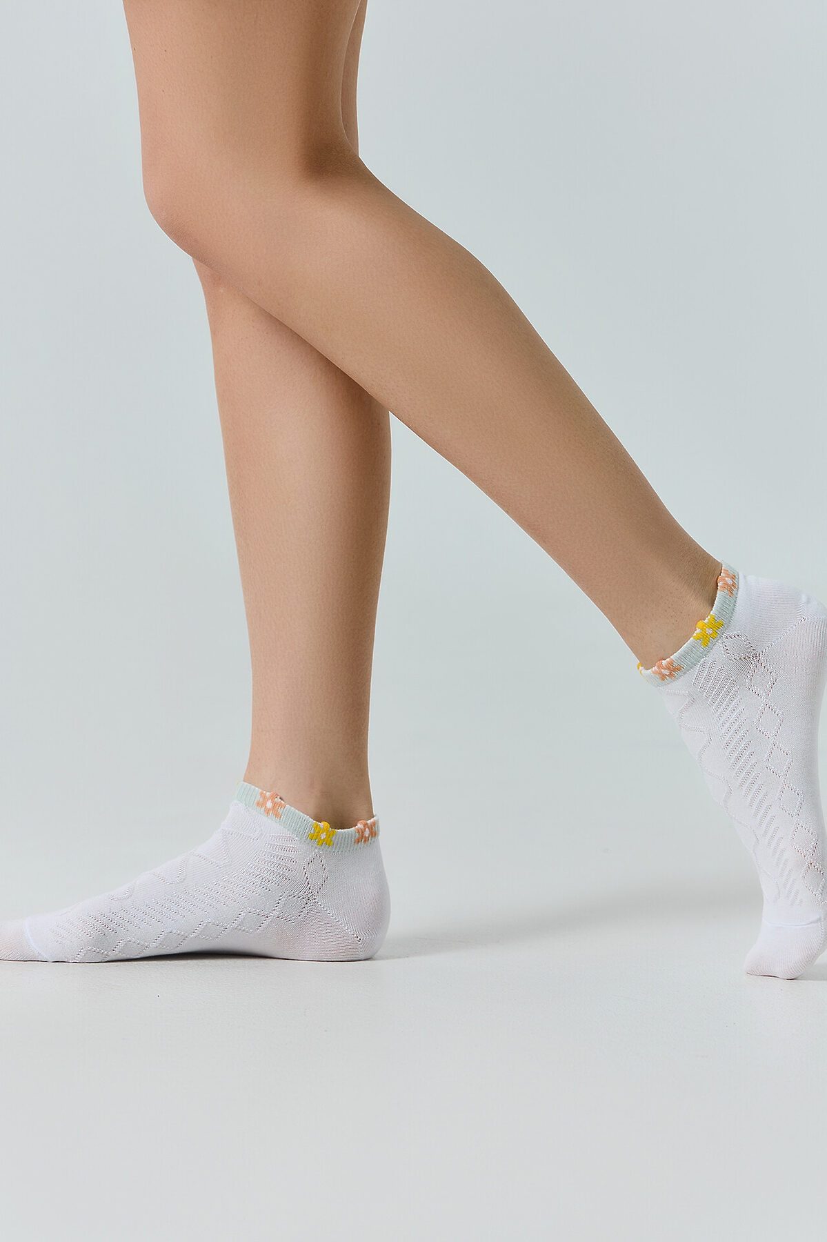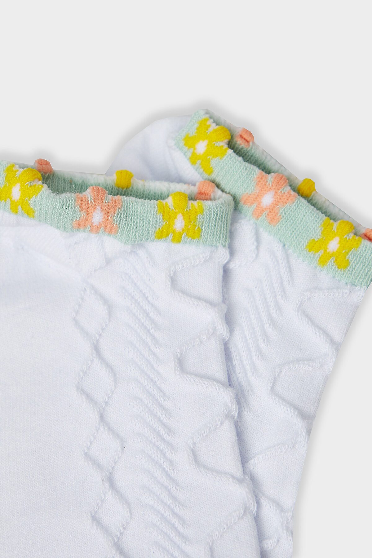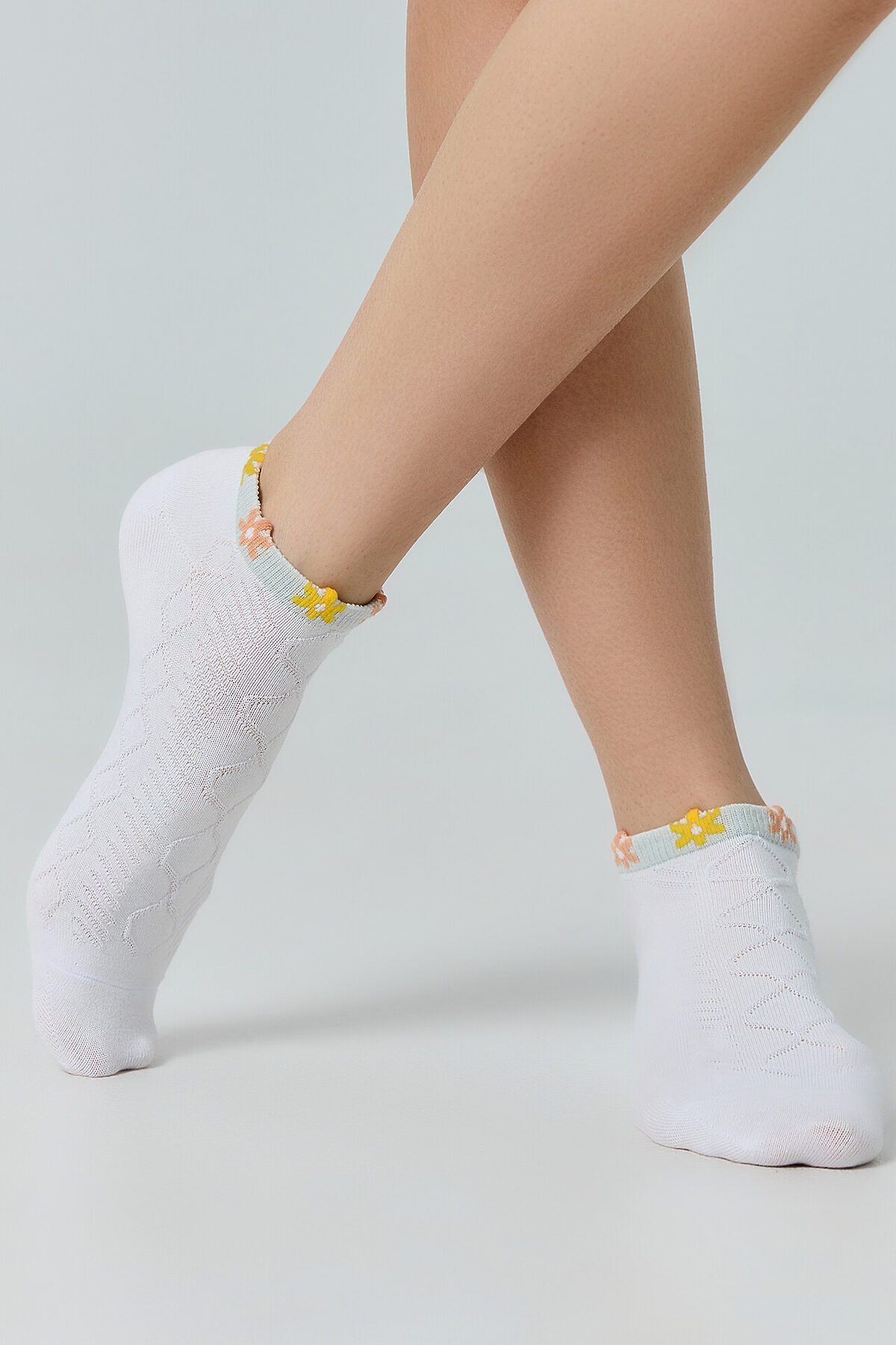 рис.3154 Женские укороченные носки, выработанные перекидным переплетением с рельефным рисунком и пикотом на бортике в виде ромашек.