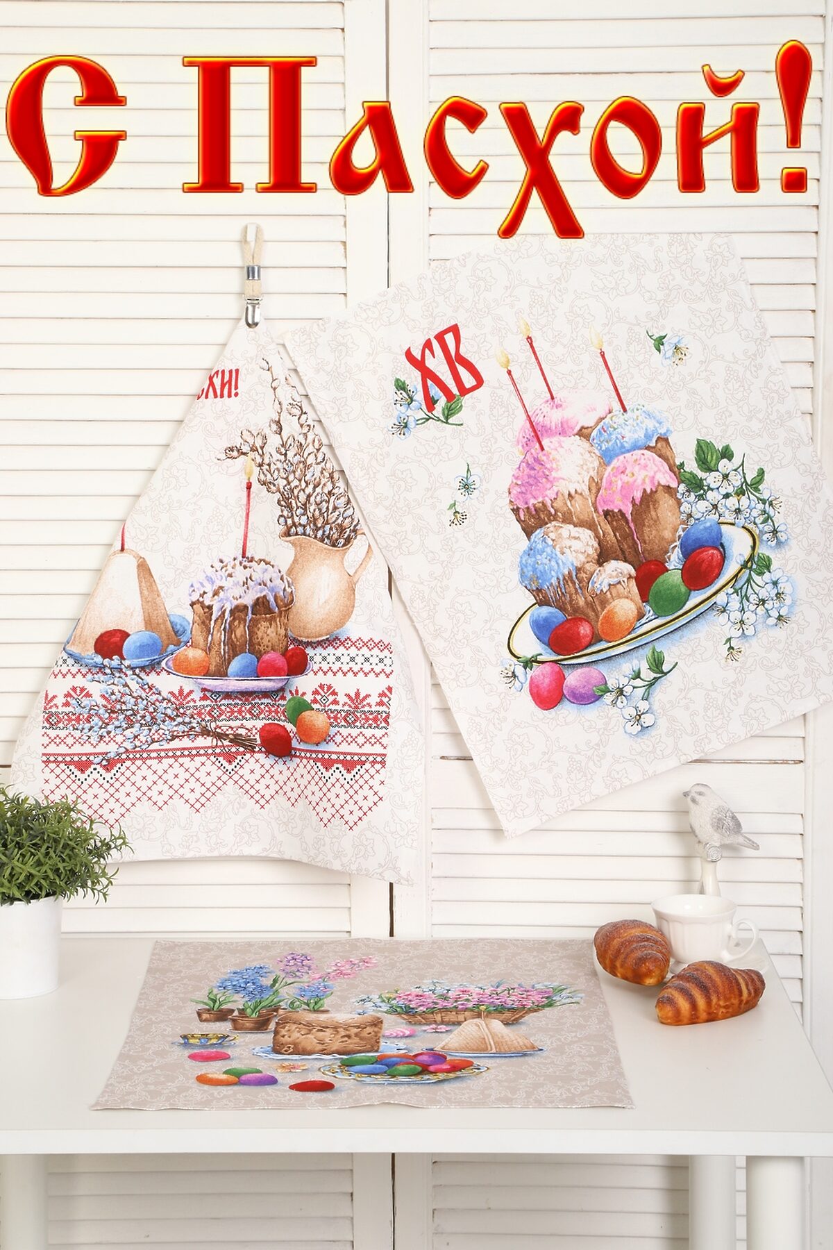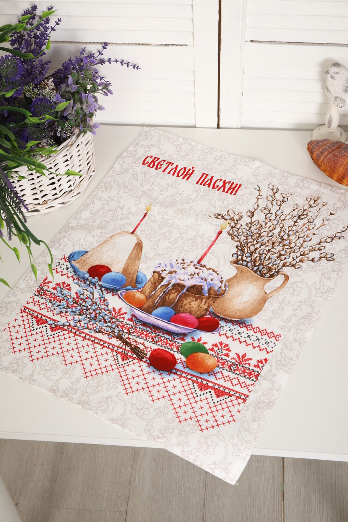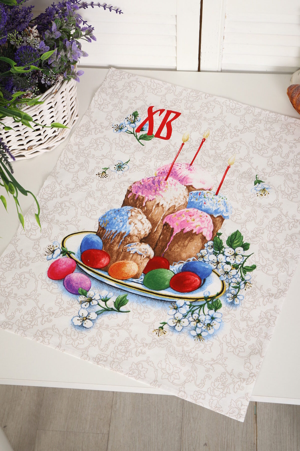 Набор из трех кухонных полотенец размером 60*48 см. Выполнены из прочного хлопчатобумажного полотна - рогожка. Отлично впитывают влагу, сохраняют цвет и форму после стирки. Каждое полотенце с индивидуальным рисунком, посвященным светлому празднику Пасхи Христовой. Порадуйте себя и своих близких приятным подарком на праздник!