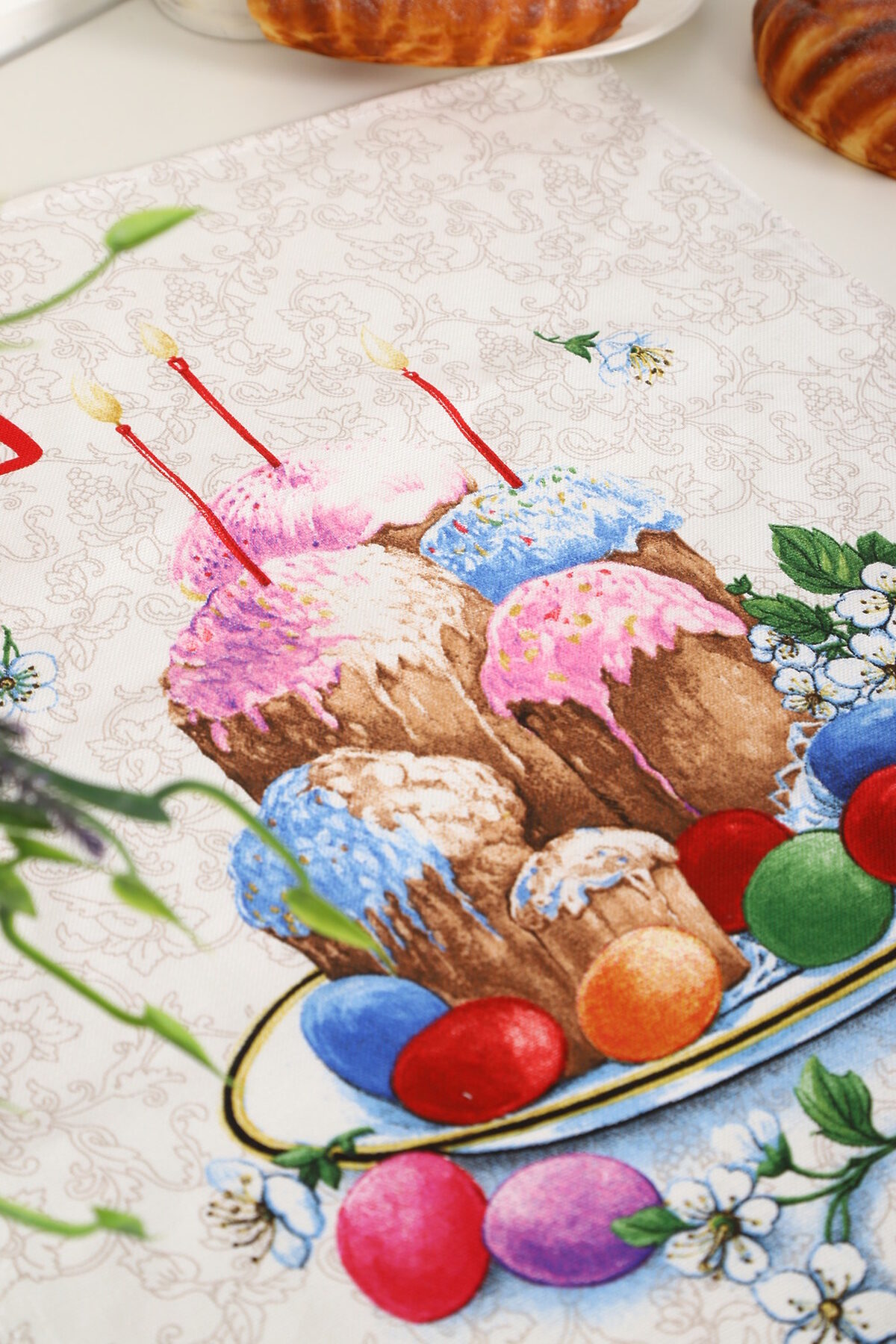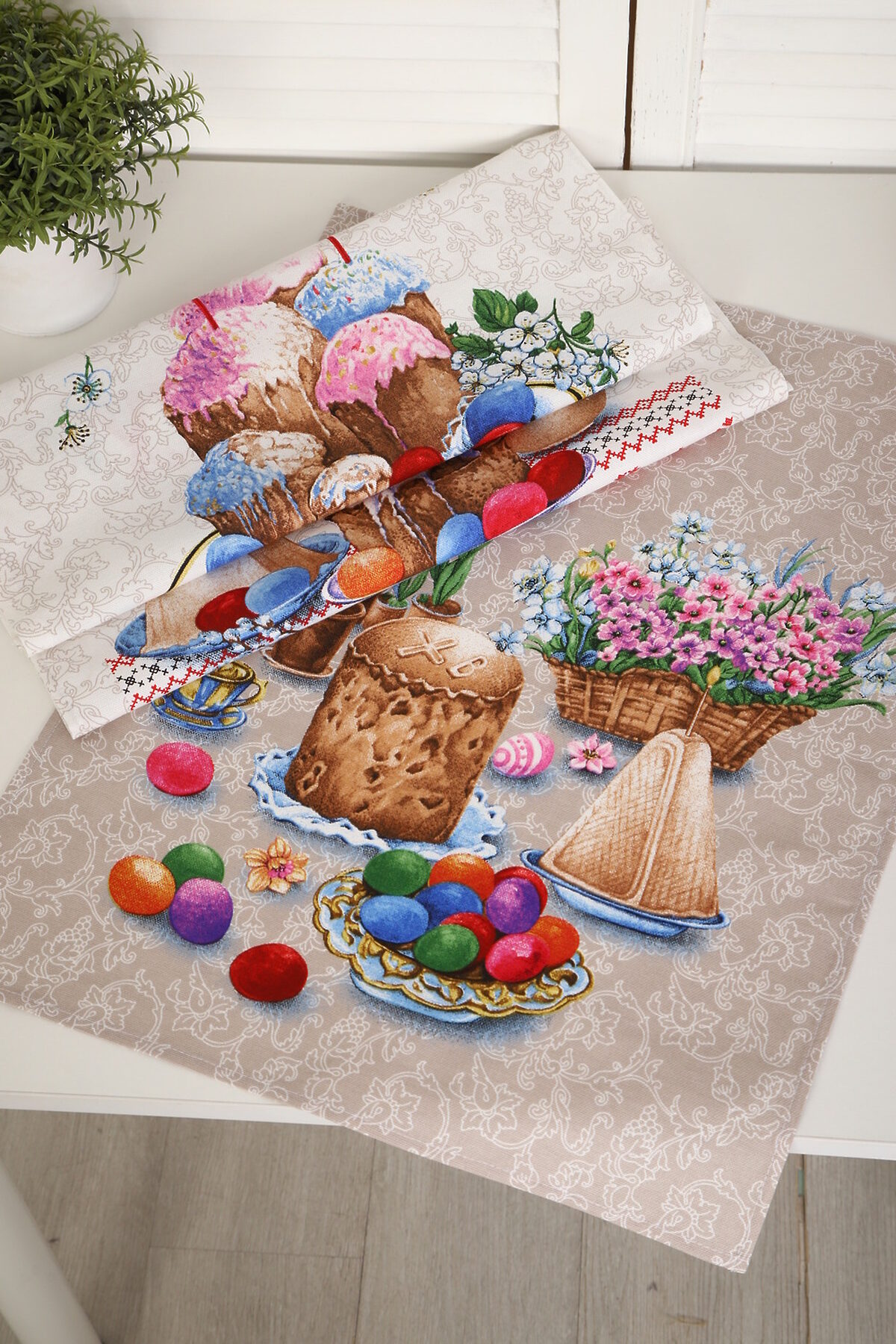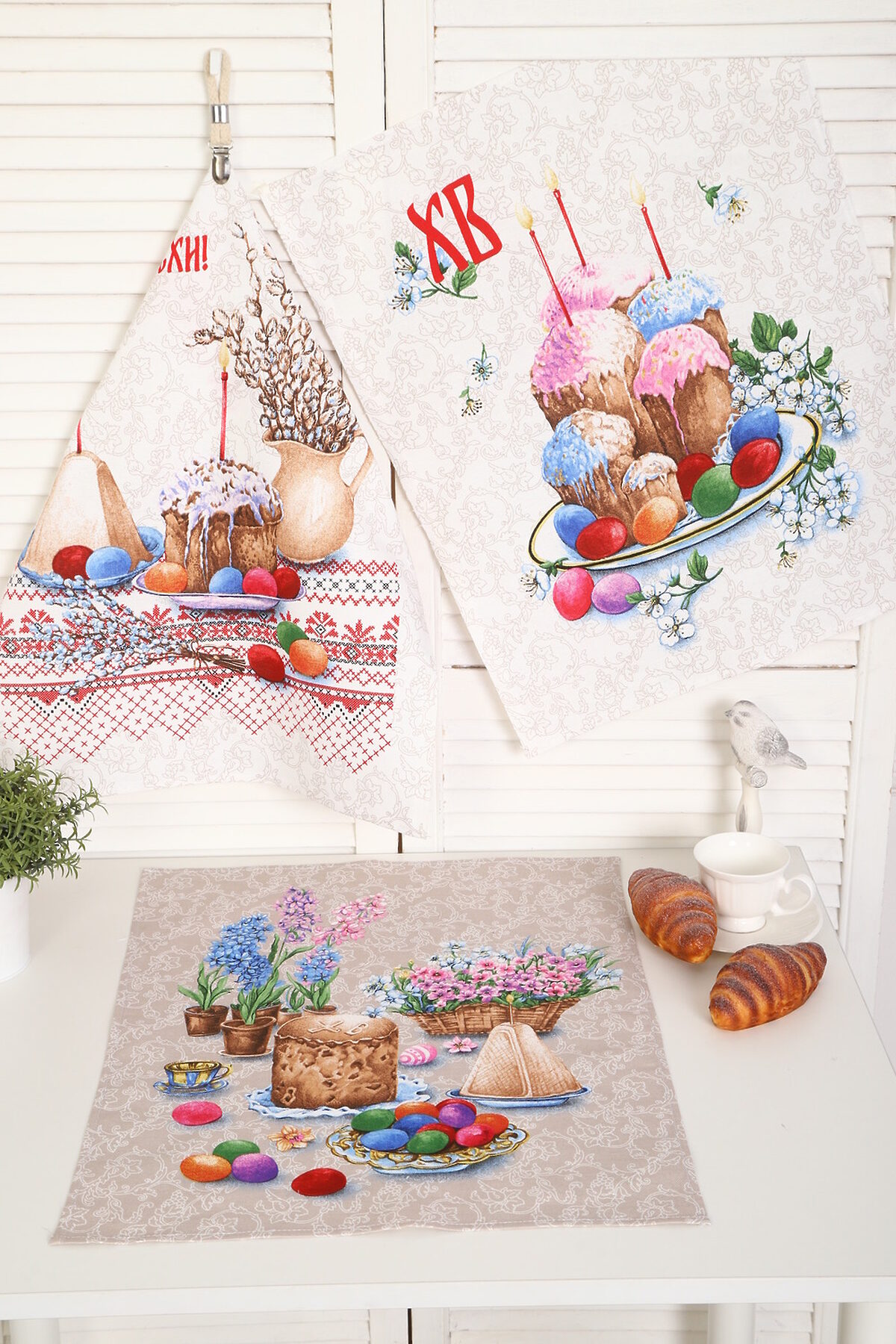 Набор из трех кухонных полотенец размером 60*48 см. Выполнены из прочного хлопчатобумажного полотна - рогожка. Отлично впитывают влагу, сохраняют цвет и форму после стирки. Каждое полотенце с индивидуальным рисунком, посвященным светлому празднику Пасхи Христовой. Порадуйте себя и своих близких приятным подарком на праздник!