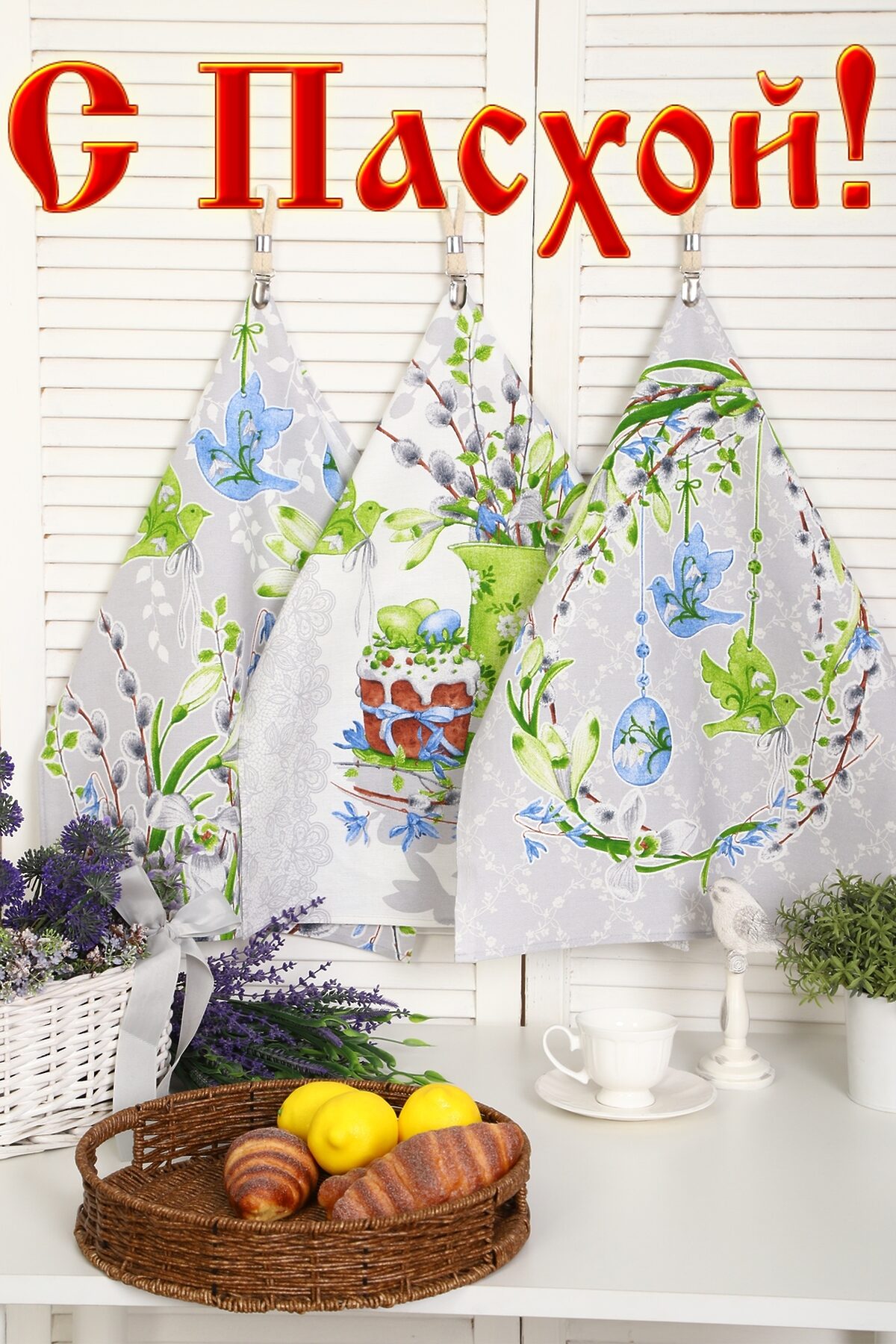 Набор из трех кухонных полотенец размером 60*48 см. Выполнены из прочного хлопчатобумажного полотна - рогожка. Отлично впитывают влагу, сохраняют цвет и форму после стирки. Каждое полотенце с индивидуальным рисунком, посвященным светлому празднику Пасхи Христовой. Порадуйте себя и своих близких приятным подарком на праздник!