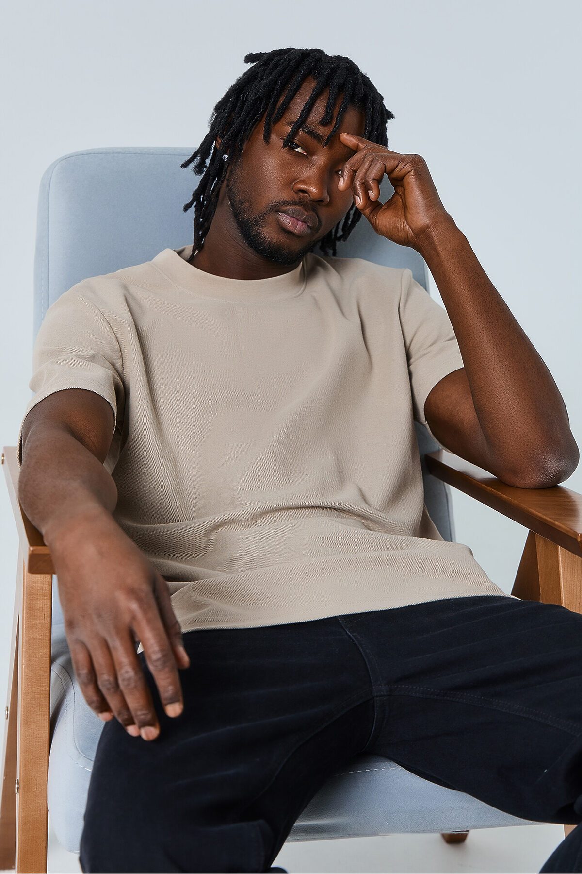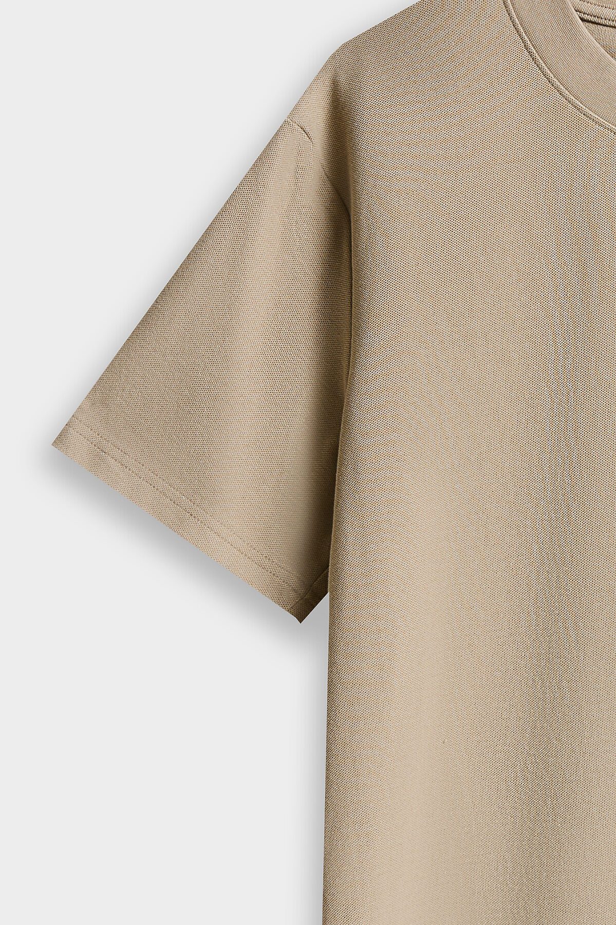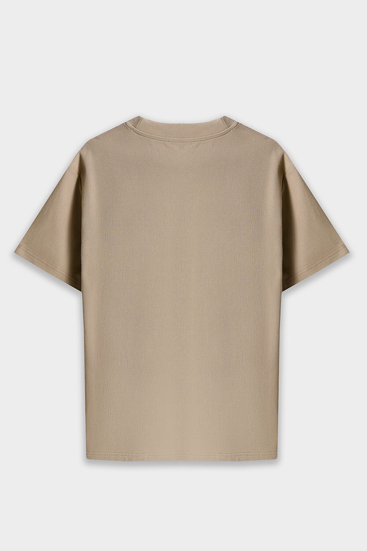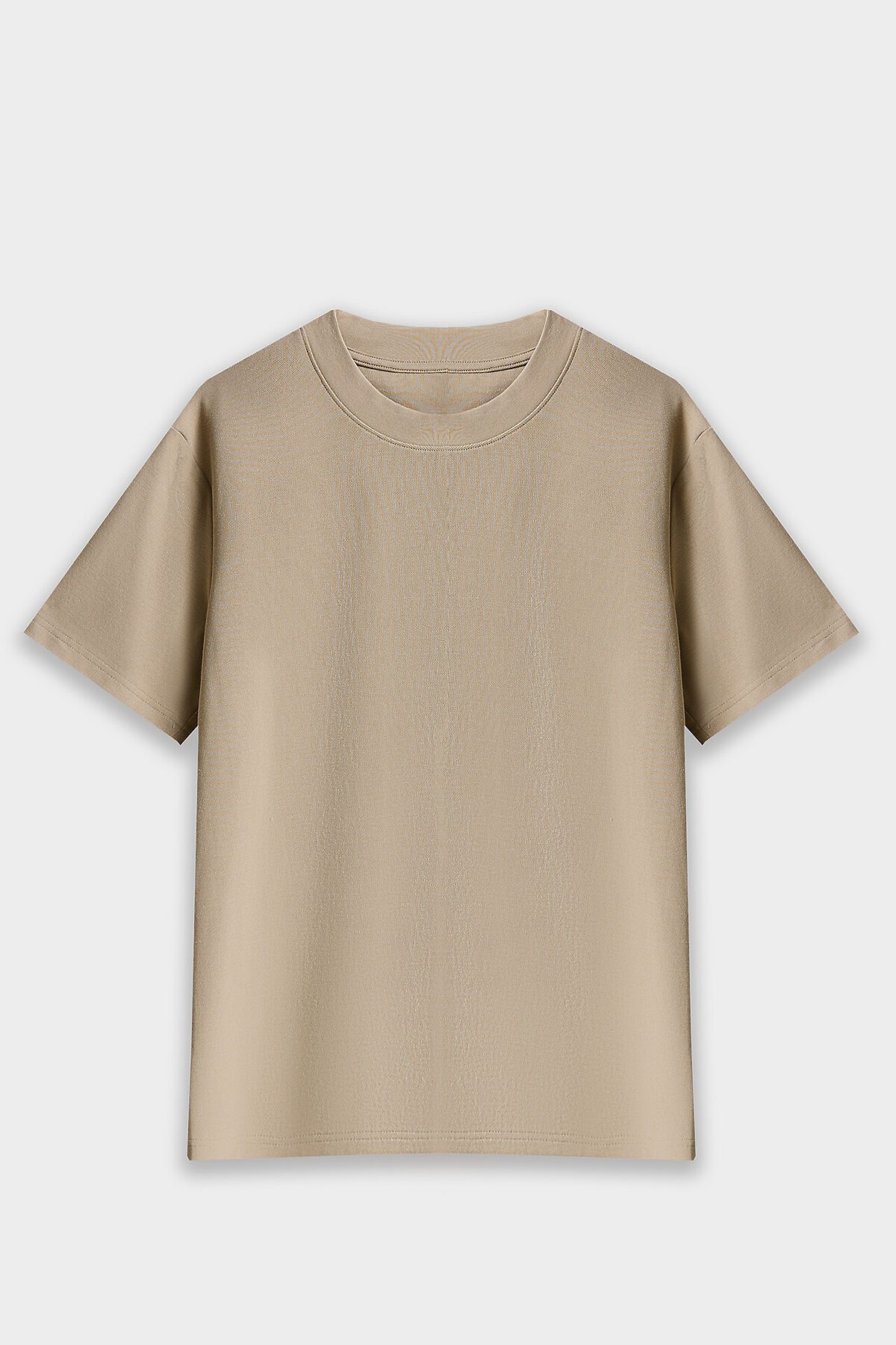 Футболка свободного силуэта. Рукава короткие втачные. Горловина округлой формы из трикотажного полотна рибана, по спинке закрыта бейкой из основного полотна . Нижний срез футболки и рукавов обработан швом в подгибку на 2х игольной плоскошовной машине.