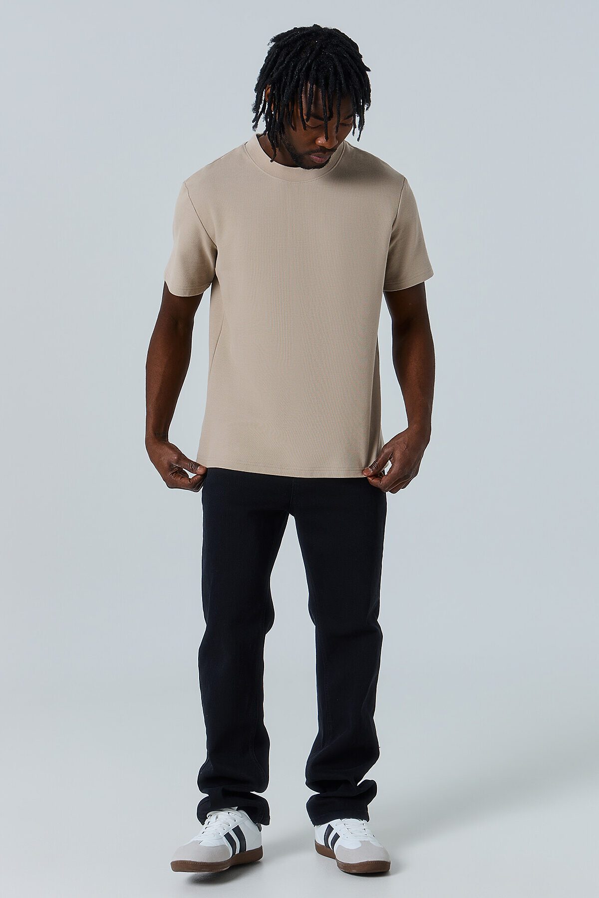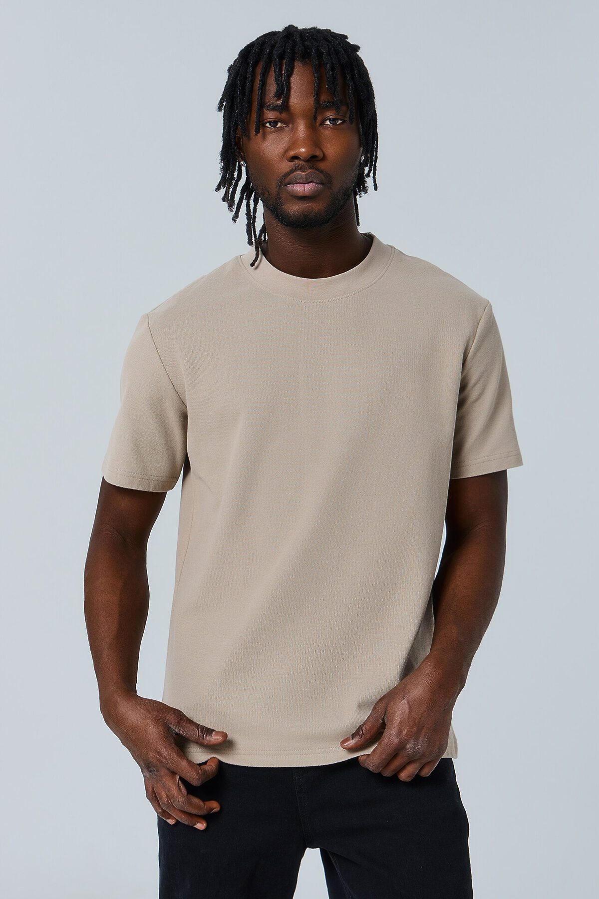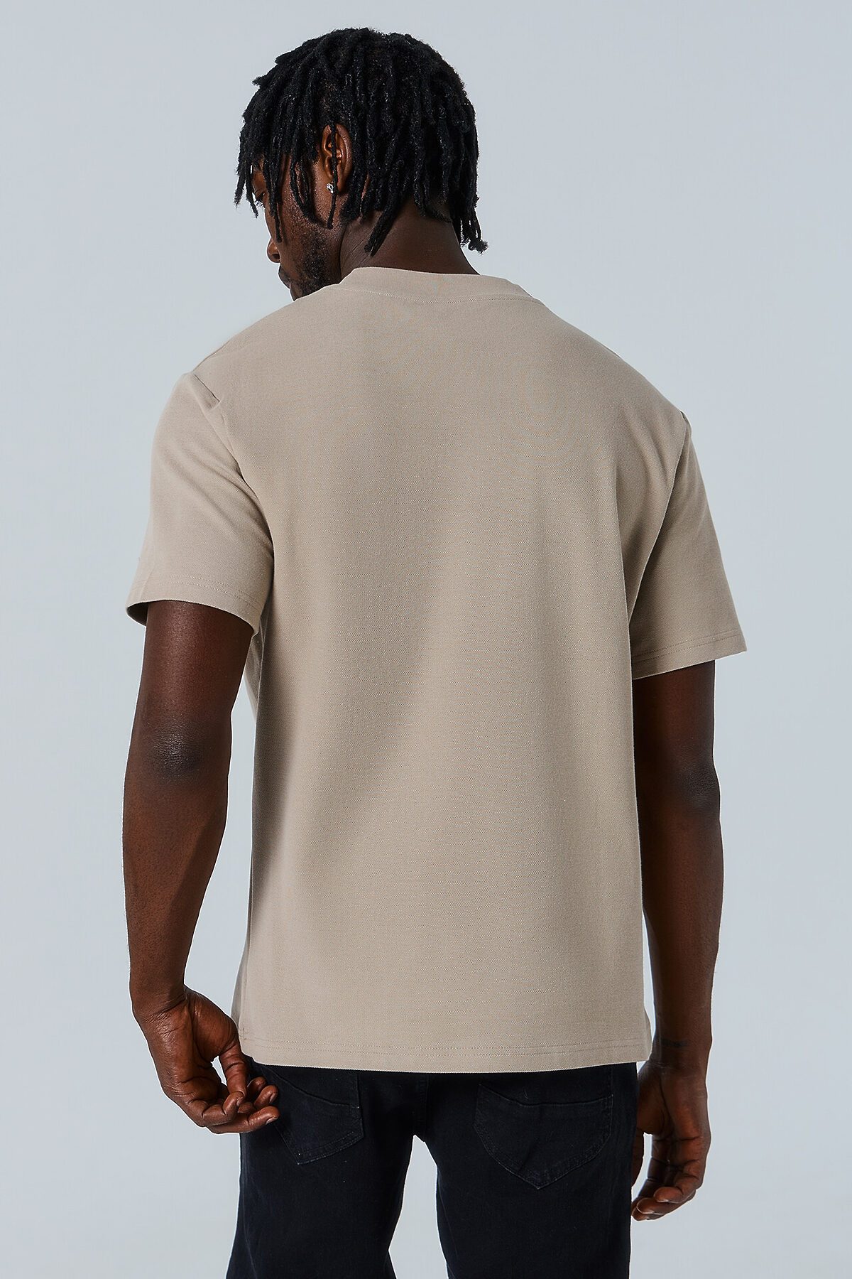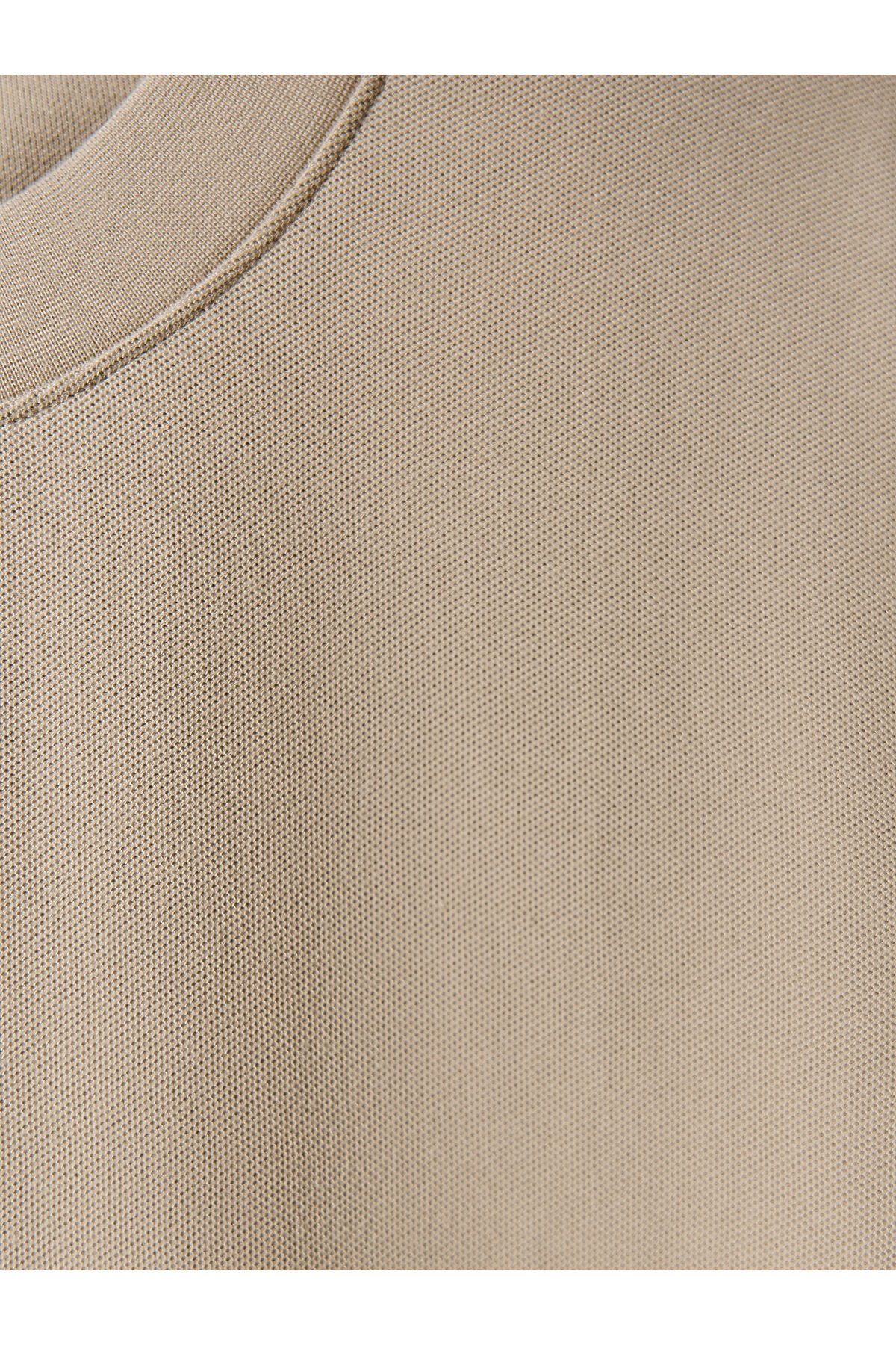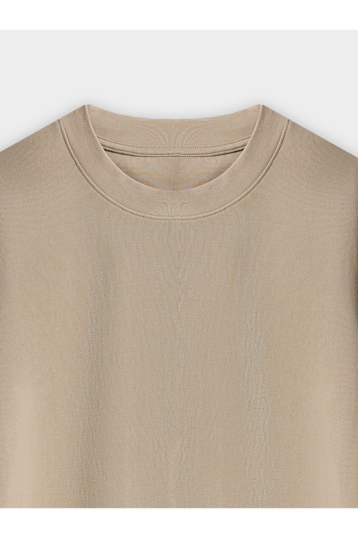 Футболка свободного силуэта. Рукава короткие втачные. Горловина округлой формы из трикотажного полотна рибана, по спинке закрыта бейкой из основного полотна . Нижний срез футболки и рукавов обработан швом в подгибку на 2х игольной плоскошовной машине.