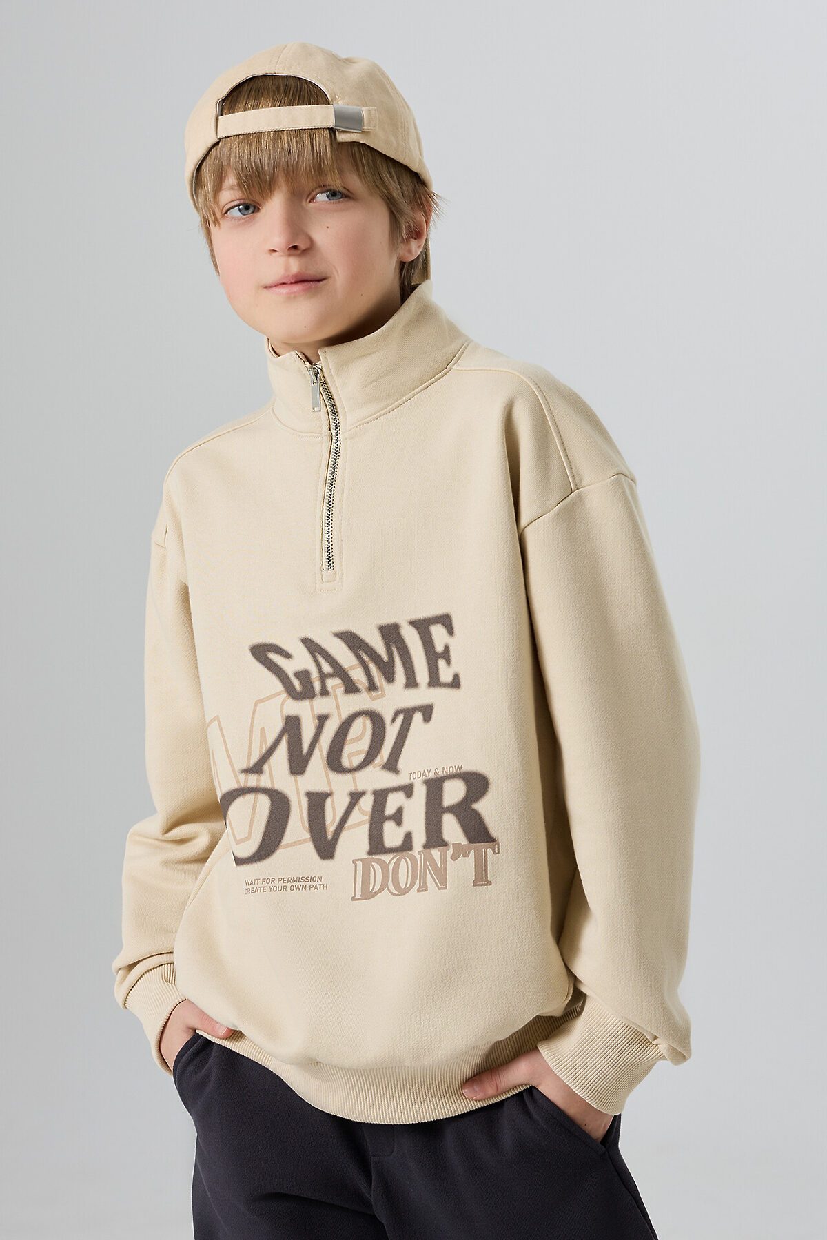 Эта толстовка для мальчиков — стильный и удобный вариант на каждый день. Прямой силуэт обеспечивает комфортную посадку, а округлая горловина с воротником-стойкой из основного полотна добавляет аккуратности и завершенности дизайну. Длинные рукава со слегка спущенной линией плеча придают изделию расслабленный и современный вид. Манжеты на рукавах, обеспечивают удобное прилегание, а центральная застежка на молнию делает толстовку практичной и функциональной. Отрезной пояс из рибаны по нижнему краю добавляет устойчивость форме и комфорт в носке. Изделие изготовлено из хлопкового футера без подчеса, что делает его мягким, воздухопроницаемым и идеальным для повседневных активностей. Прекрасный выбор для прогулок, школы или отдыха, дарящий комфорт и стиль в каждой детали!