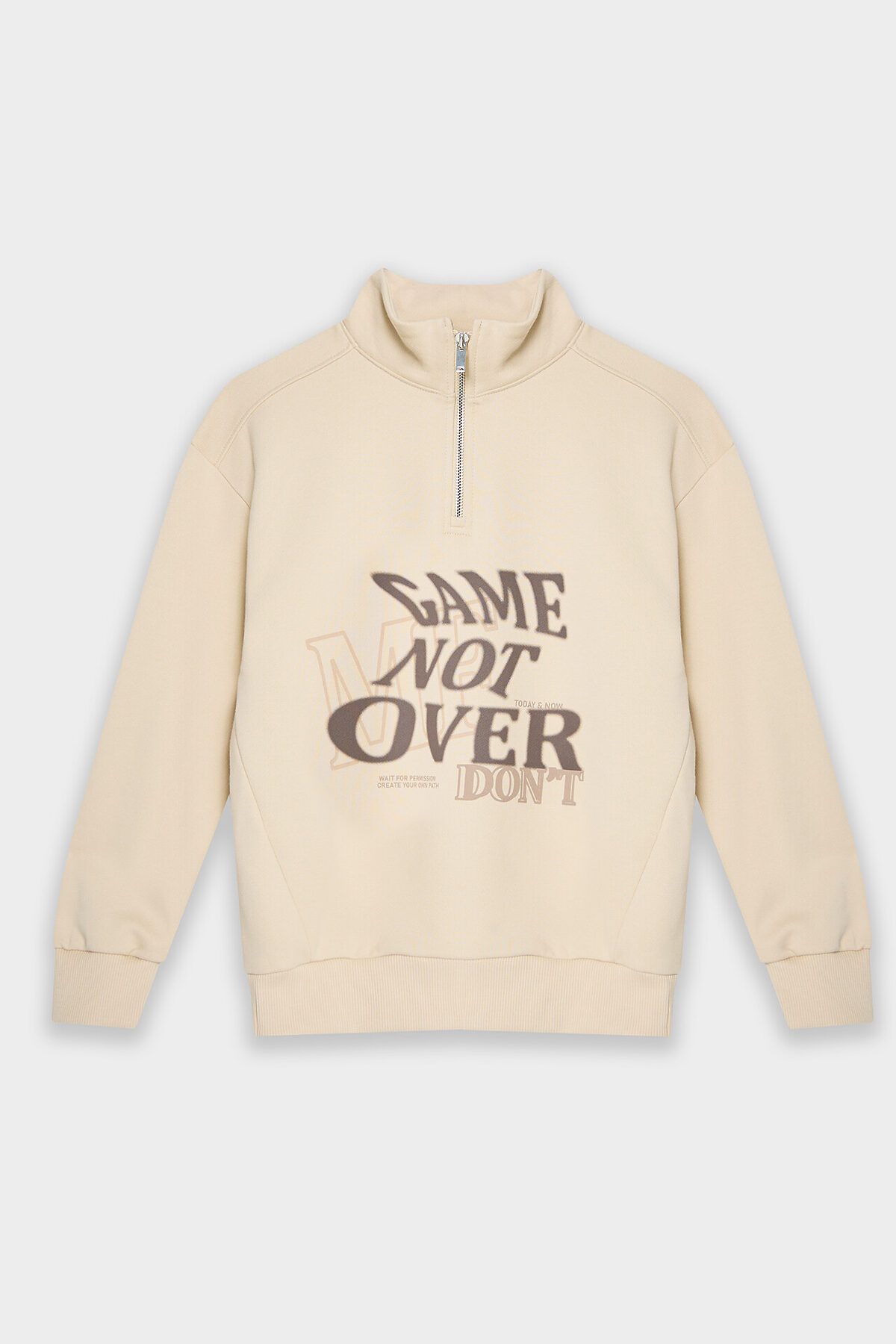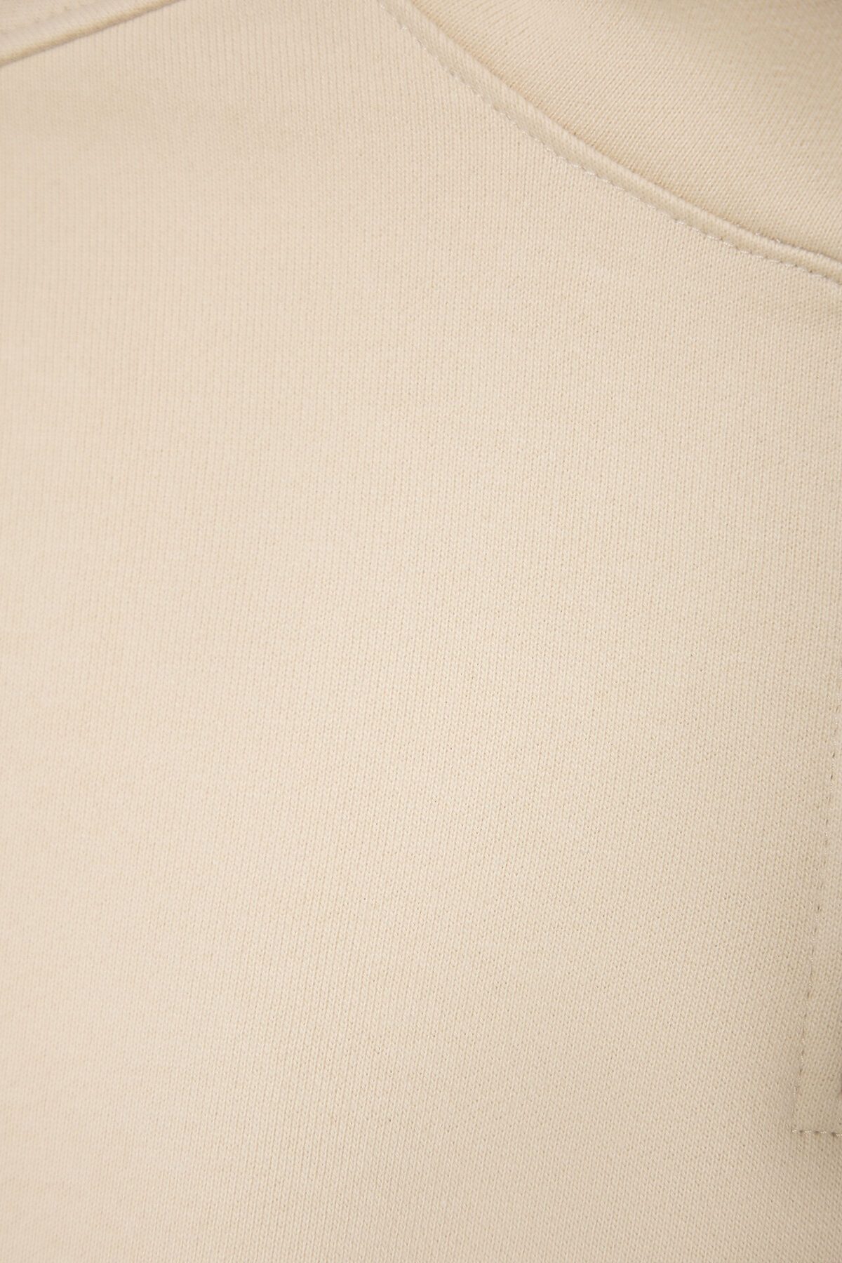Толстовка прямого силуэта. Горловина округлой формы с воротником стойкой из основного полотна. Рукава втачные длинные. Линия плеча слегка спущена. По низу рукавов отрезные манжеты. Центральная застежка на тесьму молнию. По низу джемпера отрезной пояс из рибаны