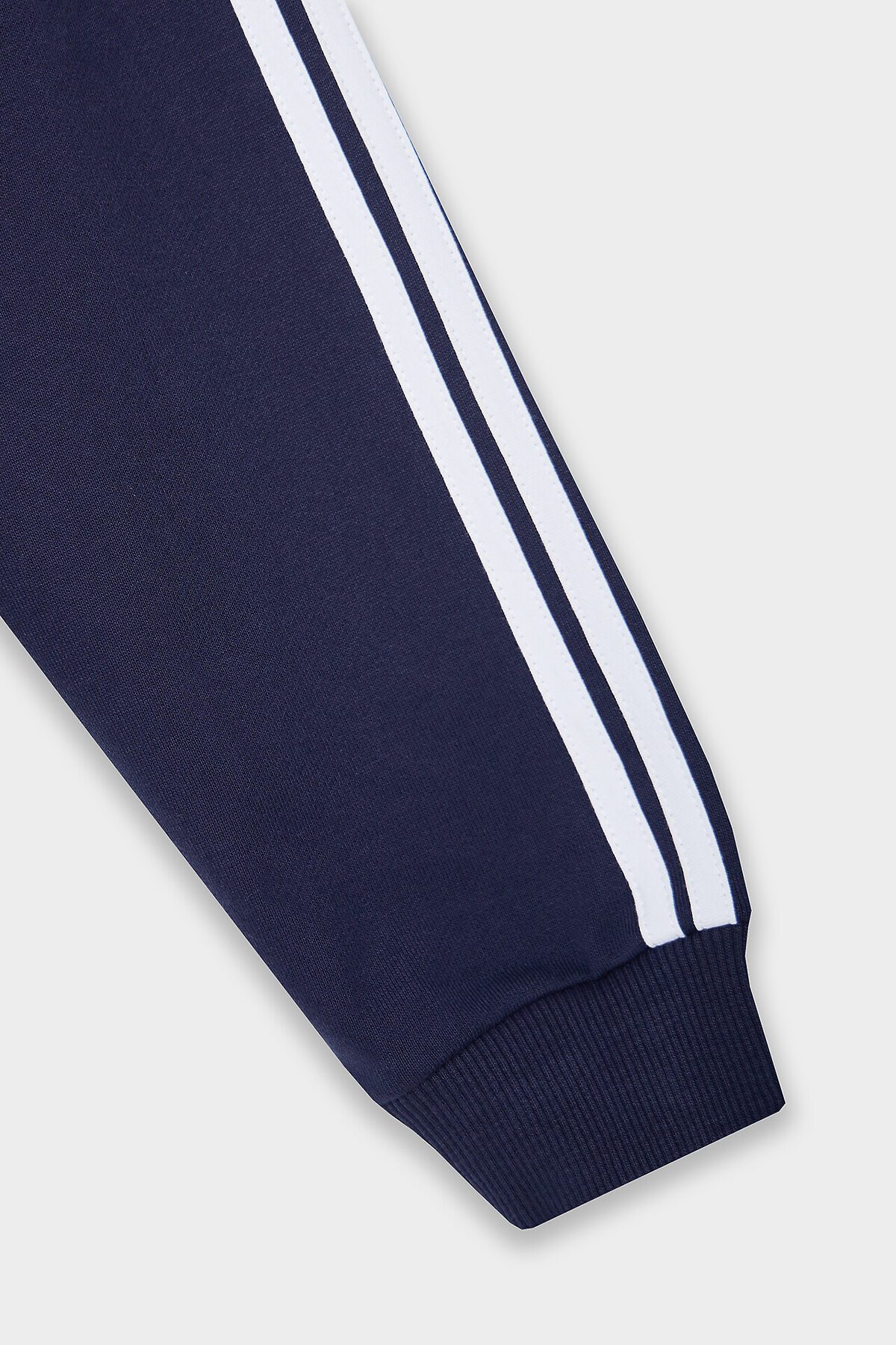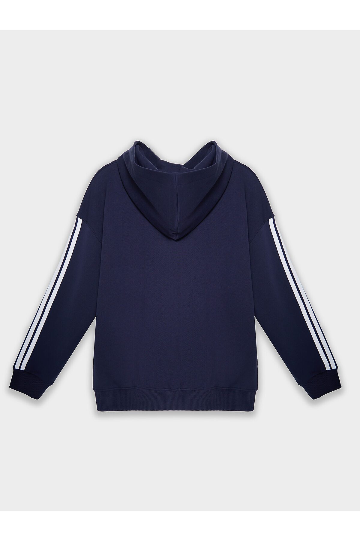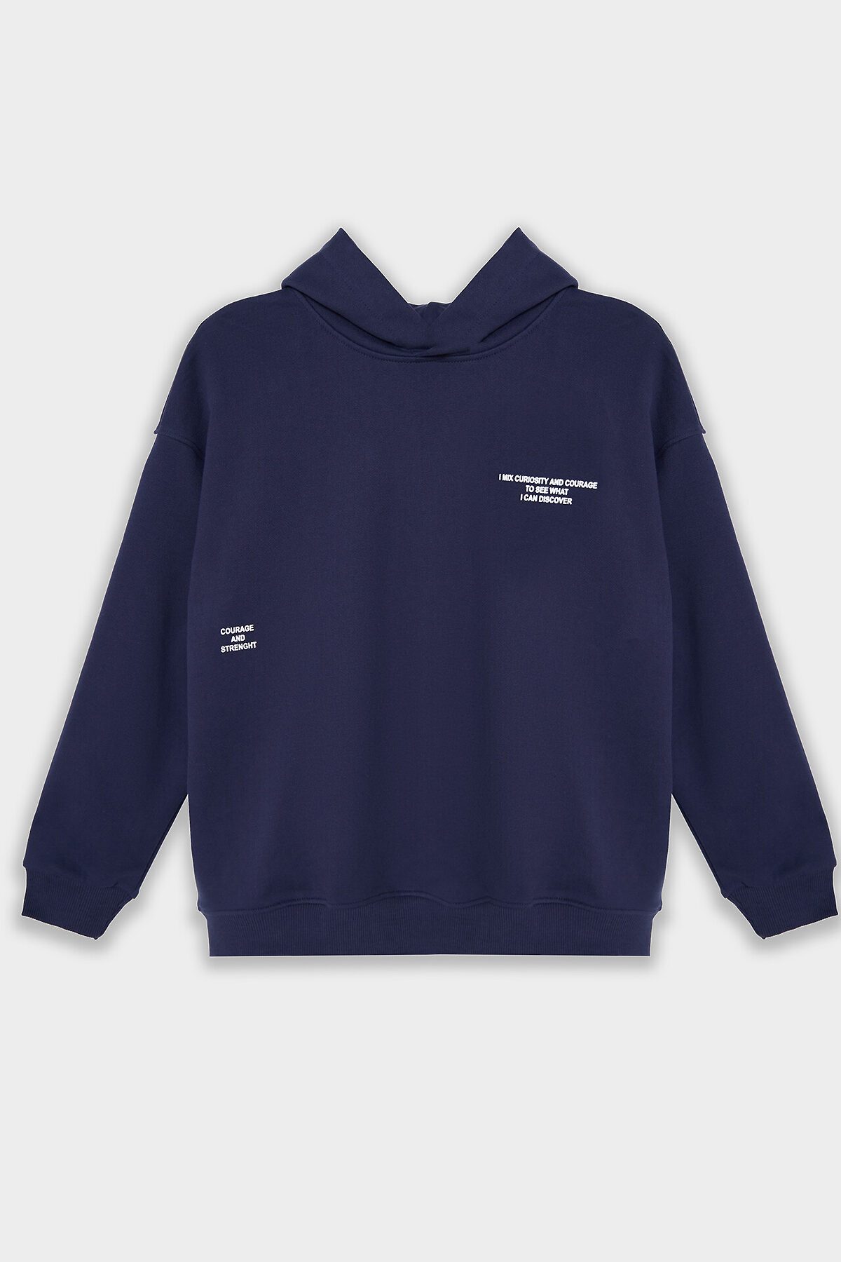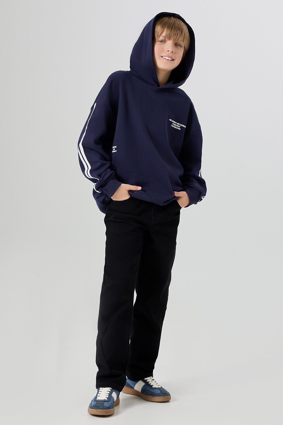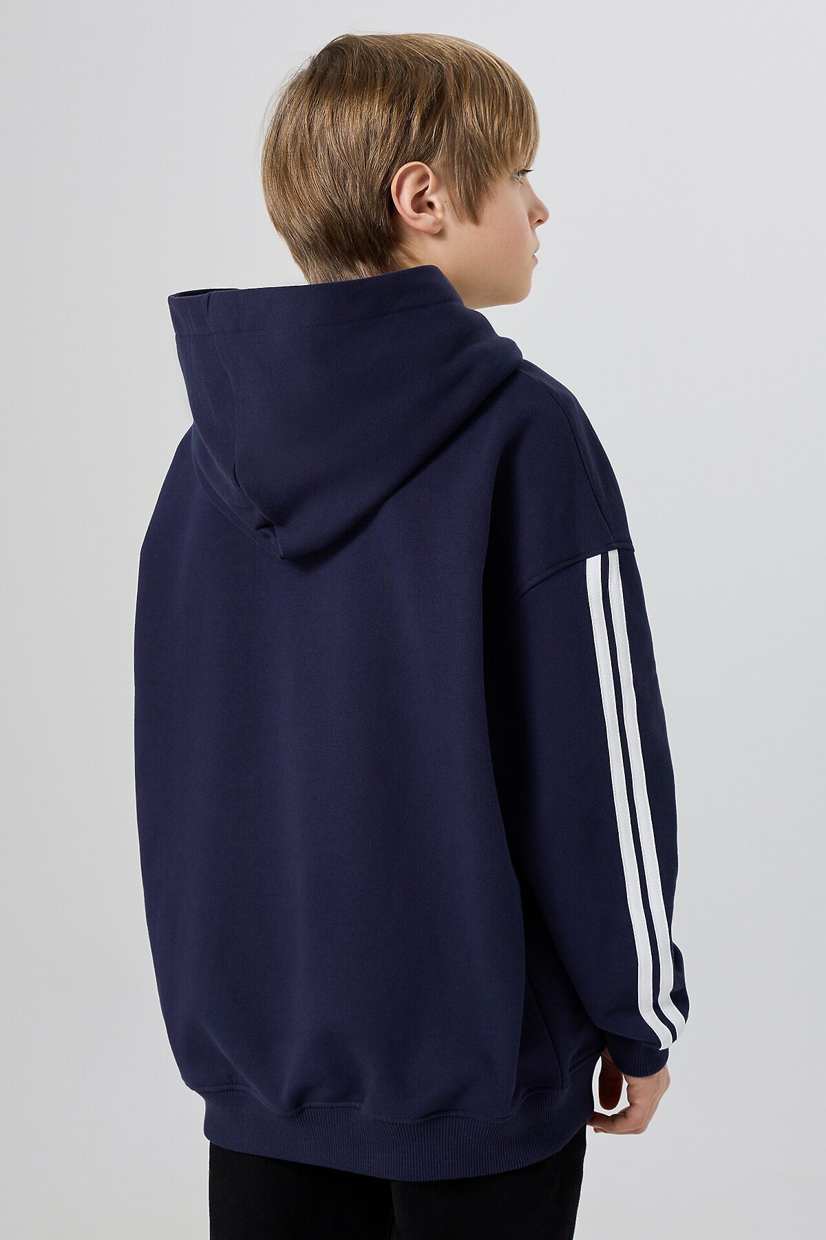 Худи для мальчиков, свободного силуэта (оверсайз), с капюшоном. Горловина округлой формы. Капюшон со средним швом, на подкладке из основного полотна. Плечо спущено, рукав втачной длинный, па рукаву настрочены лампасы. По низу рукава отрезная манжета из рибаны. Пояс отрезной из рибаны, отстрочен.