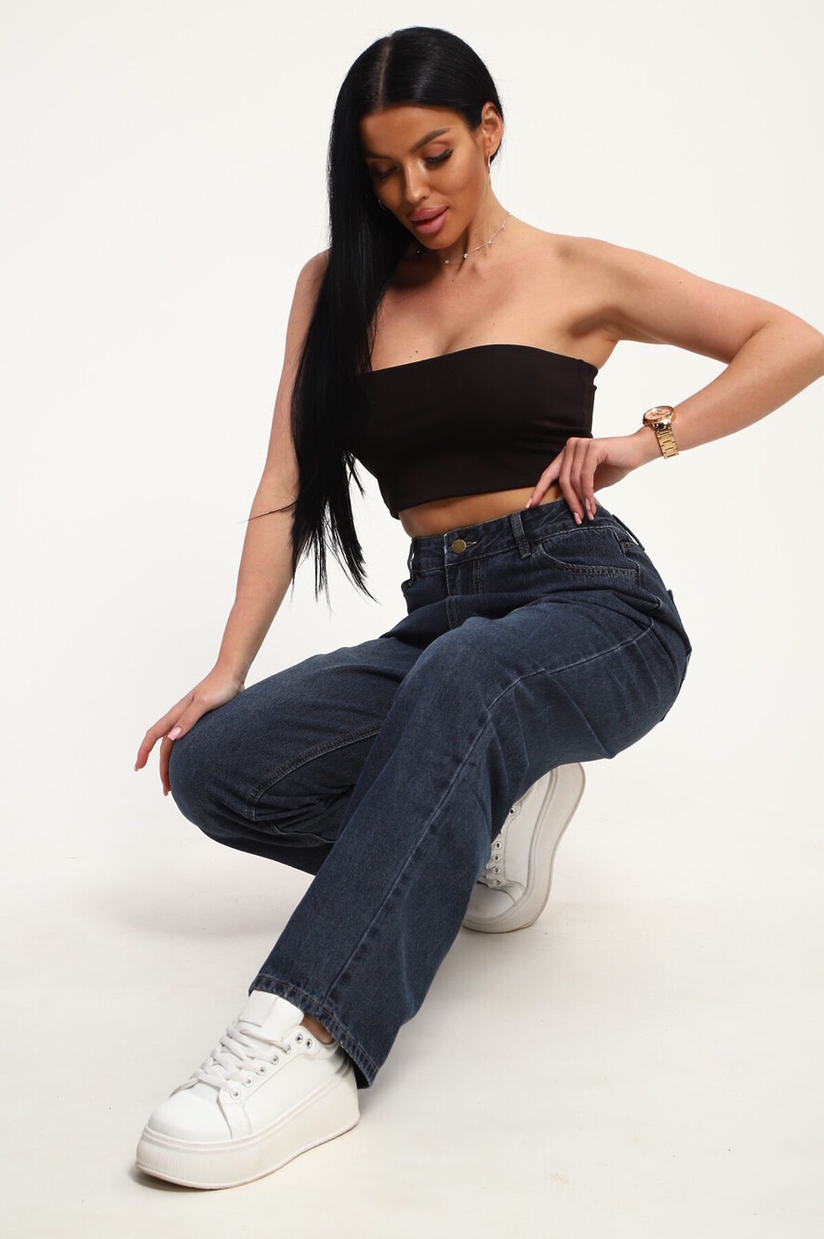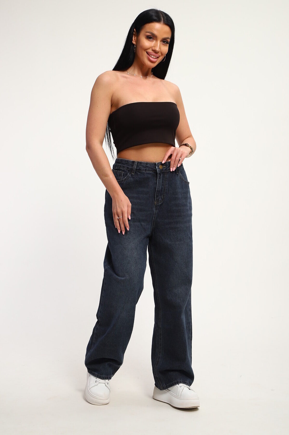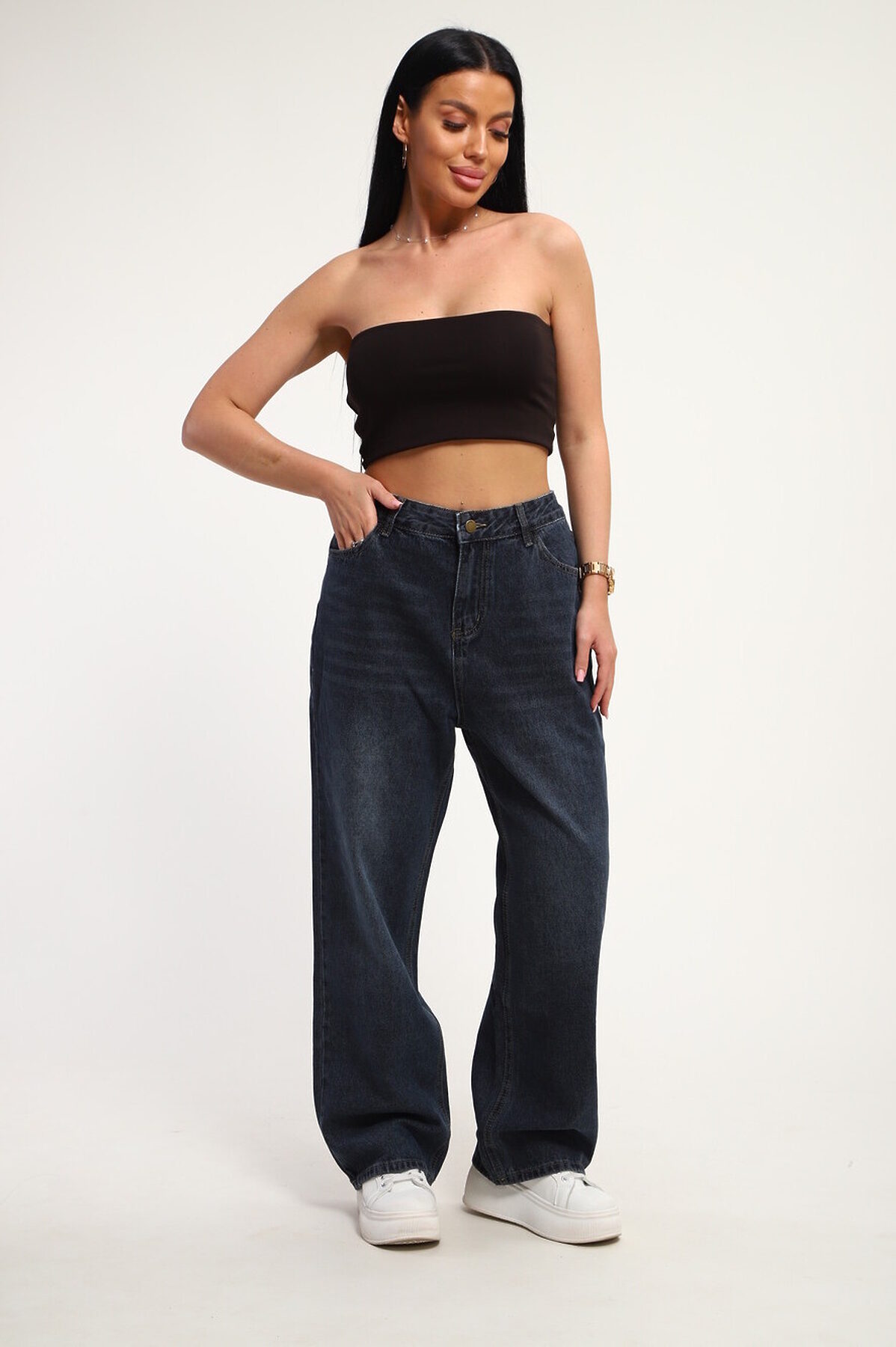Стильные женские джинсы свободного кроя из плотного денима темно-синего цвета. Модель с высокой посадкой и классической застежкой на пуговицу и молнию обеспечивает комфортную посадку и подчеркивает талию. Прямой, слегка расширяющийся книзу силуэт идеально подойдет для создания современных городских образов. Джинсы легко комбинируются с кедами, футболками и топами для повседневного стиля.