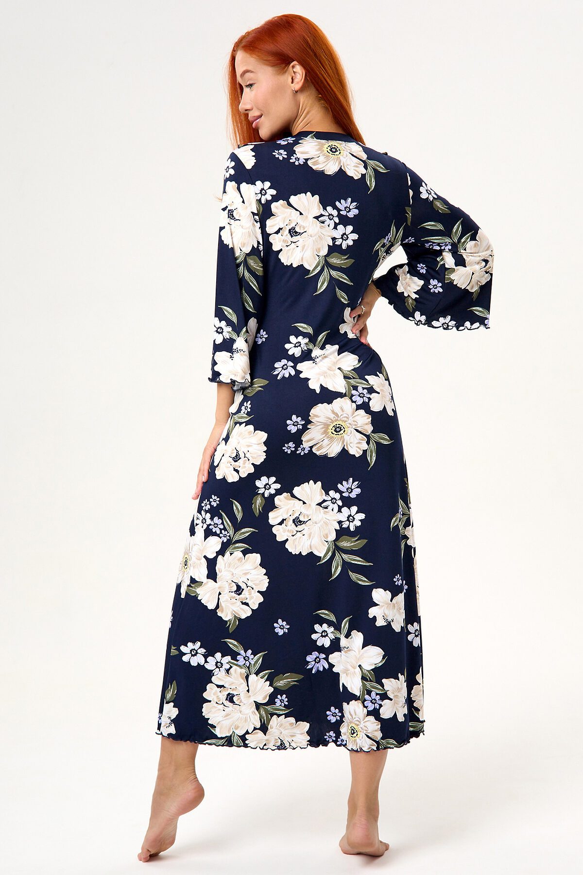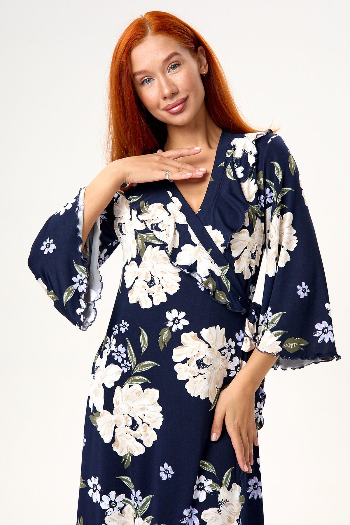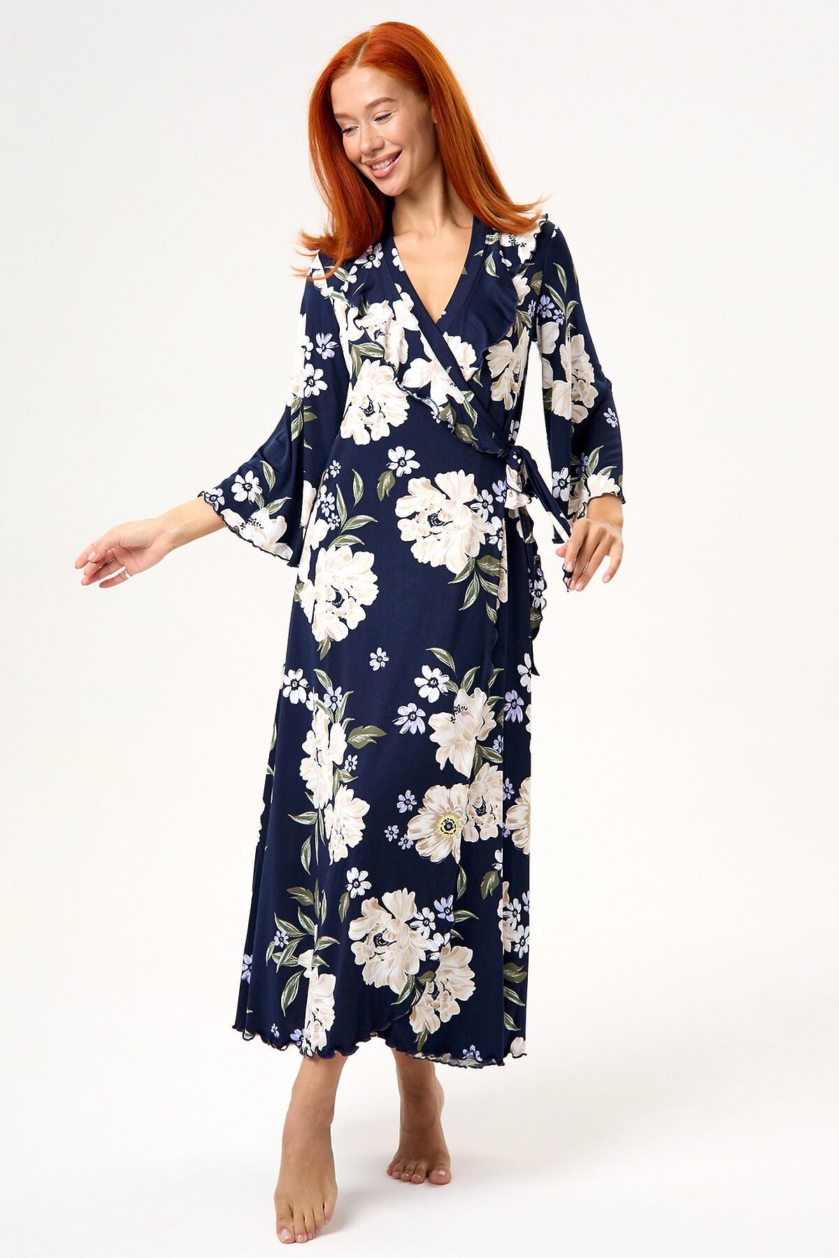Халат домашний трикотажный женский - это отличное дополнение к вашей коллекции одежды для дома, созданной для тех, кто любит быть яркой и стильной, даже находясь в уютном уголке своего дома. Длинный халат с запахом имеет полуприлегающий силуэт, расклешенный к низу, длиной до середины икры. Линия талии завышена, что создает элегантный и изящный силуэт. На полочках, в области груди, расположены изящные воланы, которые добавляют изюминку к образу, подчеркивая женственность. Рукав в тачной, длиной 3/4, смотрится легко и элегантно, это делает его удобным в использовании. Подойдет как стройным женщинам, так и дамам с пышными формами. Идеально для подарка. Благодаря крою подойдет на маленькие и большие размеры, беременным и кормящим мамочкам. Возьмите халатик в роддом и будете самой элегантной мамочкой. Наш халат это идеальный выбор для приятного времяпрепровождения в уютной обстановке. Сочетая в себе красоту и удобство, он идеально подходит для женщин, которые ценят качество во всем.