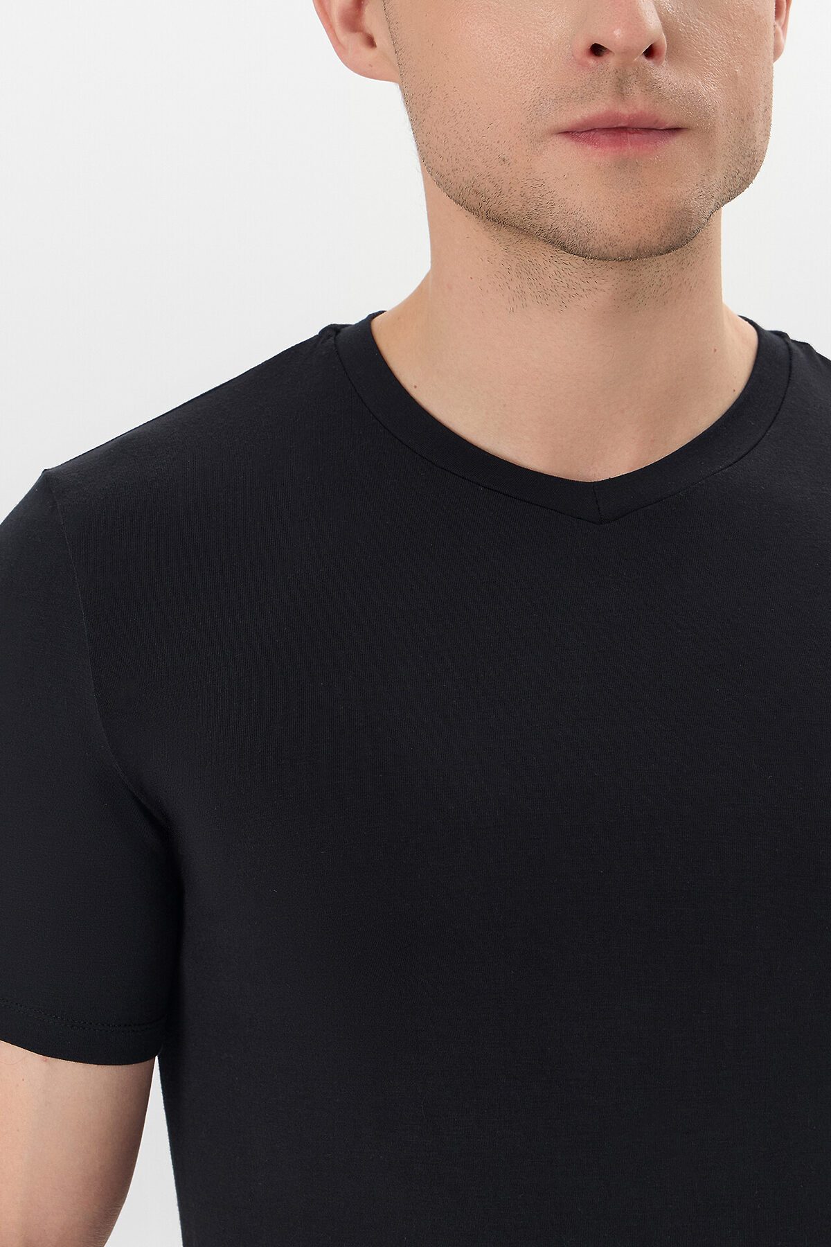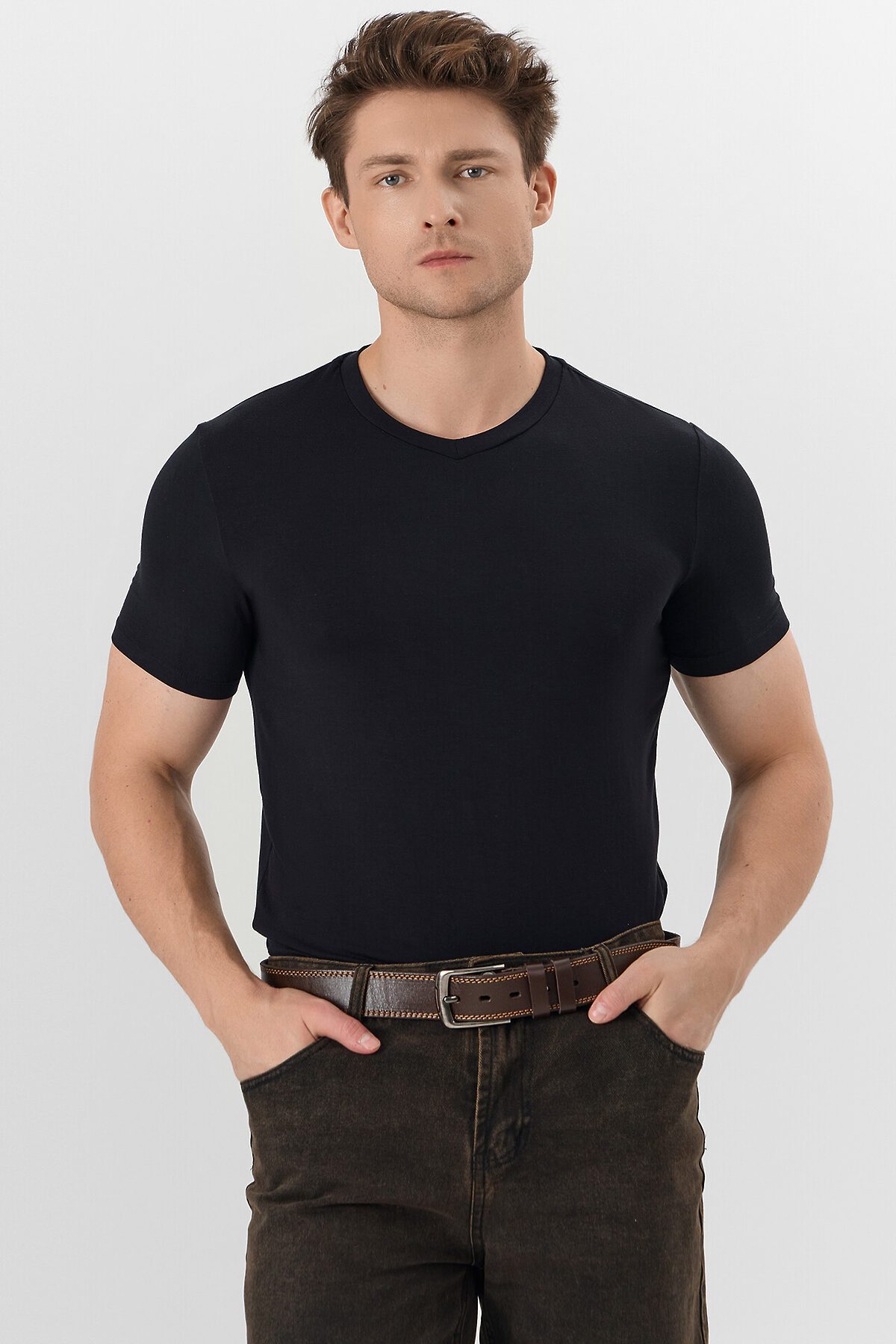 Футболка прилегающего силуэта. Рукава короткие втачные. Горловина V-образной формы, шов спинки обработан бейкой из основного полотна. Обтачка горловины из основного полотна. Нижние срезы рукавов обработаны швом в подгибку на 2х игольной плоскошовной машине.