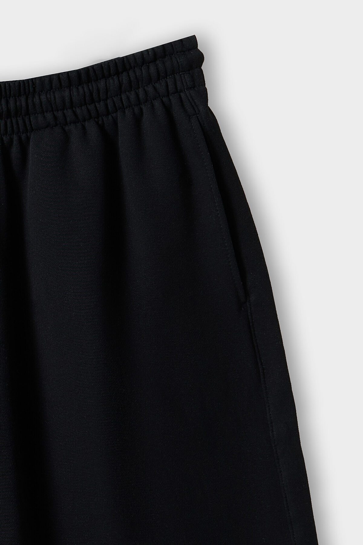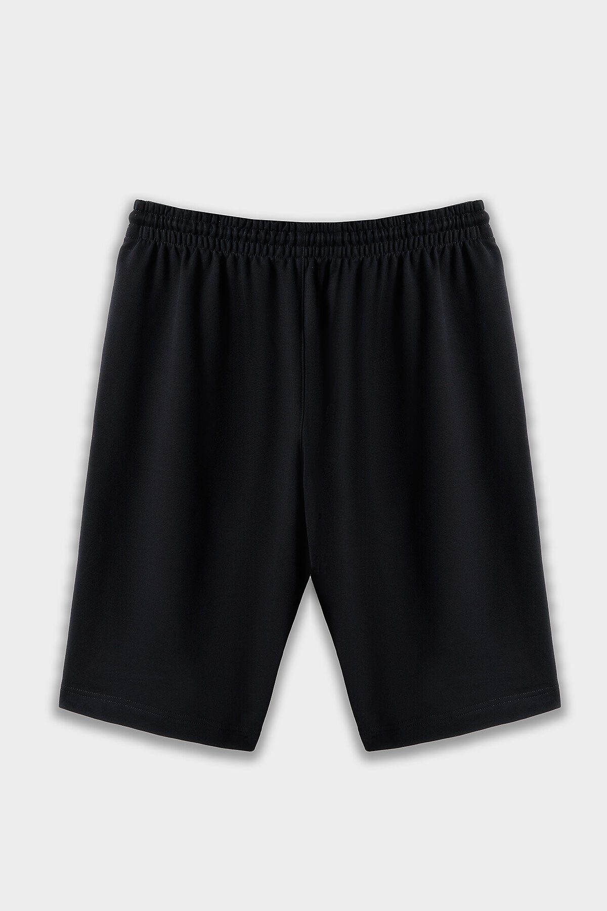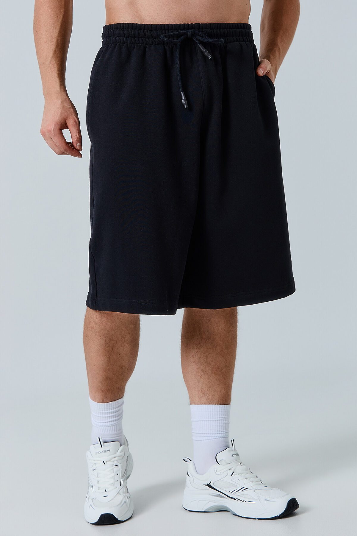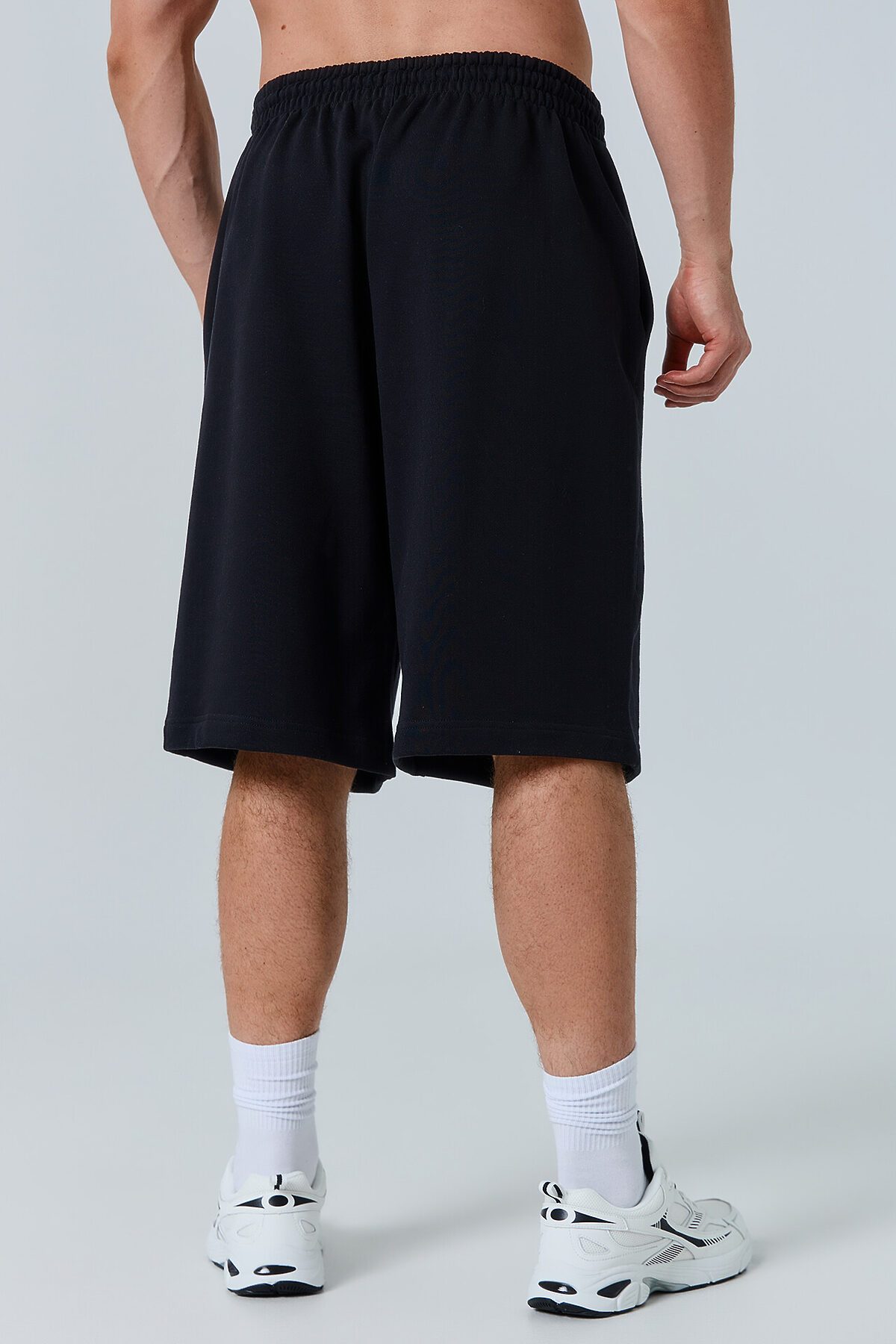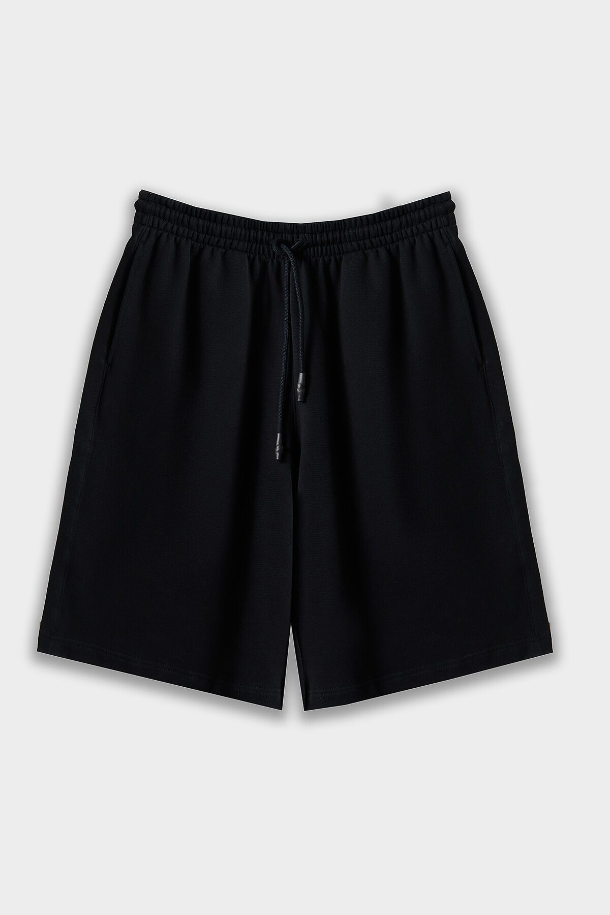 Шорты изготовлены из трикотажного полотна футер Шорты свободного силуэта (оверсайз), длиной ниже колен. Пояс цельнокроеный с эластичной тесьмой внутри. С внешней стороны пояса пробиты петли и втянут шнур (8КXW-1 8мм) с узлом на концах и с термоусадочной трубкой. В боковых швах обработаны карманы, подкладка кармана из кулирки. Нижние срезы обработаны швом вподгибку на 2х игольной плоскошовной машине. На задней правой половинке накладной карман (мод. 131097-1).