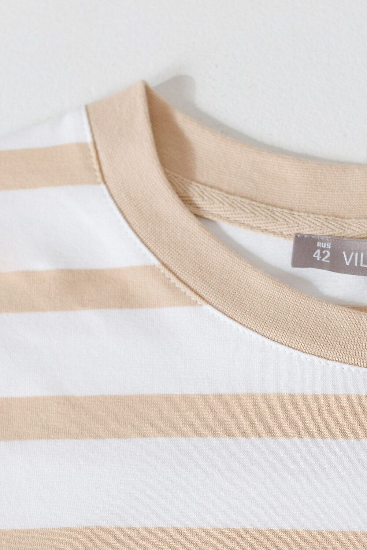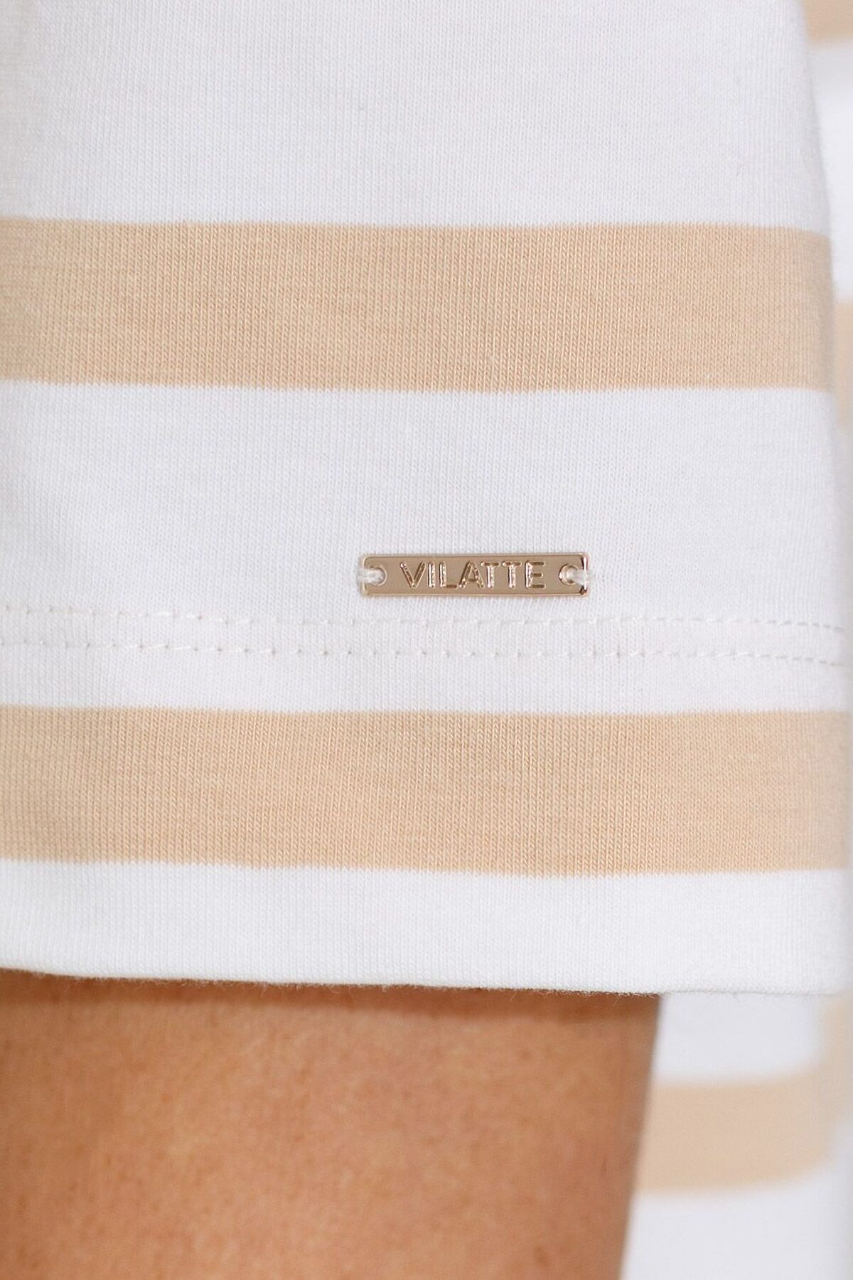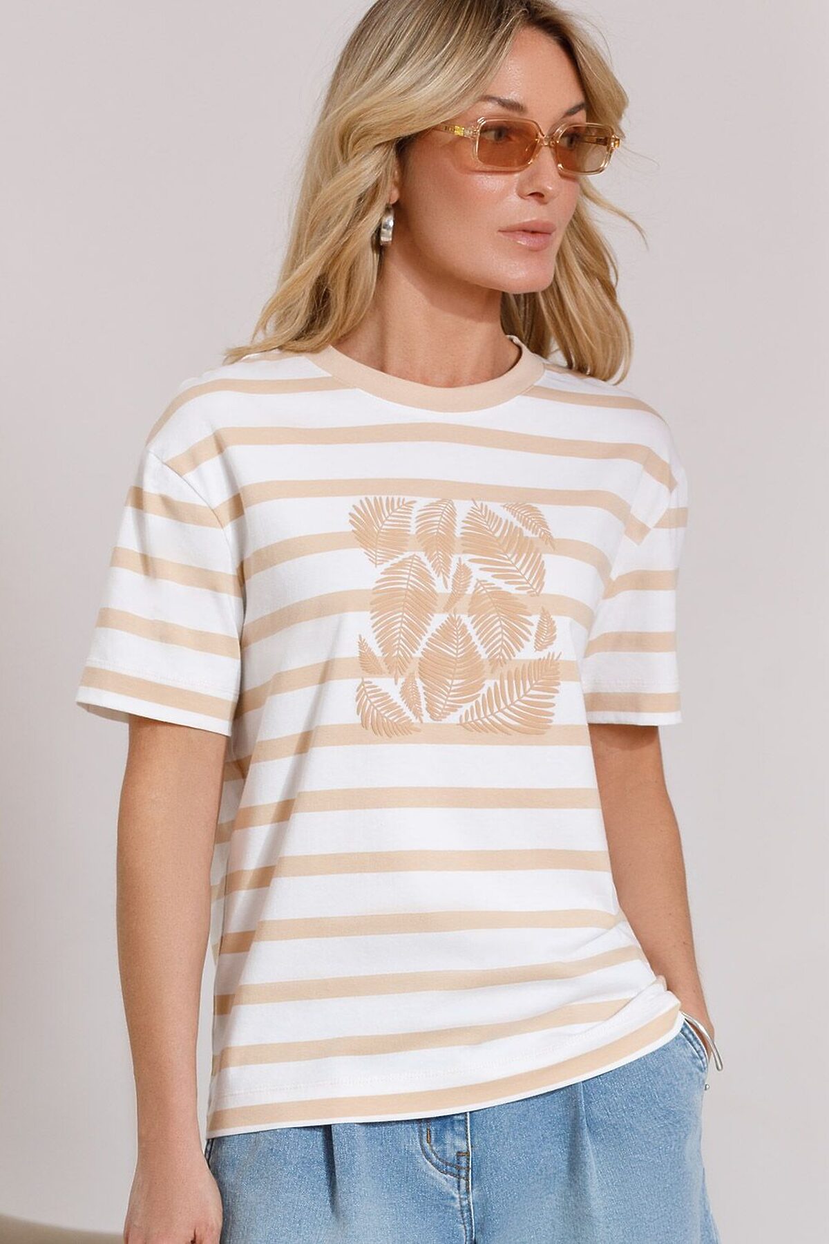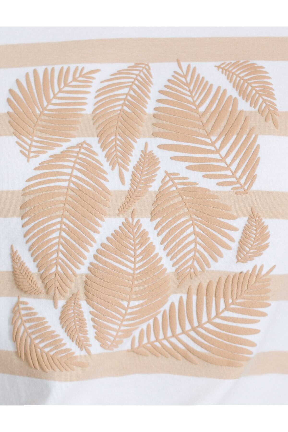 Свободная футболка в полоску с принтом из премиального хлопка с эластаном VILATTE, белый-бежевый_листья