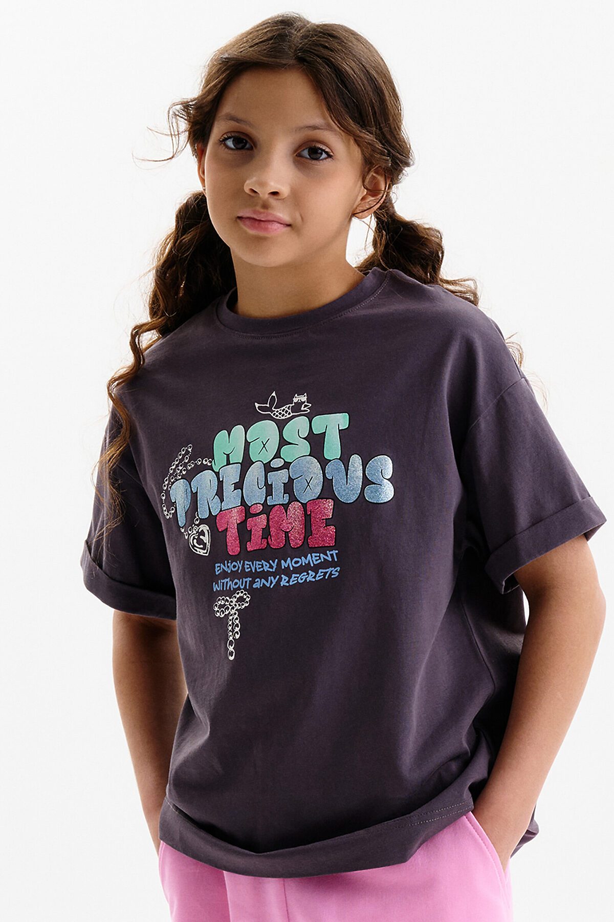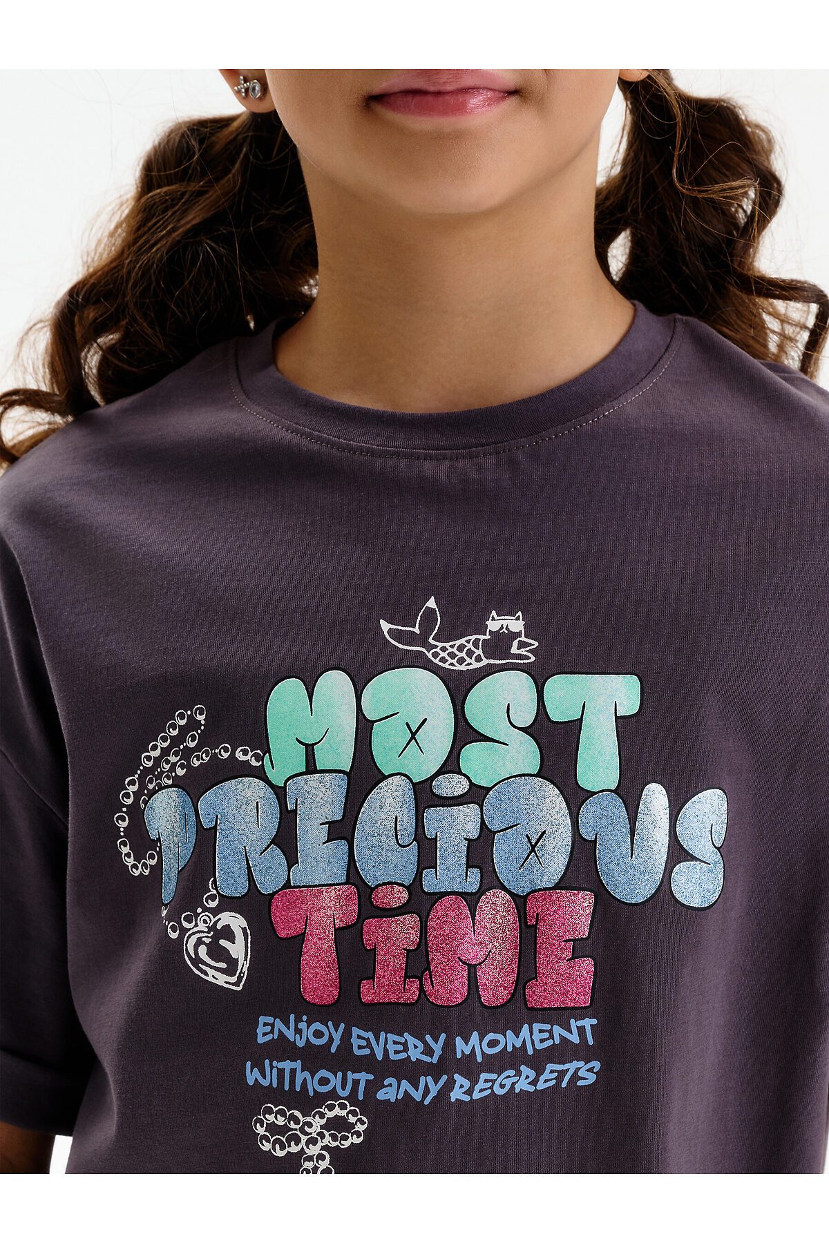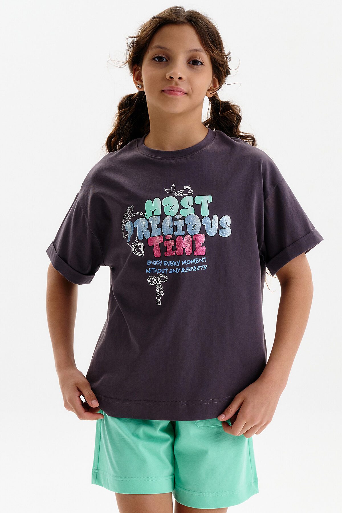 Футболка для девочки умеренного объема. Выполнена из 100% хлопка. Эластичная рибана на вырезе горловины гарантирует, что футболка будет легко надеваться и сниматься, не теряя при этом своей формы. В принте глиттер разных цветов. Перевод: самое драгоценное время: наслаждайся каждым моментом без сожалений.