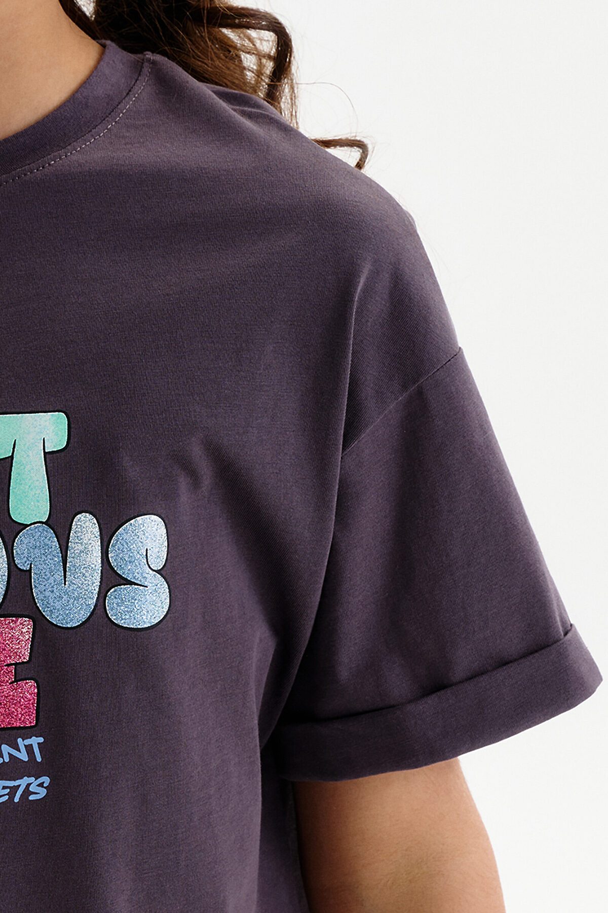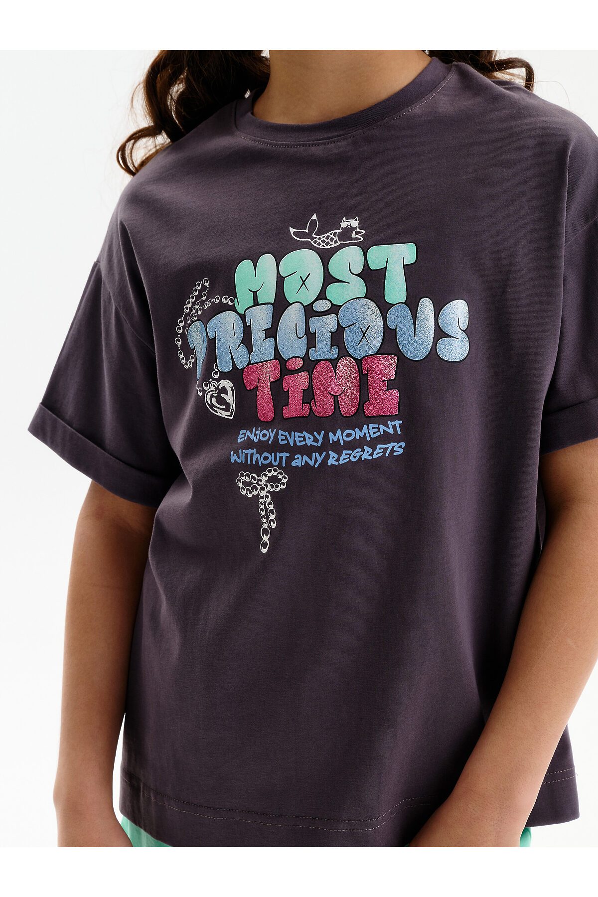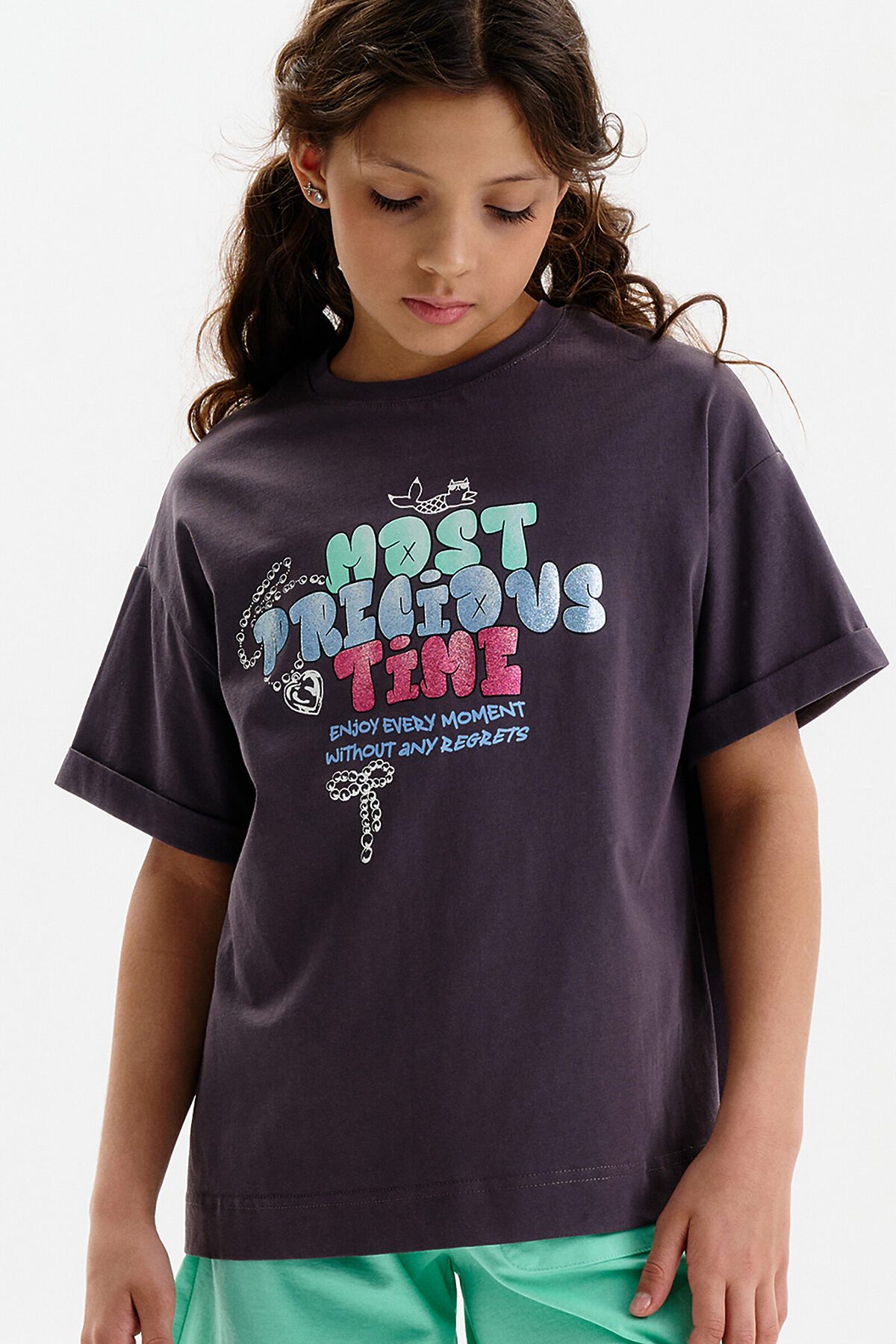 Футболка для девочки умеренного объема. Выполнена из 100% хлопка. Эластичная рибана на вырезе горловины гарантирует, что футболка будет легко надеваться и сниматься, не теряя при этом своей формы. В принте глиттер разных цветов. Перевод: самое драгоценное время: наслаждайся каждым моментом без сожалений.