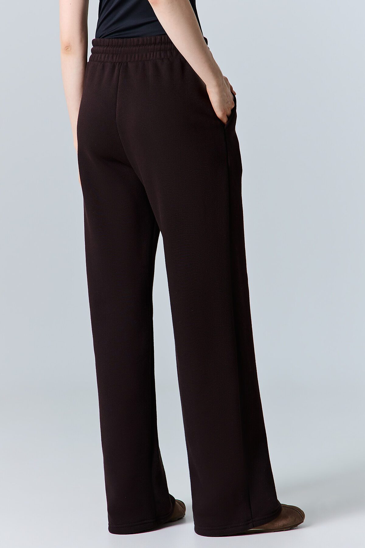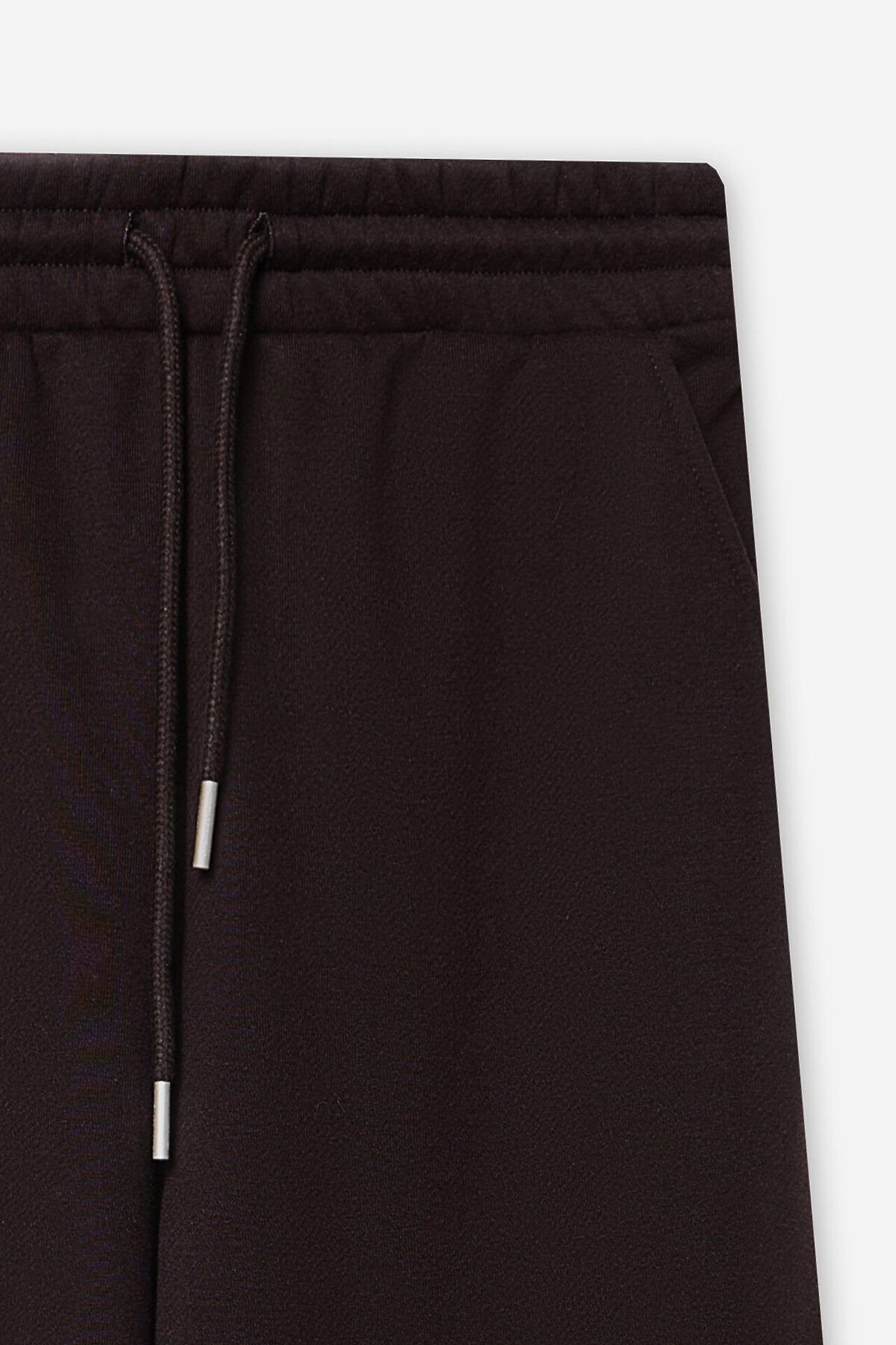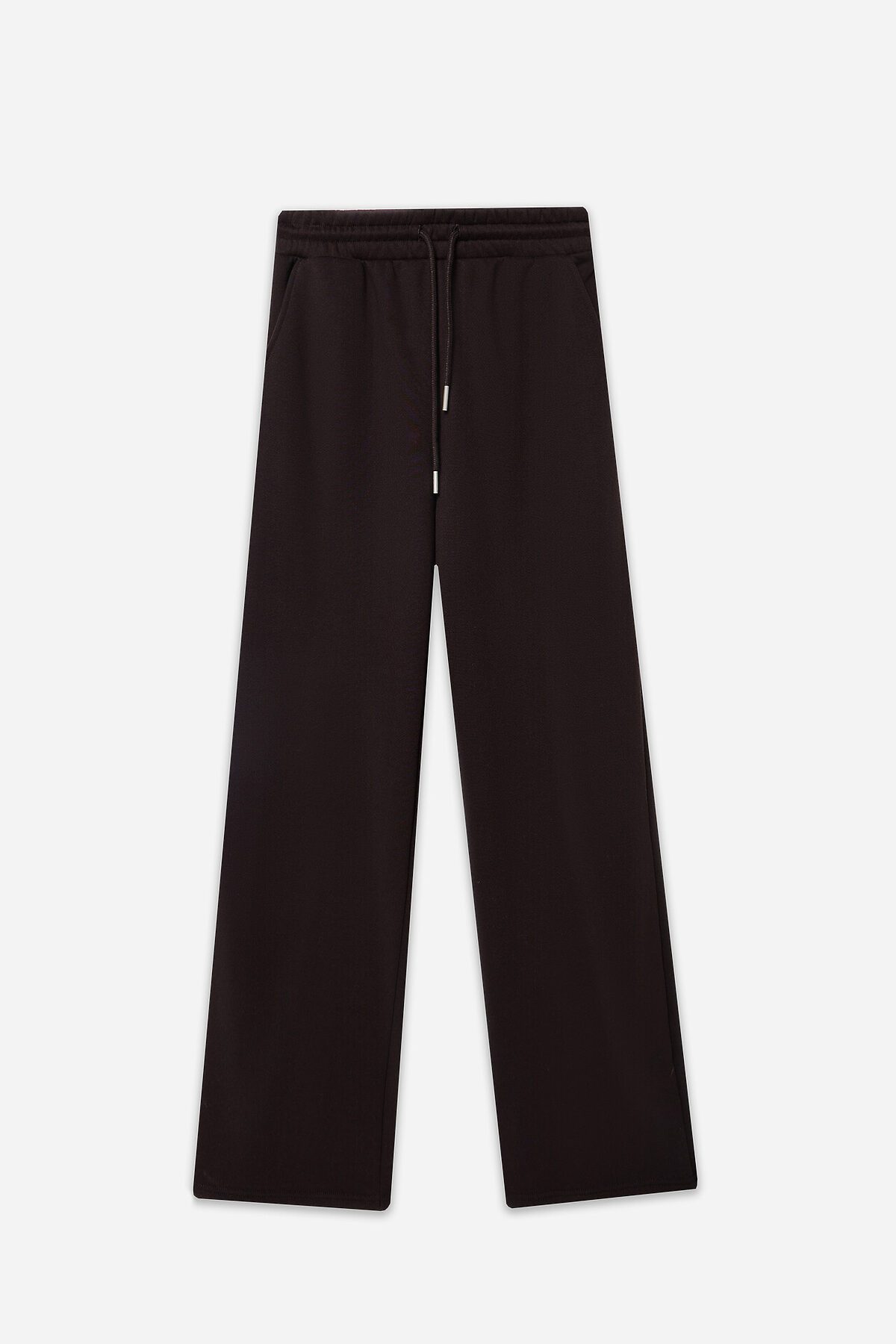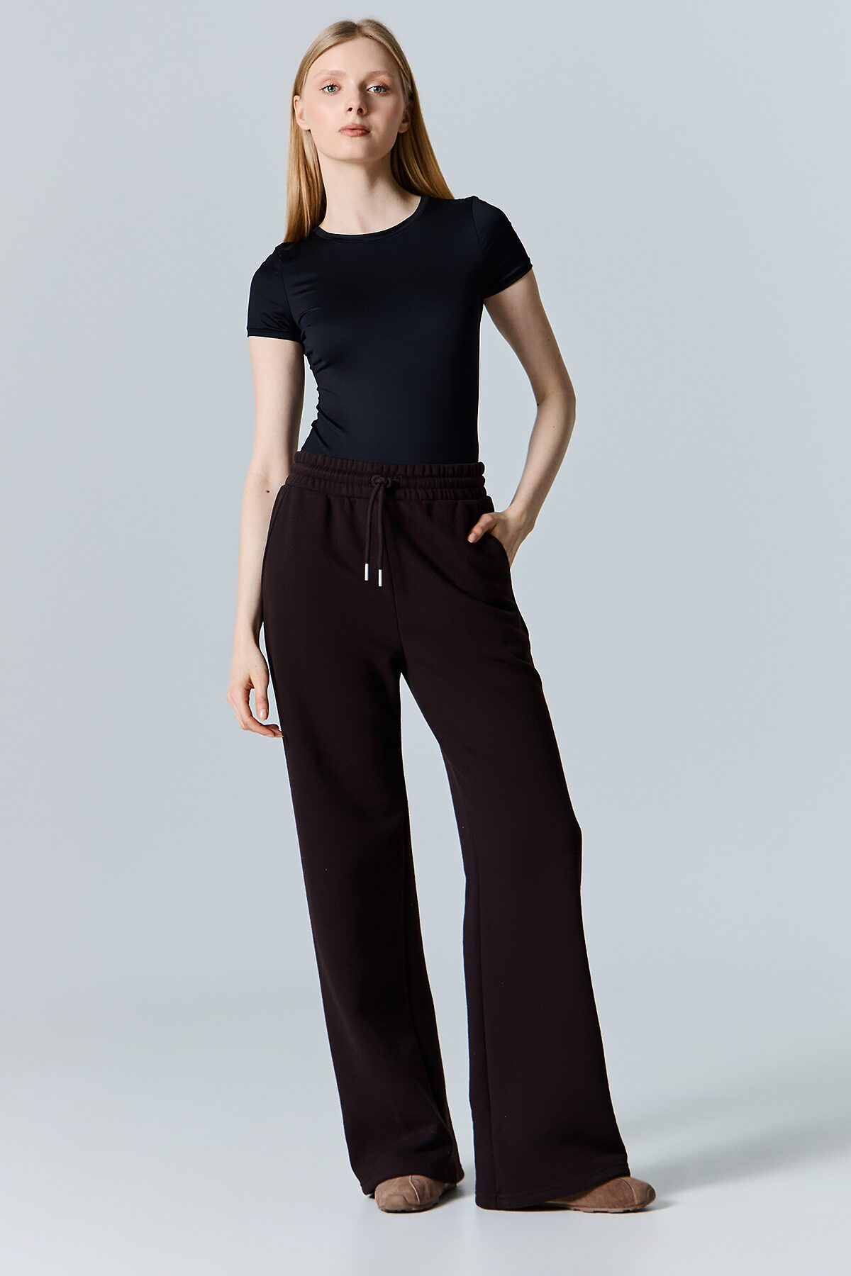 Брюки прямые с посадкой на талии свободного силуэта. Спереди карманы с отрезным бочком, с подкладкой из кулирного полотна. Пояс отрезной с эластичной тесьмой внутри 60RV. На внешней стороне петли, через которые выводится шнур с металлическими эглетами (8EKXWCp-1). Нижние срезы брюк обработаны швом вподгибку.