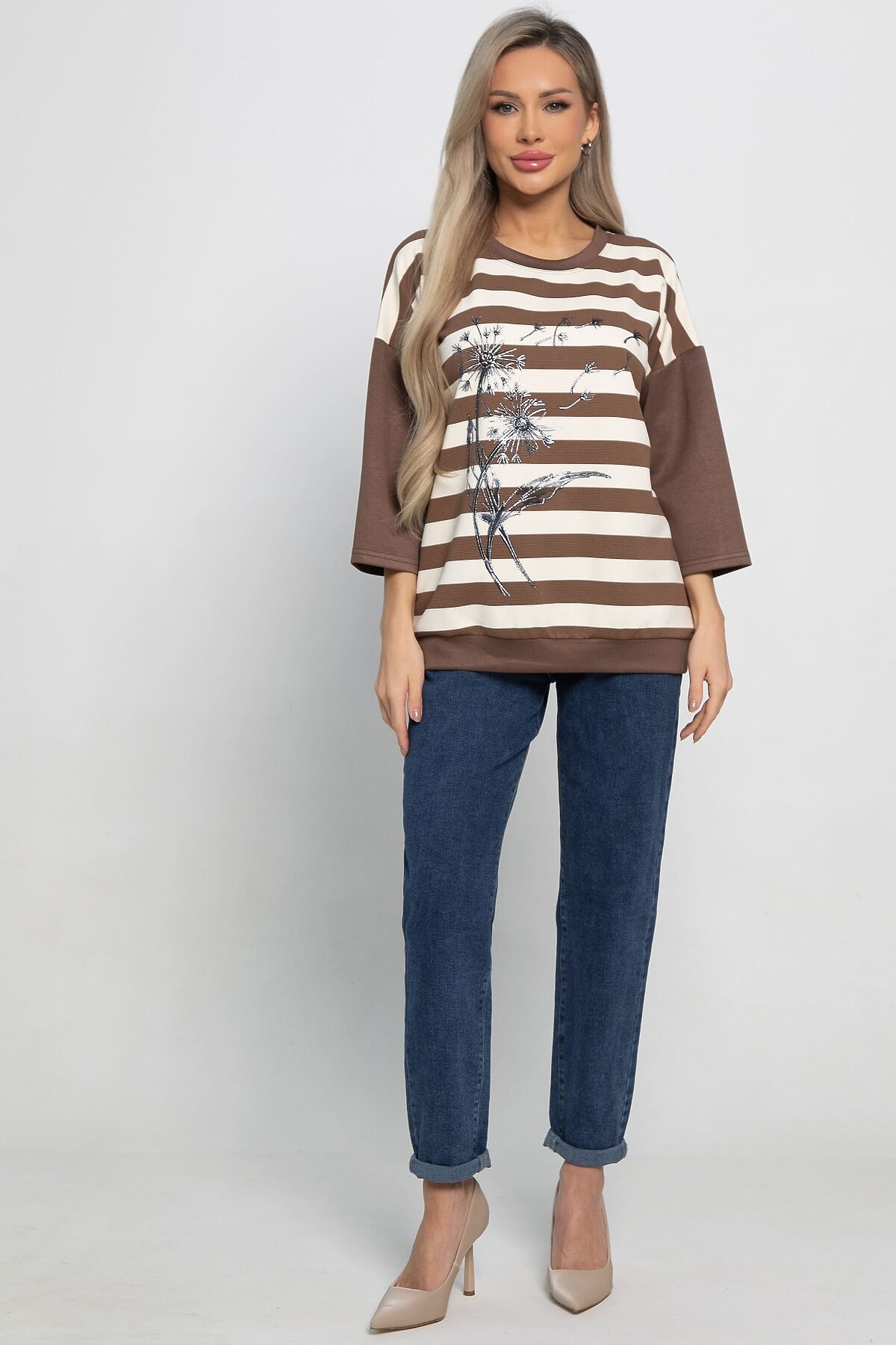 Создайте запоминающийся образ с помощью очаровательной блузы прямого кроя с оригинальным рисунком. Модель имеет классический округлый вырез и свободный крой, обеспечивая комфорт и легкость. Спереди расположена фотопечать с изображением цветка-одуванчика, которая придает уникальность и изюминку. Рукава длиной 3/4. Идеальный выбор для повседневных дней.