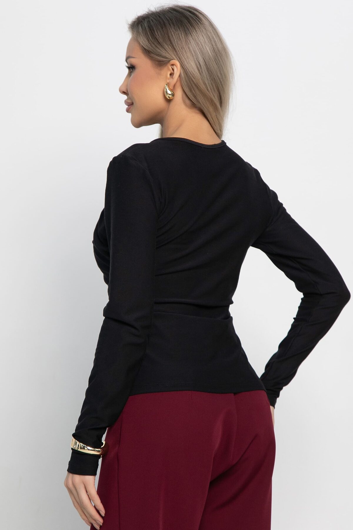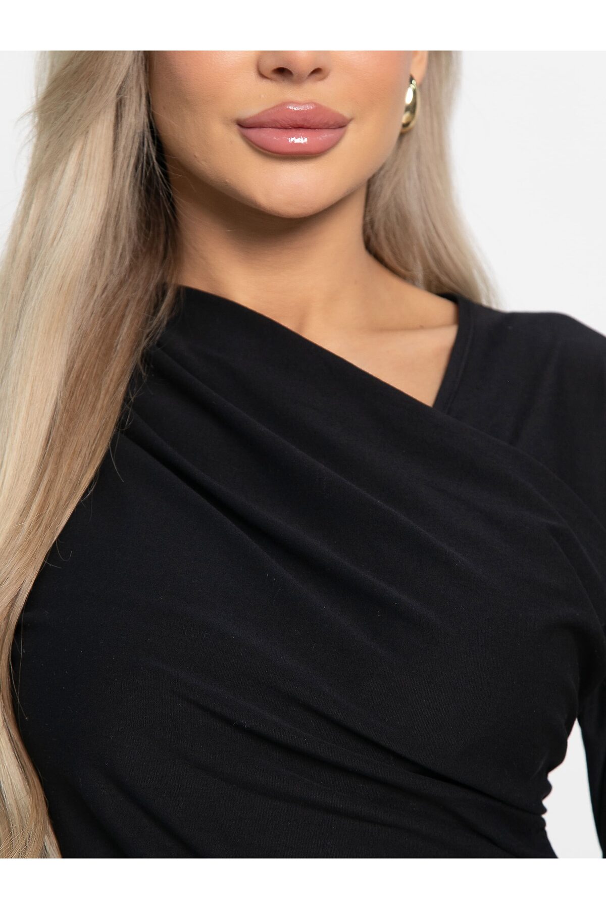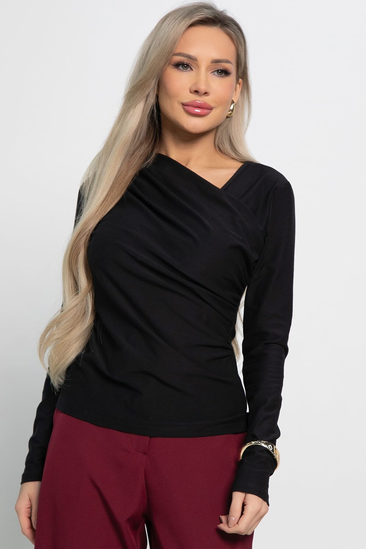 Облегающий женский лонгслив с длинным рукавом и драпировкой — универсальный и стильный предмет гардероба. Асимметричный V-образный вырез красиво подчеркивает линию шеи и ключицы, придавая образу утончённость и элегантность. Легко сочетается с брюками, джинсами или юбками, что позволяет создавать разнообразные стили — от повседневных до более элегантных. Этот лонгслив отлично подчеркнет вашу индивидуальность и добавит изящества в любой образ.