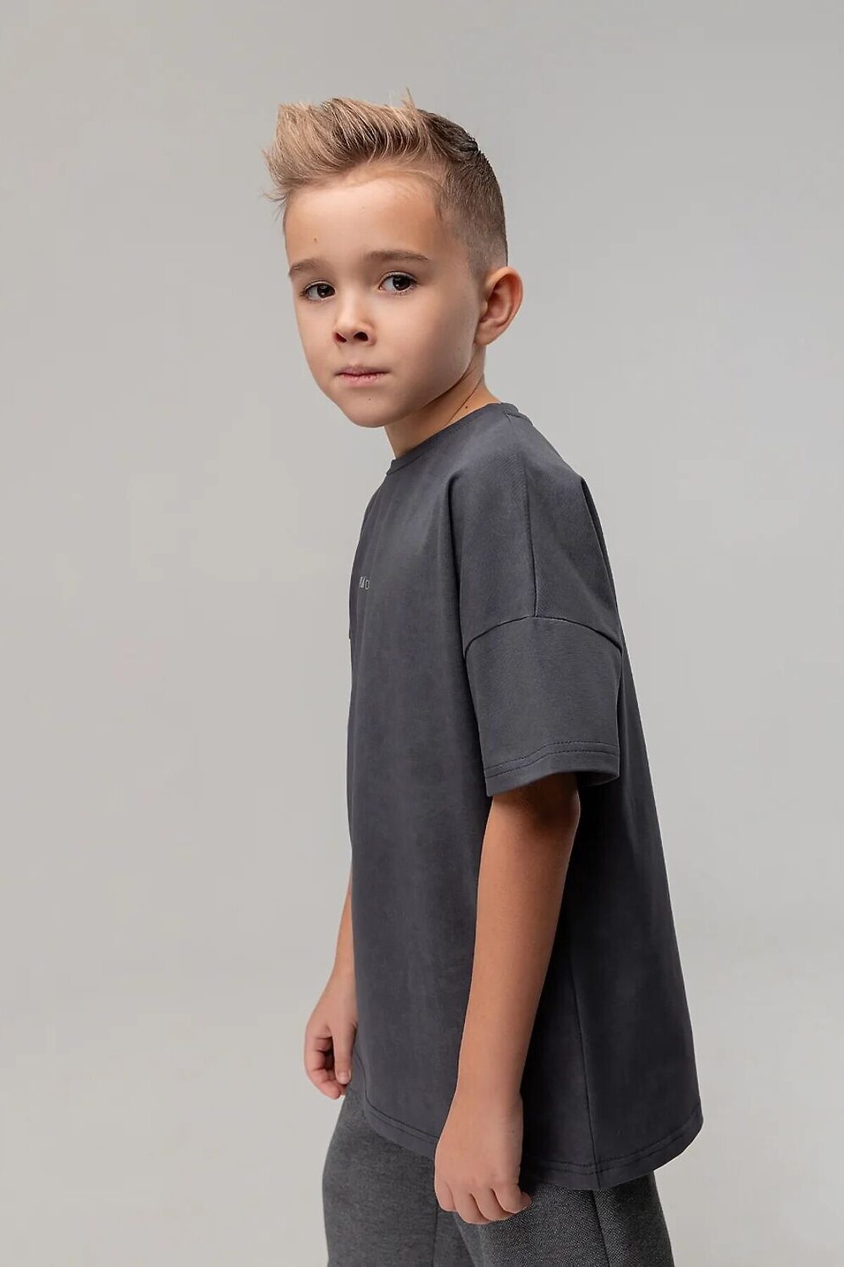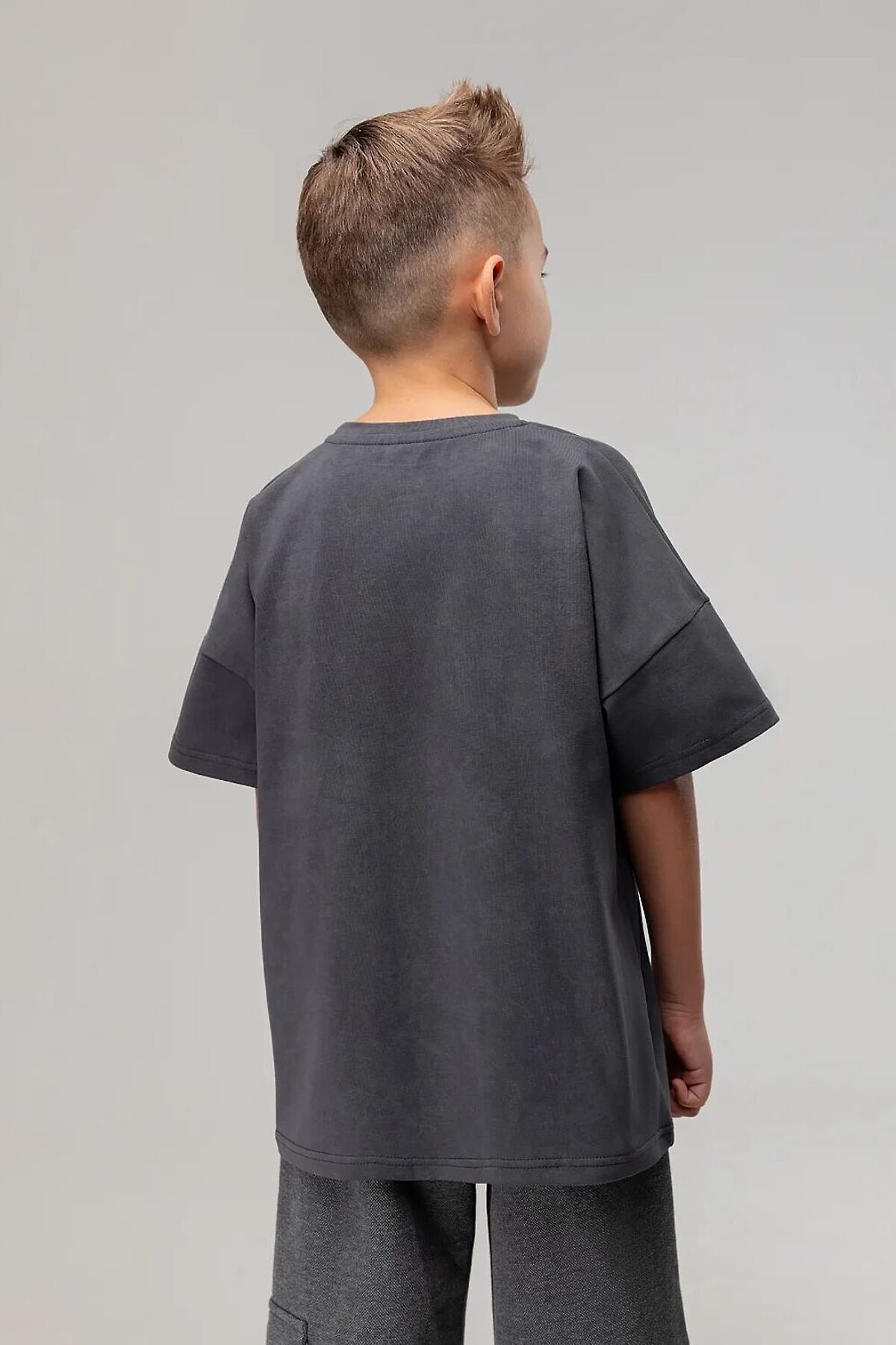 Свободная футболка с коротким рукавом. Горловина футболки округлой формы. Низ изделия прямой. На полочке нанесен термо-принт.