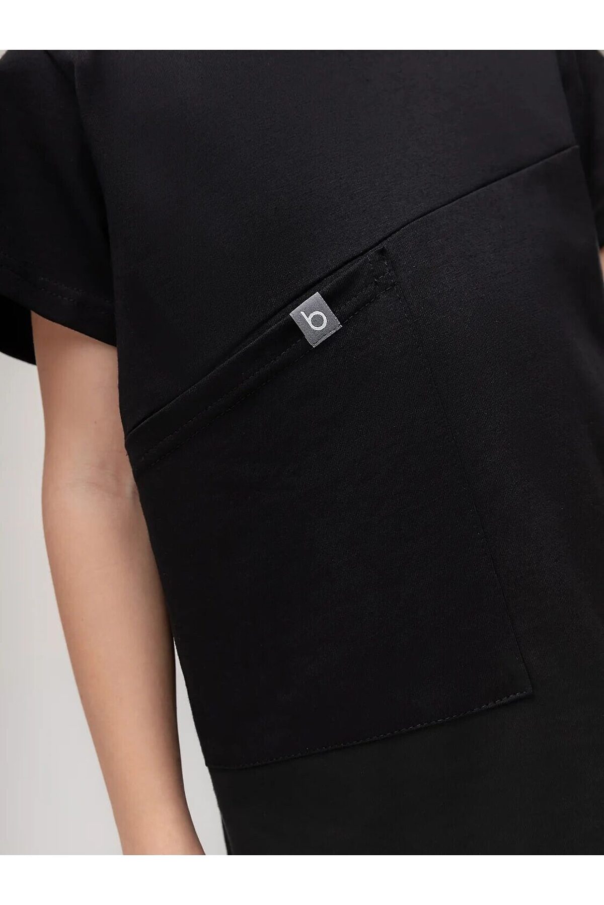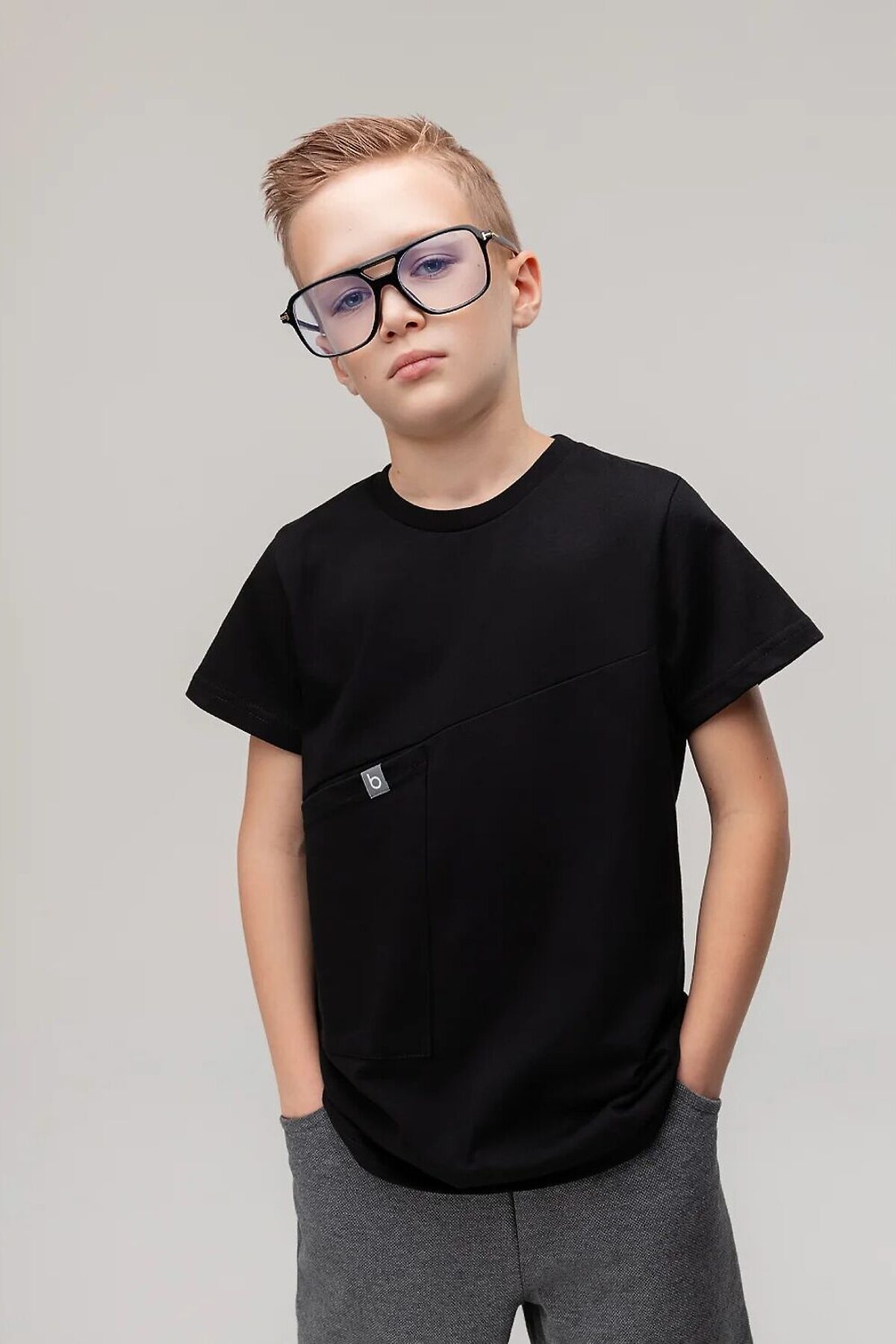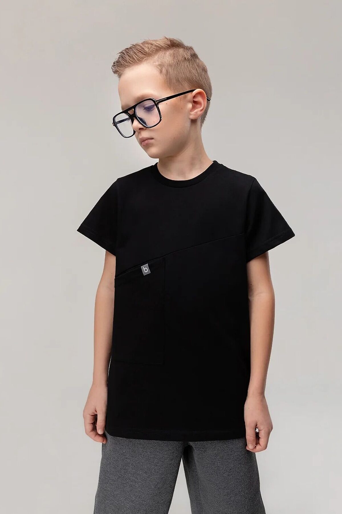 Футболка свободная с коротким рукавом. Горловина футболки округлой формы. Низ изделия прямой. На полочке накладной карман.