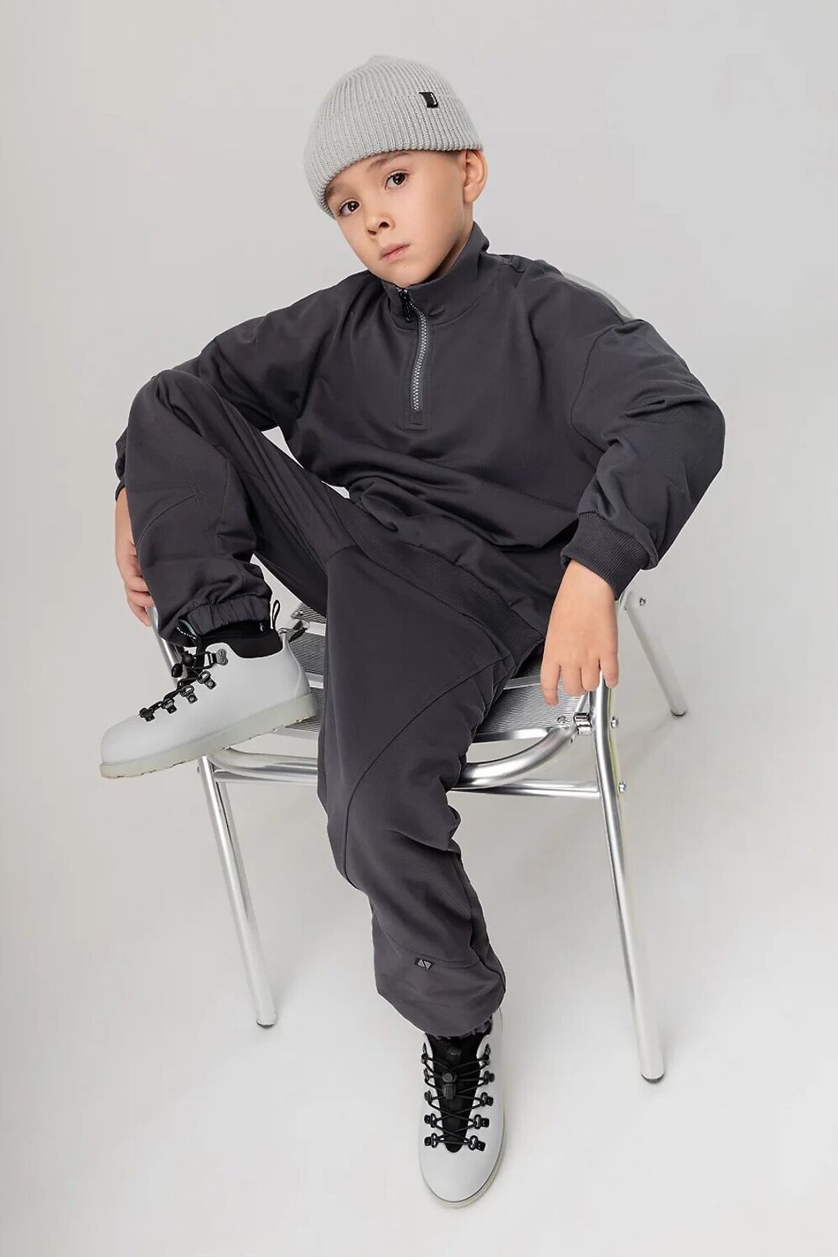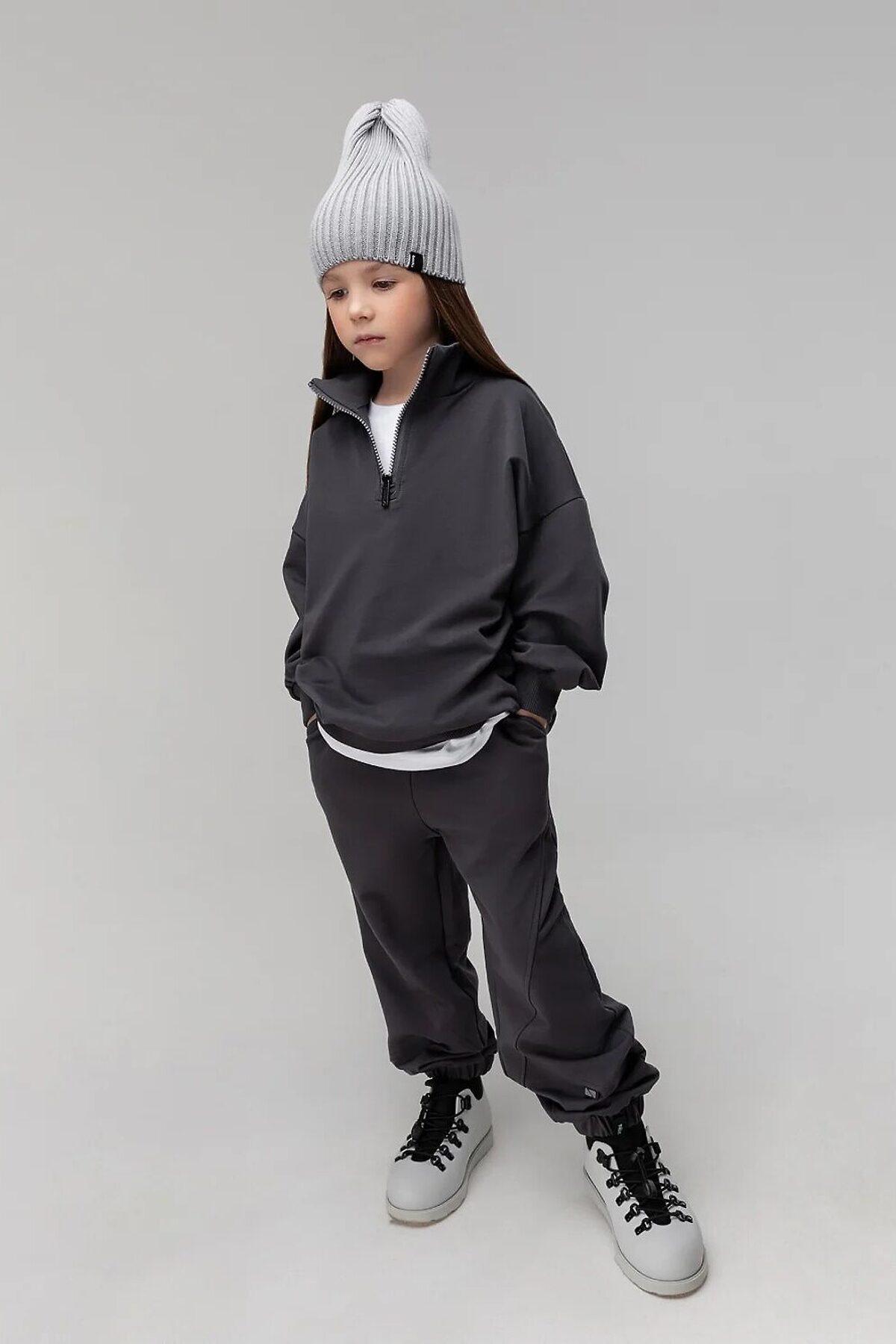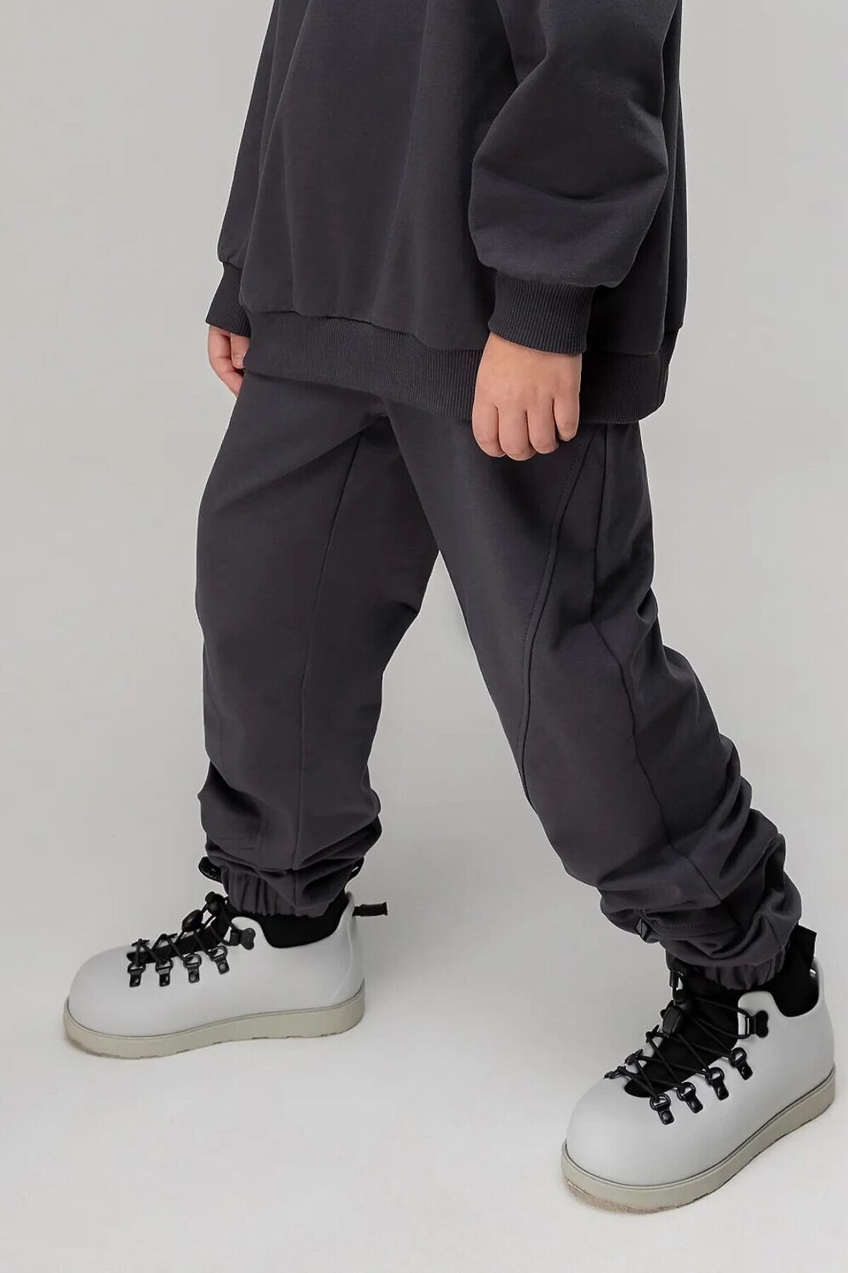 Свободная толстовка со спущенным плечом и рукавами с манжетой. Воротник стойка, застёжка на короткую молнию. Прямые, свободные брюки на поясе с внутренней резинкой. Низ брюк с манжетой на резинке. Брюки с боковыми карманами в боковых швах. Плотность флиса - 280 гр.