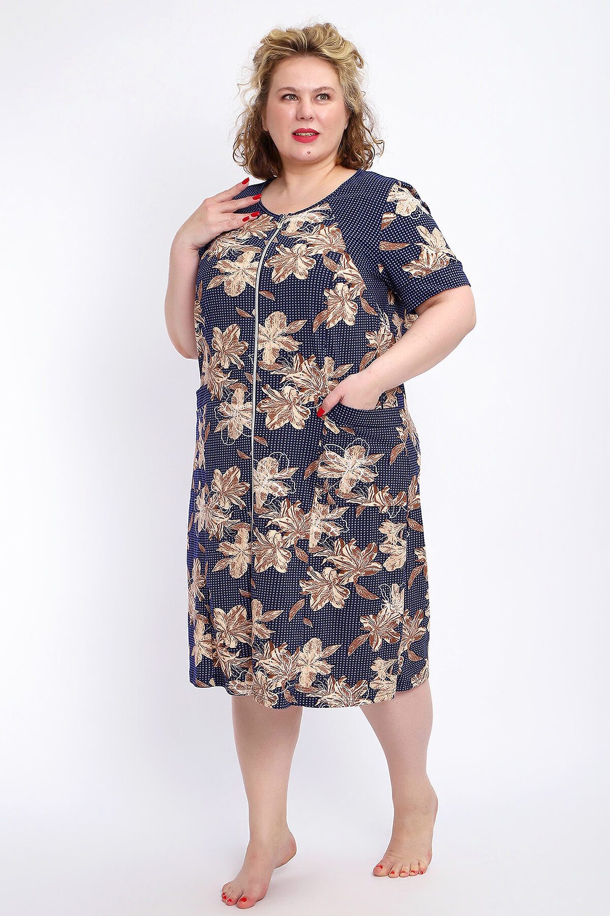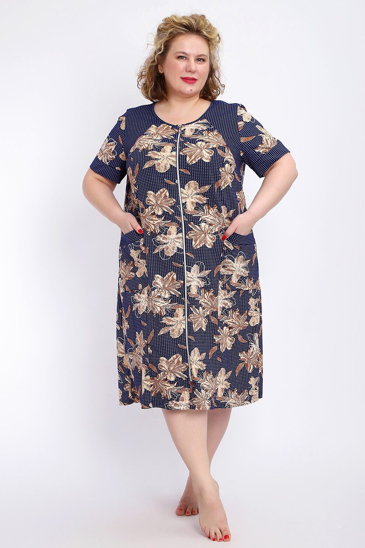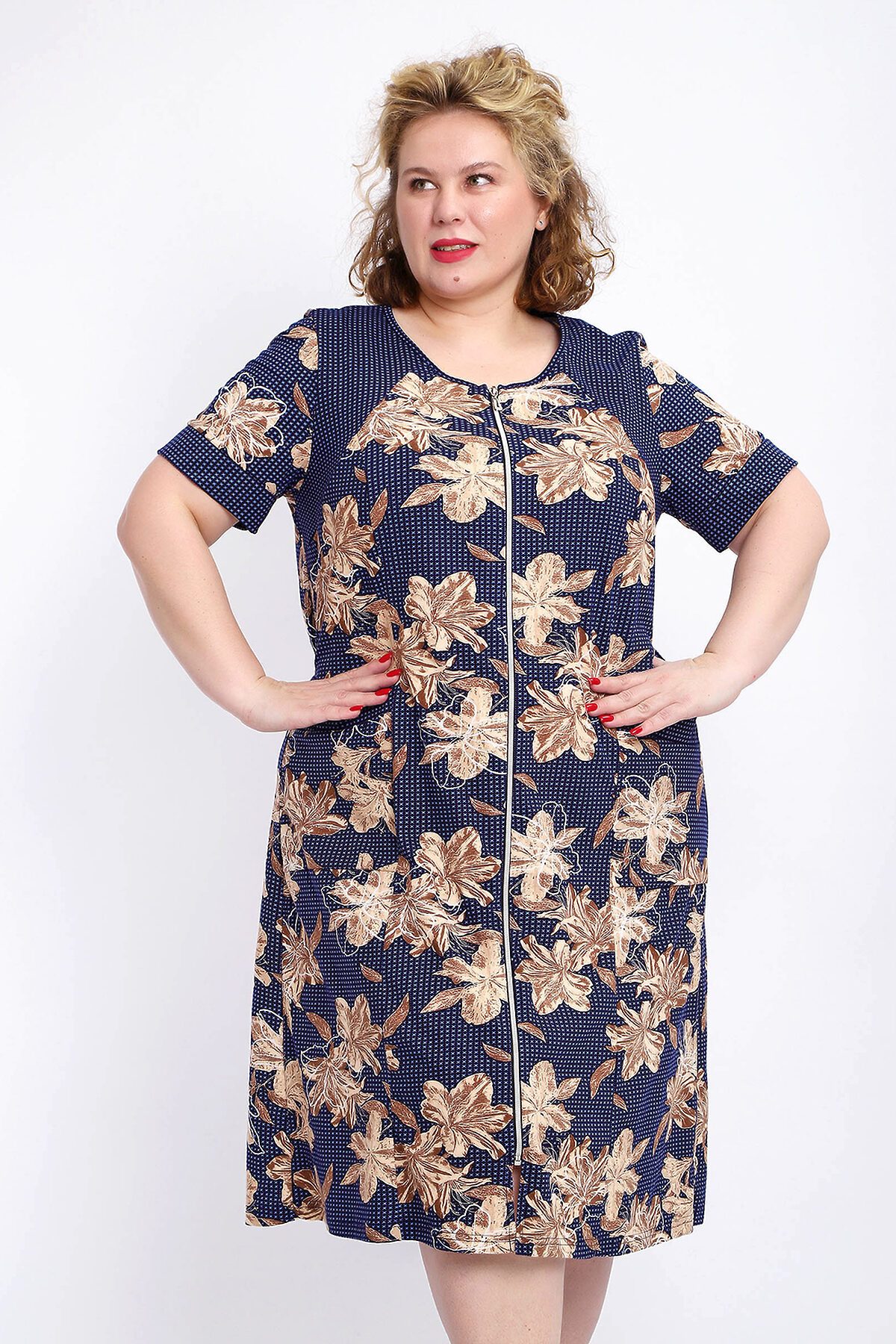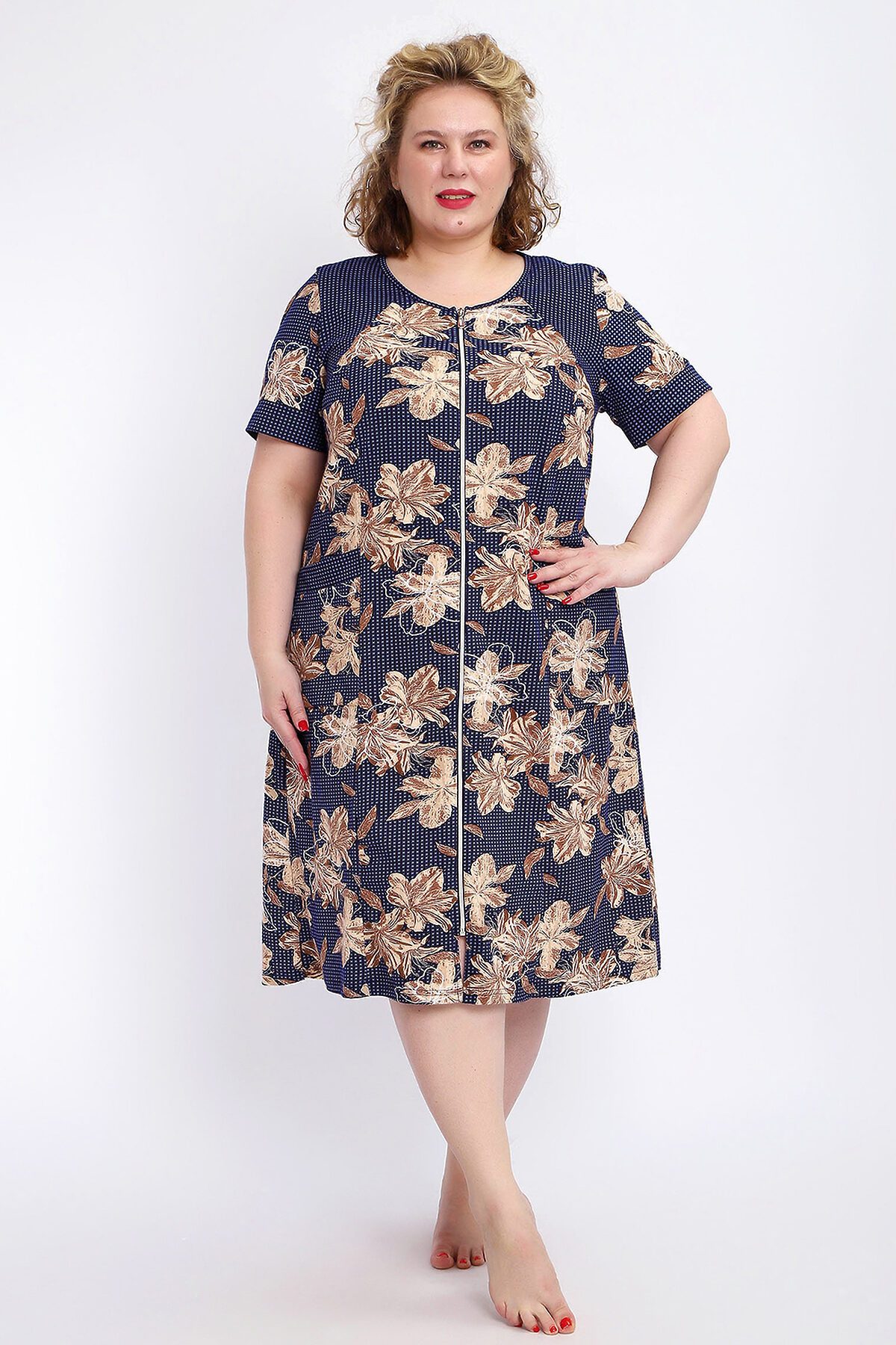 Ощутите домашний уют и комфорт - выбирайте халат женский домашний больших размеров из мягкой хлопковой ткани с очаровательным принтом. Халат на молнии является самой популярной моделью, обеспечивает удобство во время носки, не сковывает движений. Прямой свободный крой платья позволяет скрыть недостатки фигуры и ощущать легкость во время домашнего отдыха. Халат домашний дополнен накладными карманами и стильной круглой горловиной, которая оформлена декоративными планками. Длина платья универсальная, за колено. В наличии есть большие размеры, поэтому выбирайте такой халат в роддом. Изделие выглядит стильно и привлекательно за счет нежных светлых бутонов цветов на контрастном темном фоне. Женская домашняя одежда российского производства имеет идеальную посадку, не линяет, не дает усадку после стирки и долго сохраняет первоначальный внешний вид. Этот женский универсальный халат изготовлен из 100% хлопка, поэтому его можно хорошо использовать как банный халат. Для вашего удобства у халатика есть два боковых кармана, которые хорошо подходят для телефона или всяких мелочей. Размерная сетка включает в себя большие размеры ( до 74 размера). Халат трикотажный выполнен из 100% хлопка. Ткань не вызывает аллергии, не электризуется, хорошо держит форму, не деформируется при стирке. Мягкое трикотажное полотно отлично пропускает воздух, позволяет коже дышать, что актуально в самые жаркие летние дни. Благодаря универсальному крою халат в нежной расцветке подходит для покупательниц любого возраста и любого типа женской фигуры, скрывает недостатки и подчеркивает достоинства. Свободный силуэт позволяют носить его как домашнее платье, даря удобство и комфорт в течение всего дня. Домашний халат с рукавами отлично подойдет в подарок маме, бабушке или сестре на новый год, 8 марта или просто так порадовать.