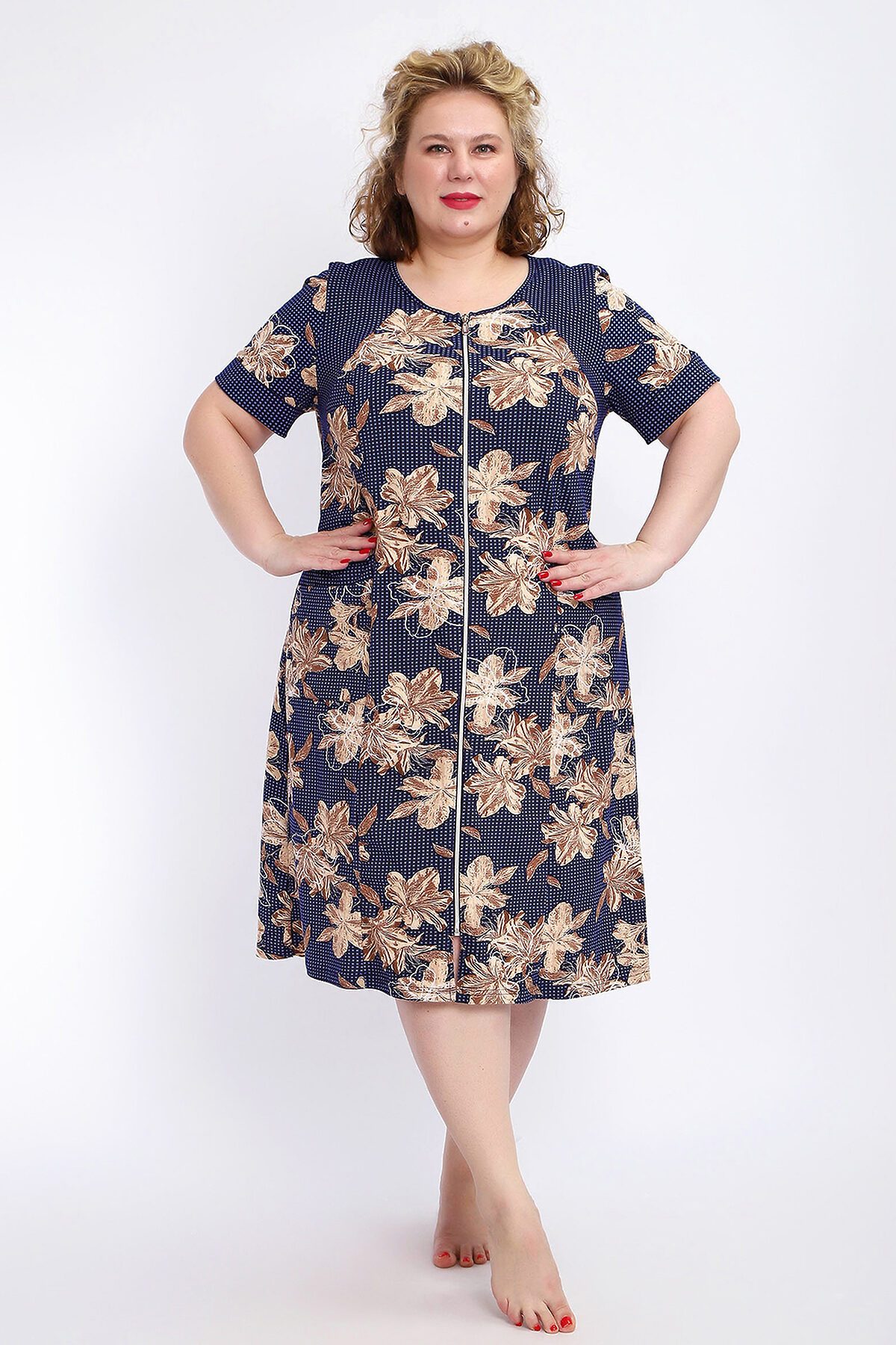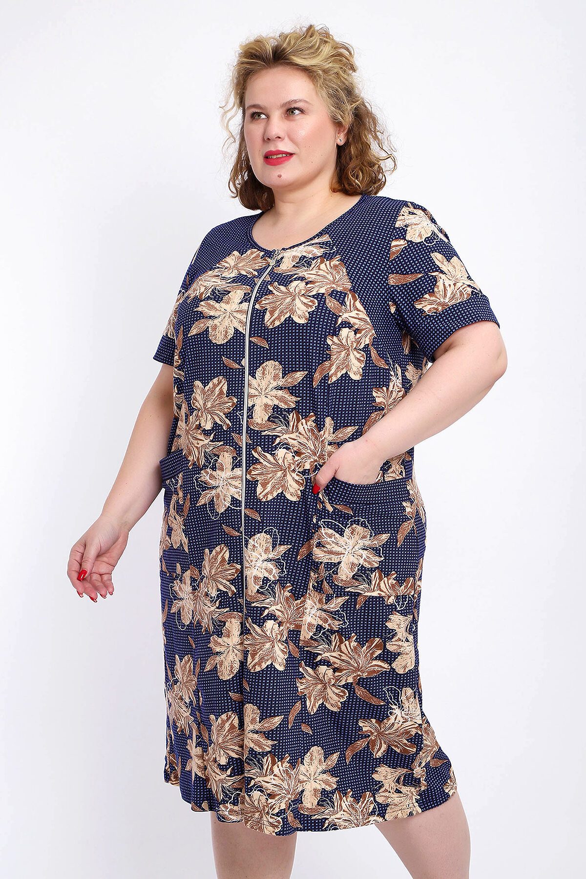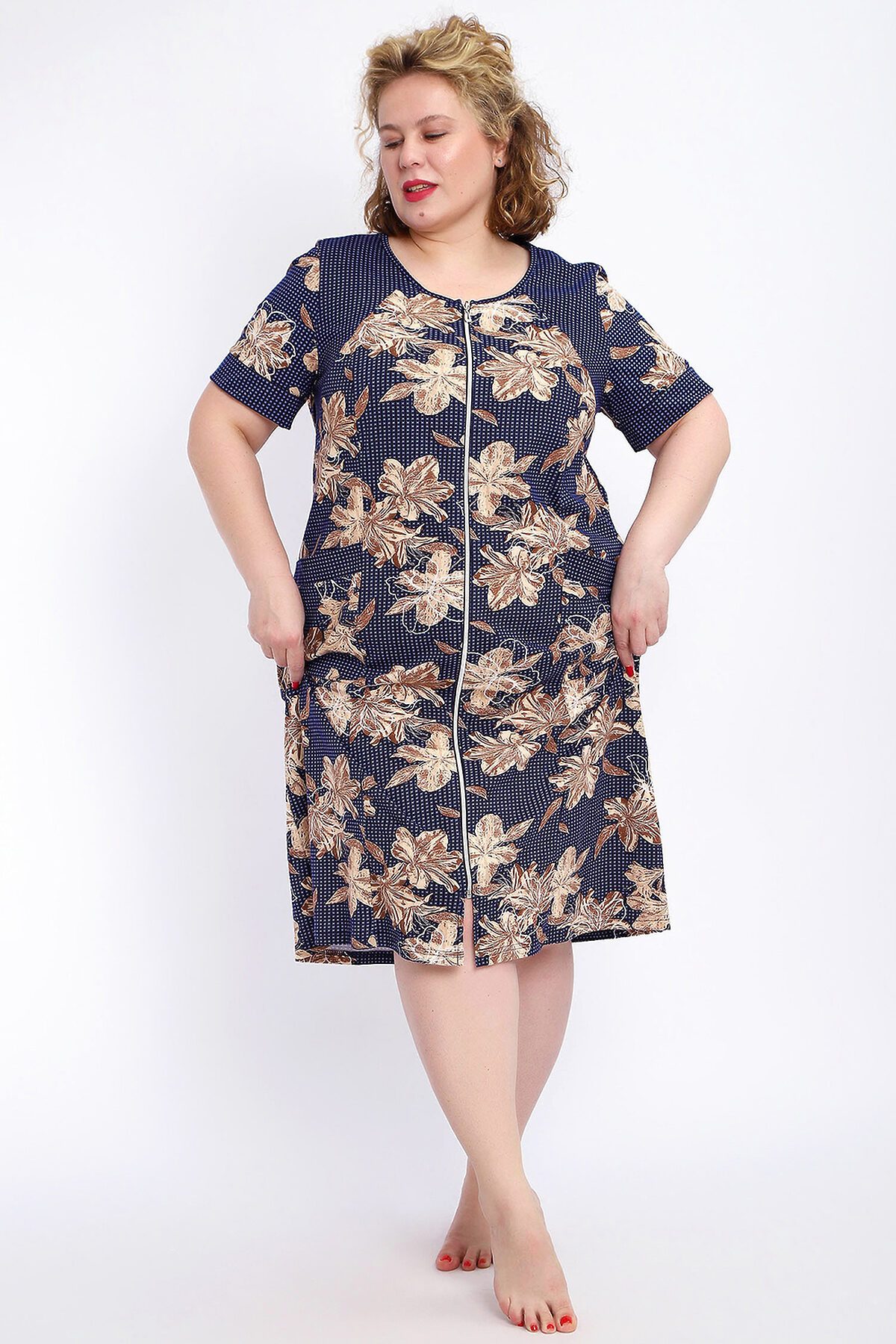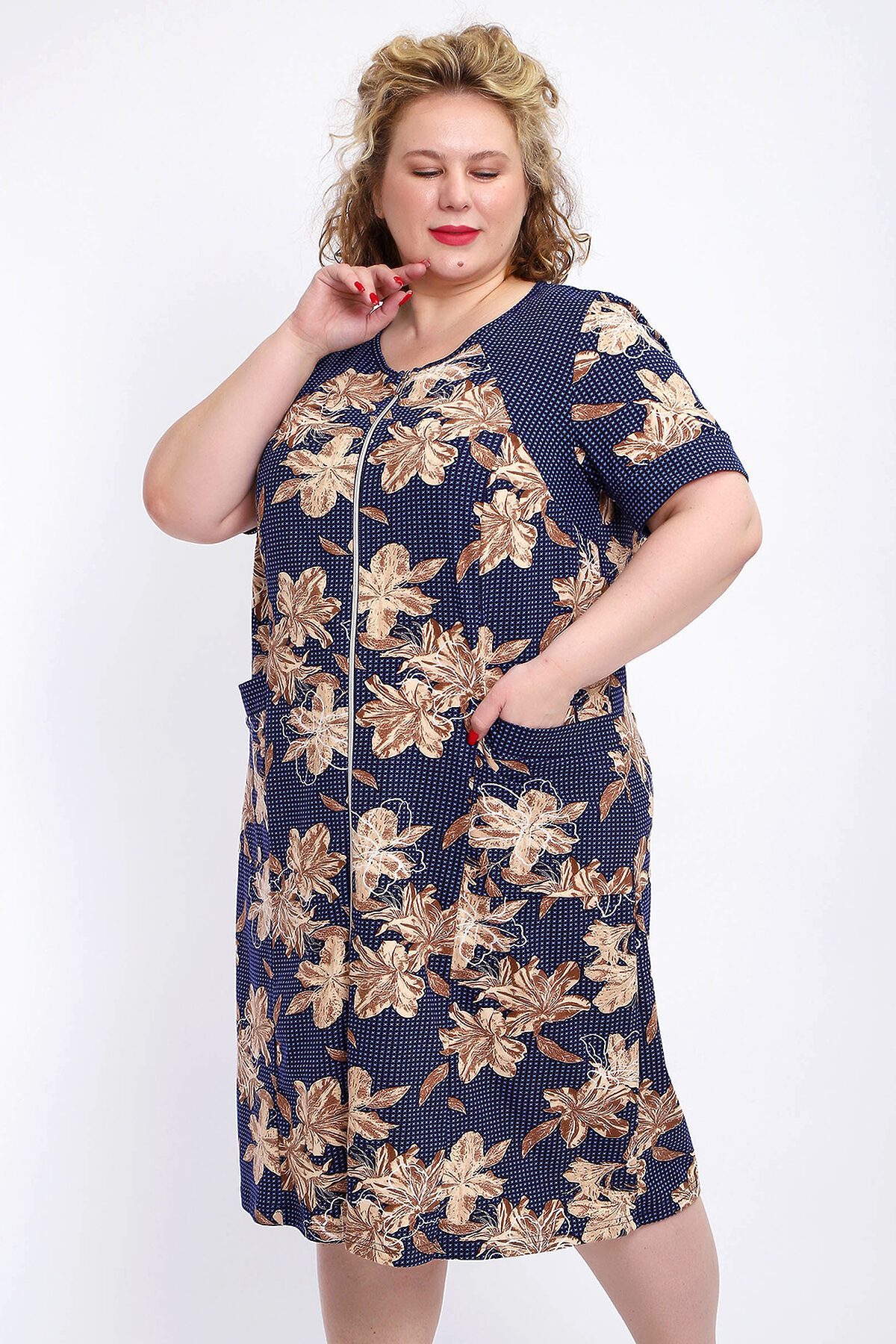 Ощутите домашний уют и комфорт - выбирайте халат женский домашний больших размеров из мягкой хлопковой ткани с очаровательным принтом. Халат на молнии является самой популярной моделью, обеспечивает удобство во время носки, не сковывает движений. Прямой свободный крой платья позволяет скрыть недостатки фигуры и ощущать легкость во время домашнего отдыха. Халат домашний дополнен накладными карманами и стильной круглой горловиной, которая оформлена декоративными планками. Длина платья универсальная, за колено. В наличии есть большие размеры, поэтому выбирайте такой халат в роддом. Изделие выглядит стильно и привлекательно за счет нежных светлых бутонов цветов на контрастном темном фоне. Женская домашняя одежда российского производства имеет идеальную посадку, не линяет, не дает усадку после стирки и долго сохраняет первоначальный внешний вид. Этот женский универсальный халат изготовлен из 100% хлопка, поэтому его можно хорошо использовать как банный халат. Для вашего удобства у халатика есть два боковых кармана, которые хорошо подходят для телефона или всяких мелочей. Размерная сетка включает в себя большие размеры ( до 74 размера). Халат трикотажный выполнен из 100% хлопка. Ткань не вызывает аллергии, не электризуется, хорошо держит форму, не деформируется при стирке. Мягкое трикотажное полотно отлично пропускает воздух, позволяет коже дышать, что актуально в самые жаркие летние дни. Благодаря универсальному крою халат в нежной расцветке подходит для покупательниц любого возраста и любого типа женской фигуры, скрывает недостатки и подчеркивает достоинства. Свободный силуэт позволяют носить его как домашнее платье, даря удобство и комфорт в течение всего дня. Домашний халат с рукавами отлично подойдет в подарок маме, бабушке или сестре на новый год, 8 марта или просто так порадовать.
